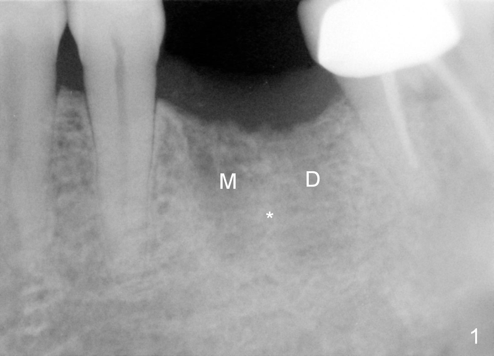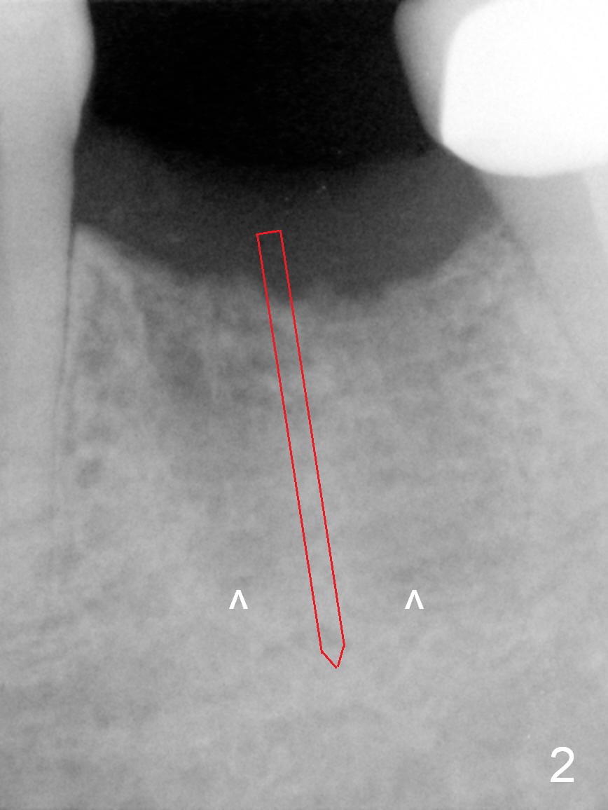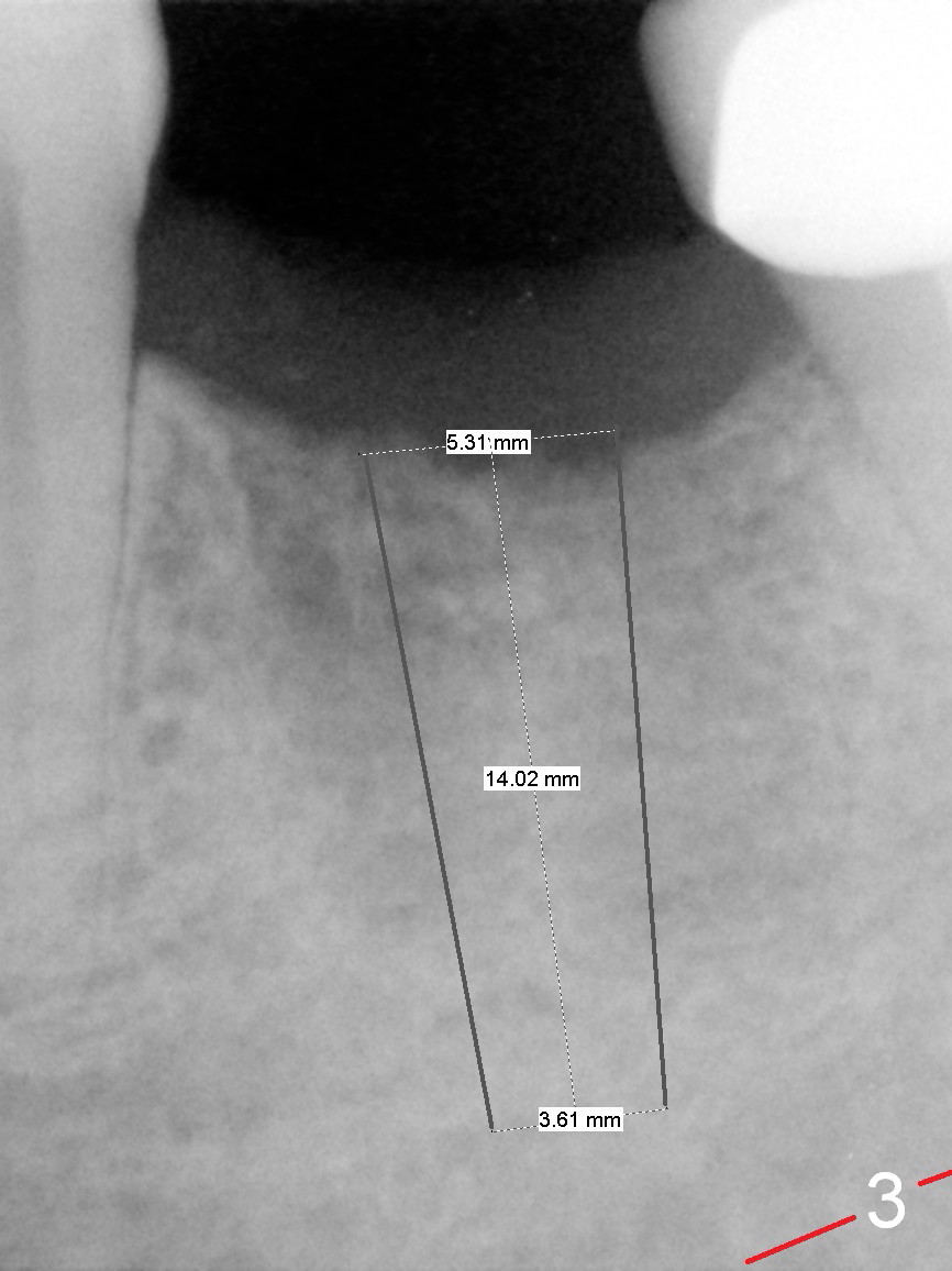 A 68-year-old man had the tooth #19 extracted more than 6 months ago (Fig.1). When his wife has had an immediate implant placed, he decides to have his implant placed. After incision, use the 5 mm implant positioner to check the width of the crestal bone. If it is less than 6 mm, the implant length will be most likely 14 mm. Clinical exam has revealed moderate ridge atrophy. Anyway, the initial osteotomy is 12 mm. It should pass the apices of the mesial (M) and distal (D) sockets (Fig.2 ^) in the middle of the septum (as compared to Fig.1 S). If there is enough safety margin, the osteotomy depth will be set at 14 mm (Fig.3 (red dashed line: the superior border of the Inferior Alveolar Canal)). There is no indication for intraop localized use of antibiotic.