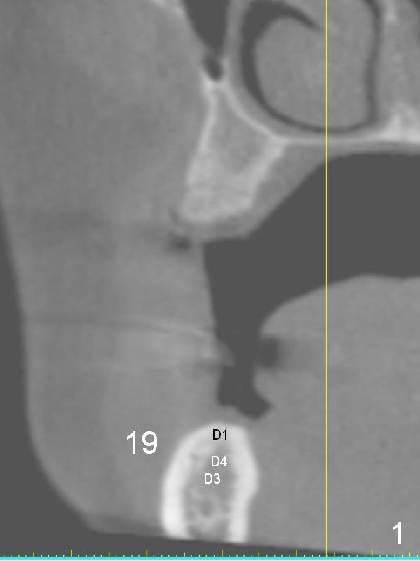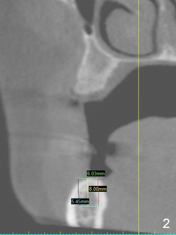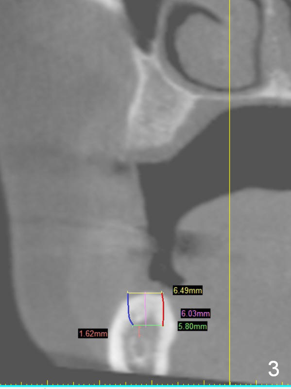 A 49-year-old lady is petit. The crest at #30 is narrow. A small implant is placed. To increase its longevity, the patient should have left 1st molar occlusion. Bone density at #19 is D1 (the cortex), D4 (upper medulla) and D3 (lower medulla) (Fig.1). Bone is wide enough to hold a 6 mm (in diameter) implant, but a 8 mm long implant appears to be too long (Fig.2). Therefore, a 6 or 6.5x6 mm implant appears to be appropriate (Fig.3). How about the bone at #14?