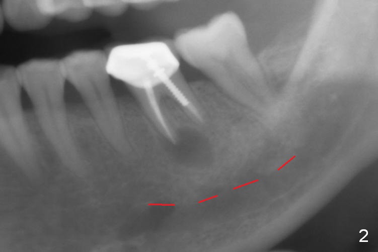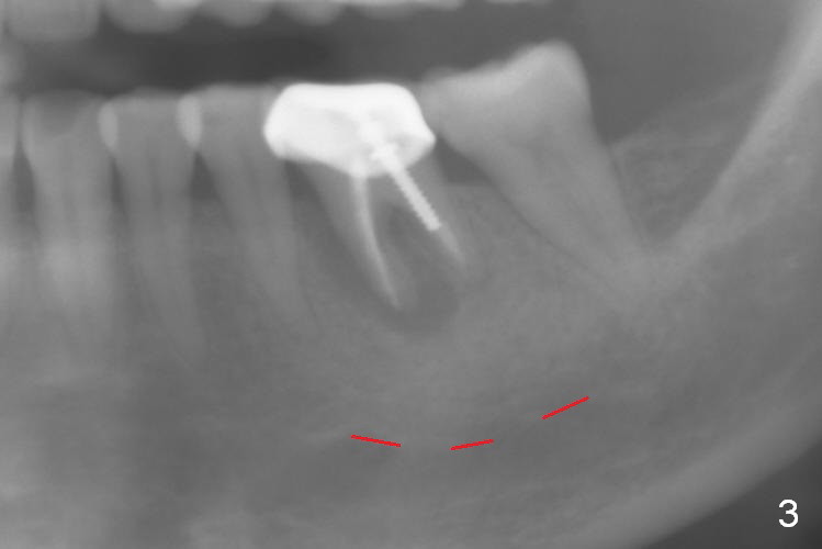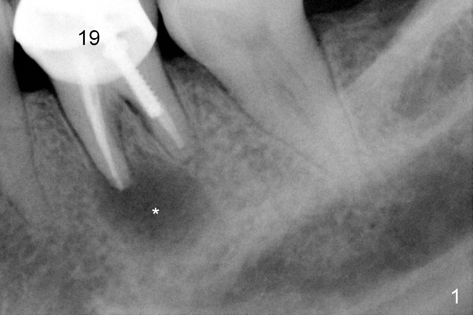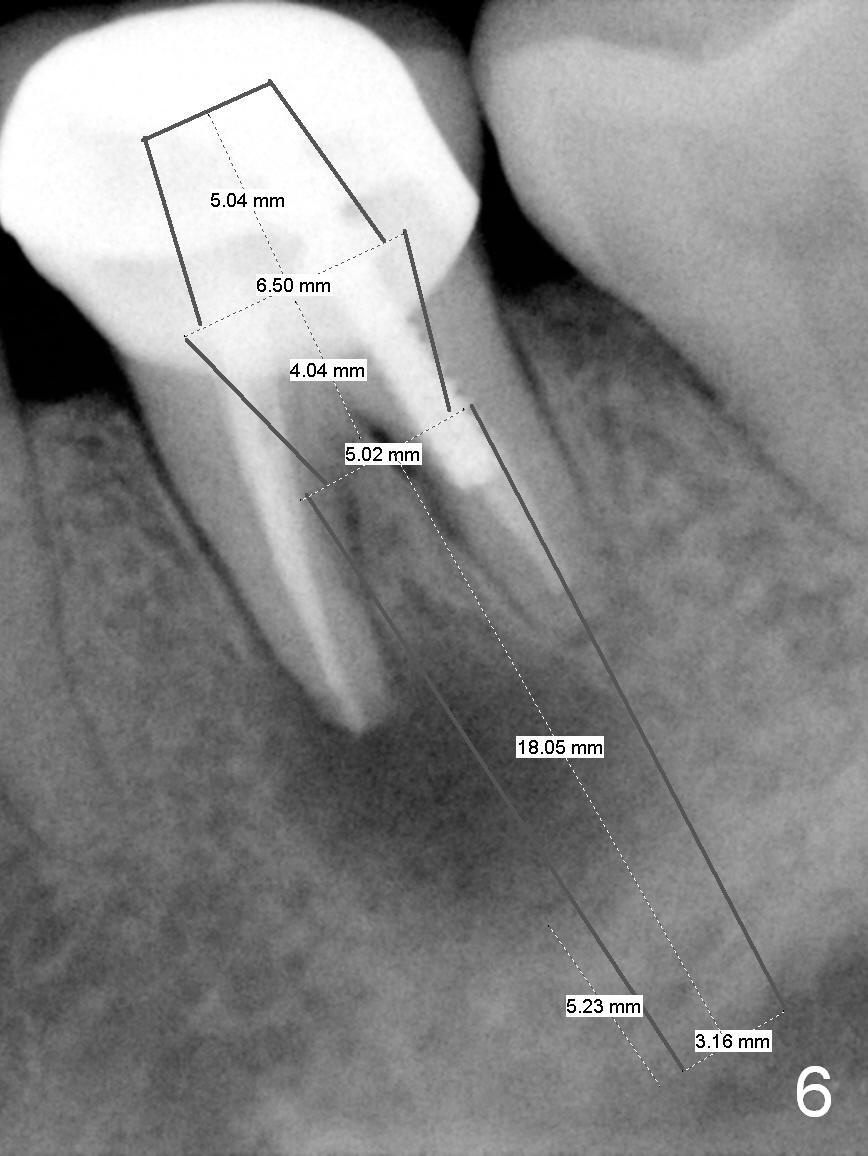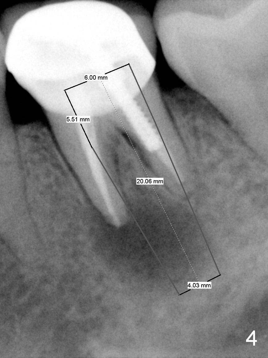 A 58-year-old lady has a long-standing periapical lesion with several episodes of acute infection (Fig.1-3, taken 10, 9 and 2 years ago, respectively). Explore the socket for size and wall integrity (Clindamycin). If the bony defect is not extensive, place a longest implant (18 mm bone-level, 20 mm tissue-level) with moderate diameter (5.5, 6 mm). Otherwise use a shorter, but wider tapered implant (7x12 mm (bone-level), 7 or 8x17 mm (tissue-level)). If the socket is extremely large, consider using 7 or 8 x20 mm cylindrical tissue-level implant. Use Bicon 2 mm pilot drill with extension to measure the socket depth and obtain 3-6 mm new bone or until 20 mm (gingival margin). Take PA. The 1st option is to use UF 3-4.7x18 mm drills at 50 RPM. Make sure that the depth is reached (septum crestal level) and check osteotomy wall integrity after each drill. Then place a 5 or 5.5x16 or 18 mm implant (Fig.6). The 2nd and 3rd options are shown in Fig.4 and 5. Due to severe infection and pain, a shorter implant is placed.
