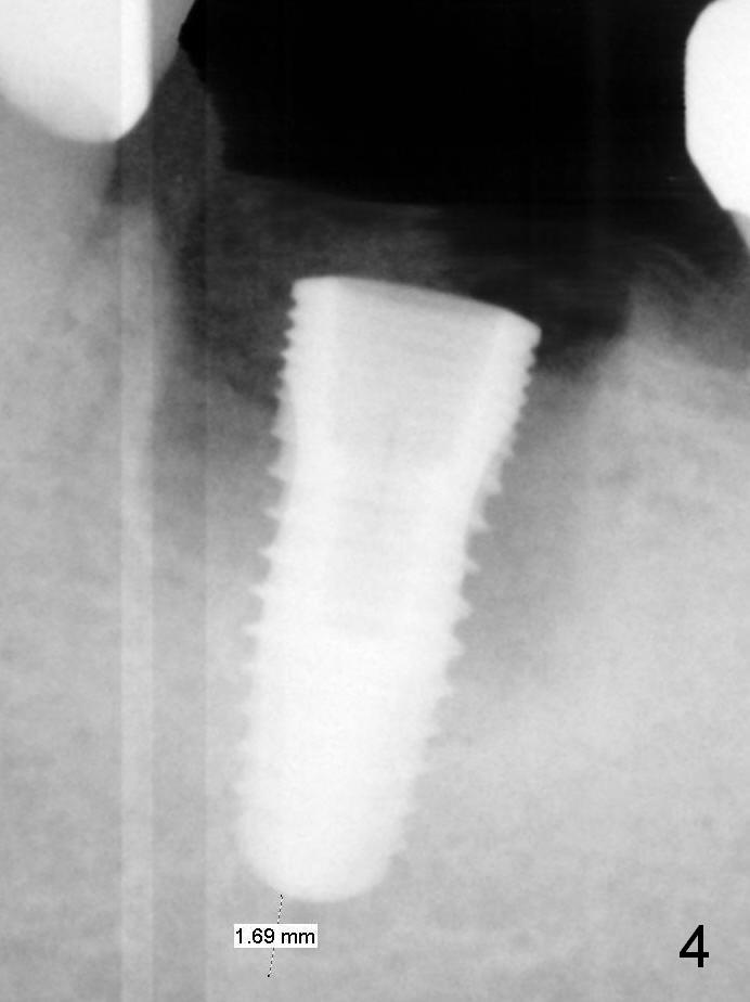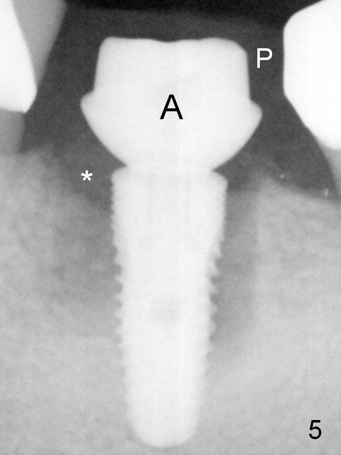 When a 5x12 mm bone-level implant is placed (Fig.4), there is a gap mesiobuccally, which is later filled with bone graft (Fig.5 *). A large abutment (7.8x4(3) mm) is placed immediately (Fig.5 A) for an immediate provisional (P) to close the sockets.