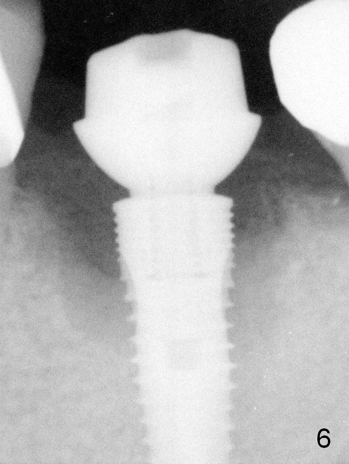 As expected, the lingual margin of the abutment is suprgingival 2 months postop. The immediate provisional is fractured (Fig.6).