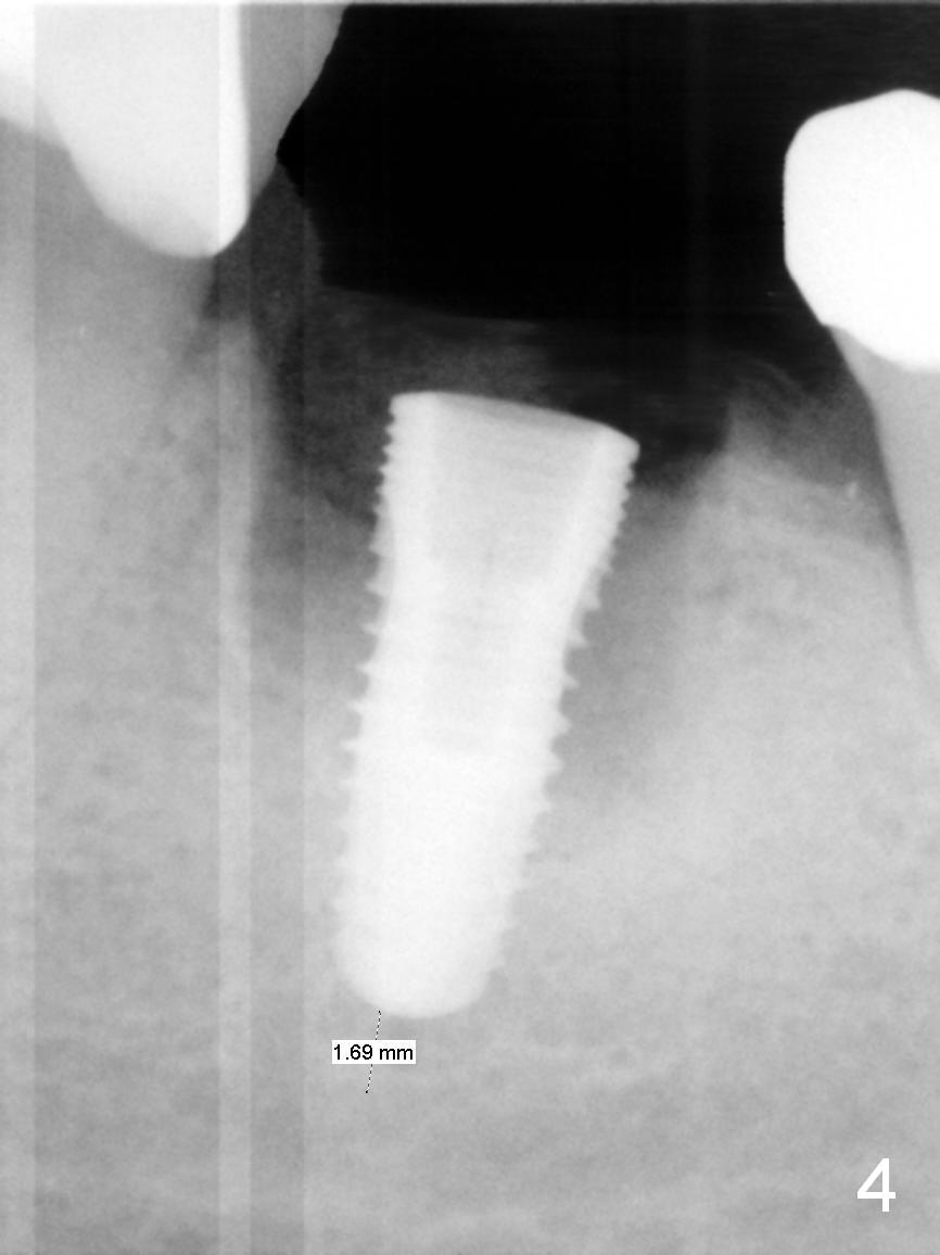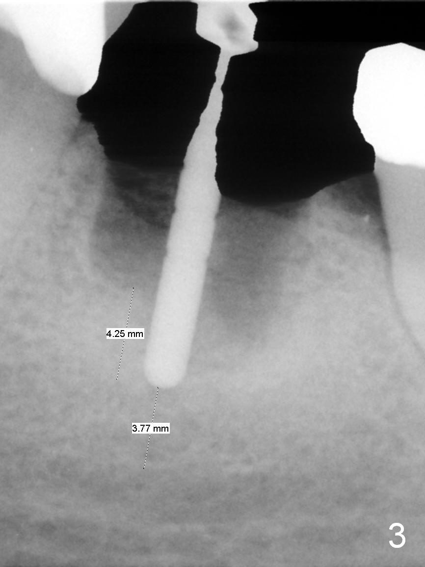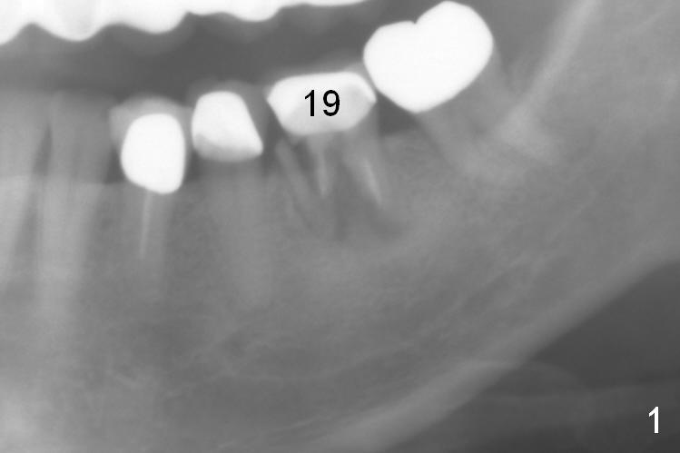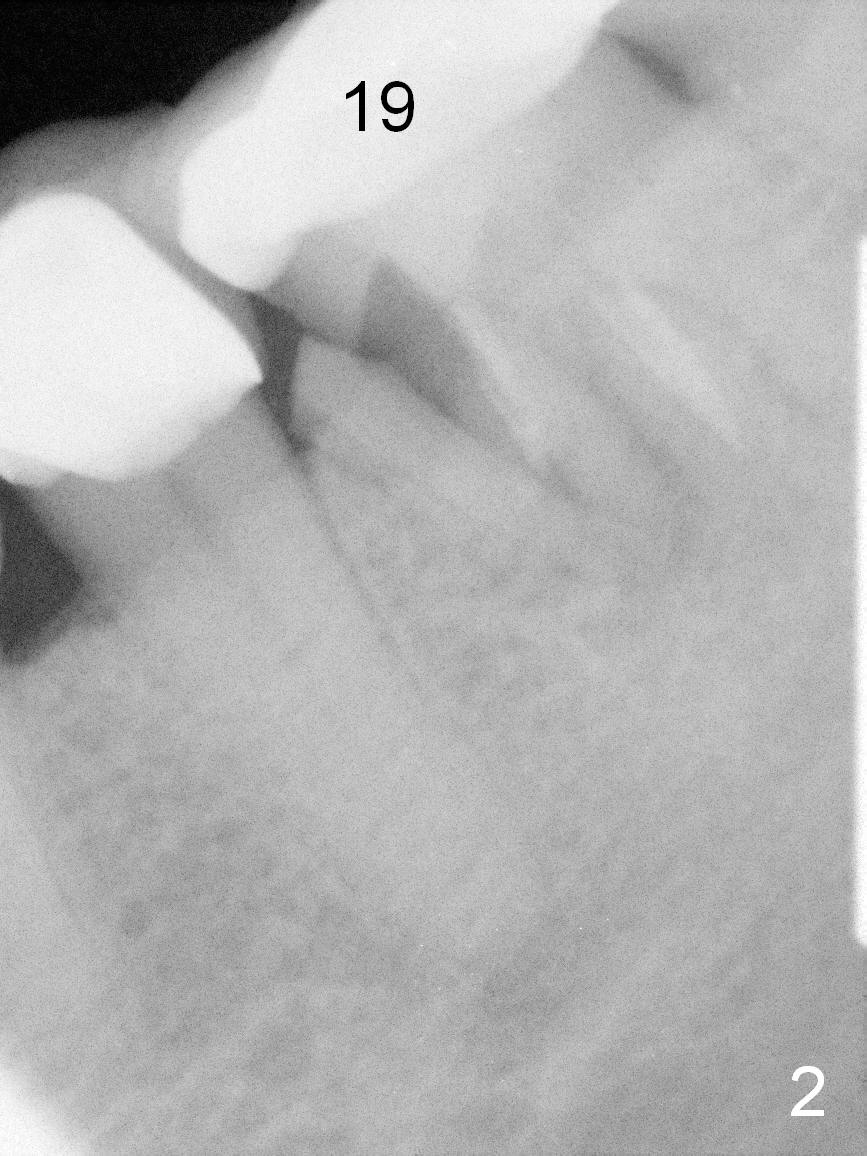 A 56-year-old lady (YW) has diabetes II, fairly well controlled. Although there is radiologic evidence of mesial root fracture of the tooth #19 (Fig.1 (panoramus)), she is asymptomatic. The buccal gingiva is slightly erythematous and edematous. There is no deep pocket. According to Fig.1, either the buccal or lingual wall is lost. This is not evident from Fig.2 (PA). Osteotomy is established in the septum or the distal socket (treated with Clindamycin), away from the lost plate (Fig.6,7). It is estimated that there is 4-5 mm apical bone. Measure the depth of the socket. Osteotomy should be 3 mm beyond the socket.