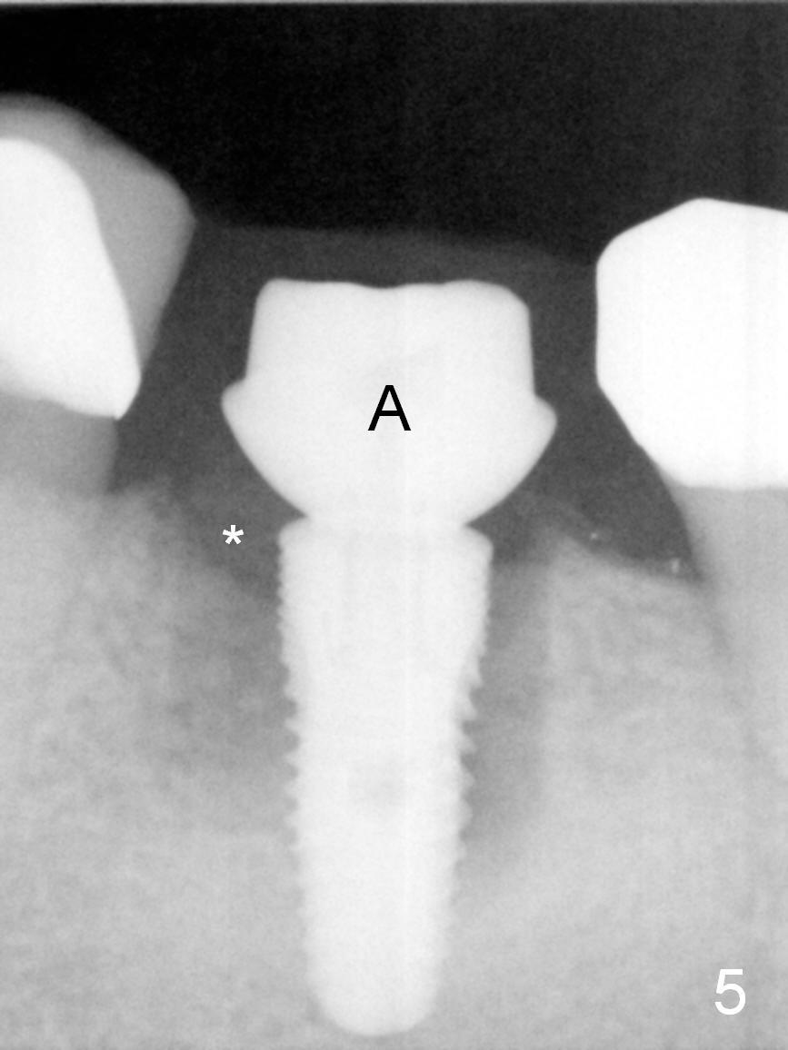 In fact, the buccal plate and the septum are defective. Osteotomy is initiated lingual to the center of the common sockets (Fig.1); depth is about 4 mm. When a 5x12 mm bone-level implant is placed (Fig.4), there is a gap mesiobuccally, which is later filled with bone graft (Fig.5 *). A large abutment (7.8x4(3) mm) is placed immediately (Fig.5 A) for an immediate provisional to close the sockets. The buccal abutment margin is ~ 1 mm subgingival, whereas the lingual ~2 mm supragingival. The abutment may need to be changed in the restorative phase (Fig.9,10).