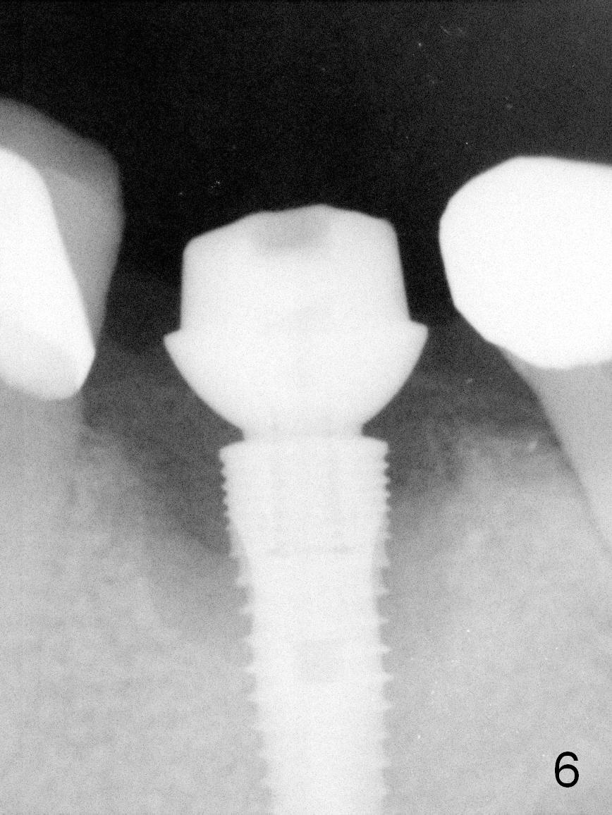 As expected, the lingual margin of the abutment is supragingival 2 months postop. The immediate provisional is fractured (Fig.6). The abutment is changed to 5.8x4(2) mm and impression is taken.