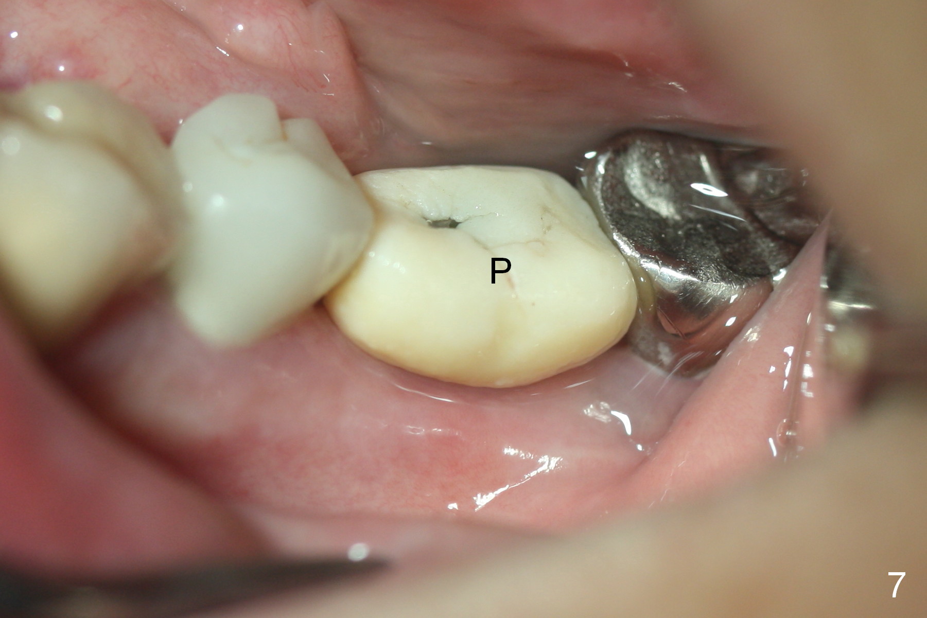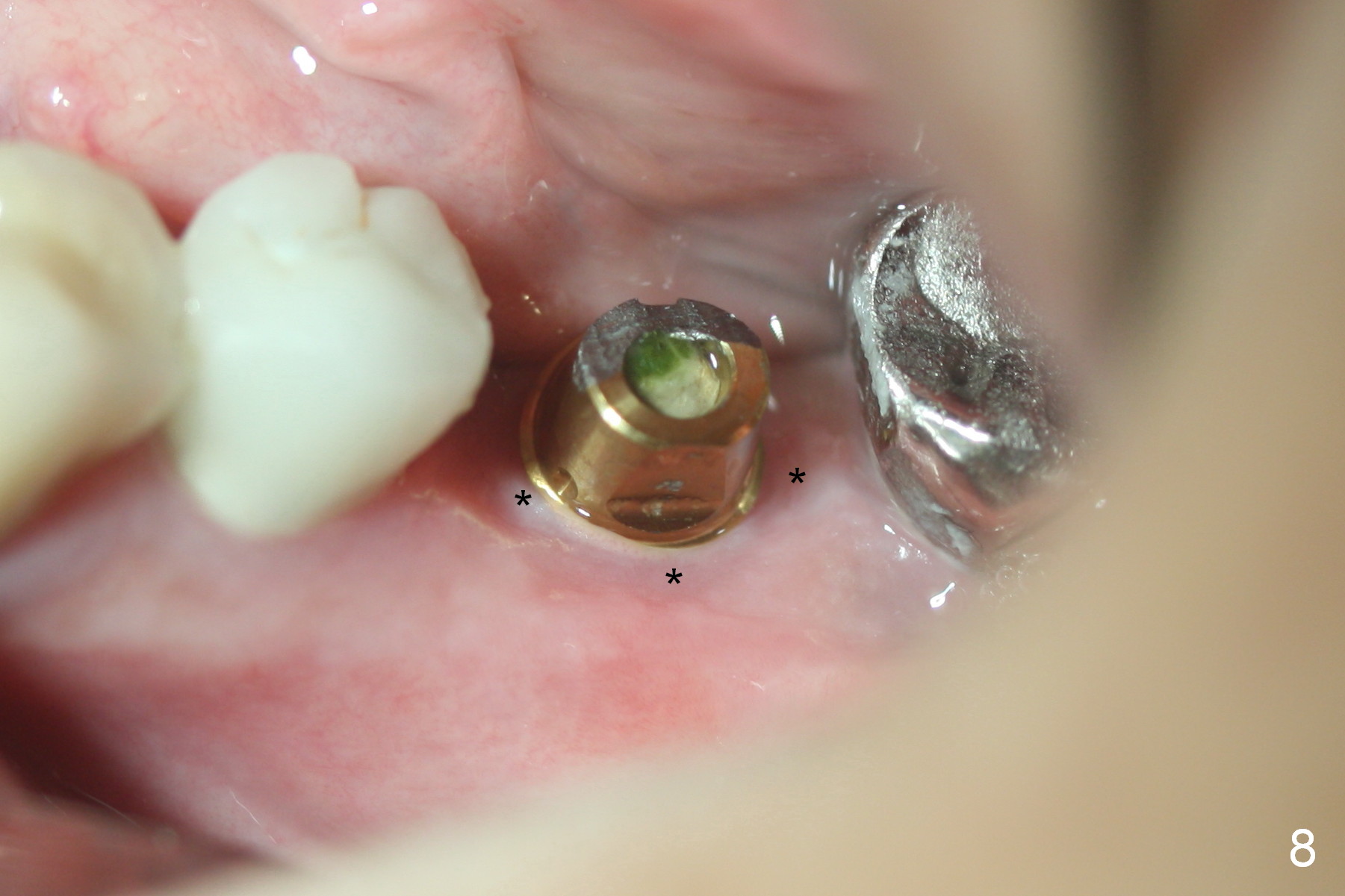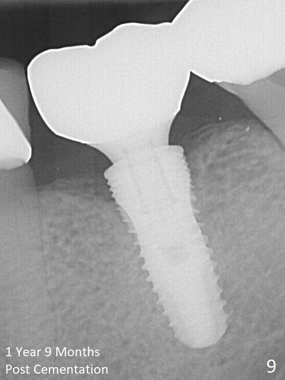 Two months post impression (4 months postop), the patient returns for cementation. The provisional is perforated again in the occlusal surface (Fig.7 P). When the provisional is removed, a shallow trough forms around the abutment (Fig.8*). The bony defect appears to be repaired 1 year 9 months post cementation (Fig.9).