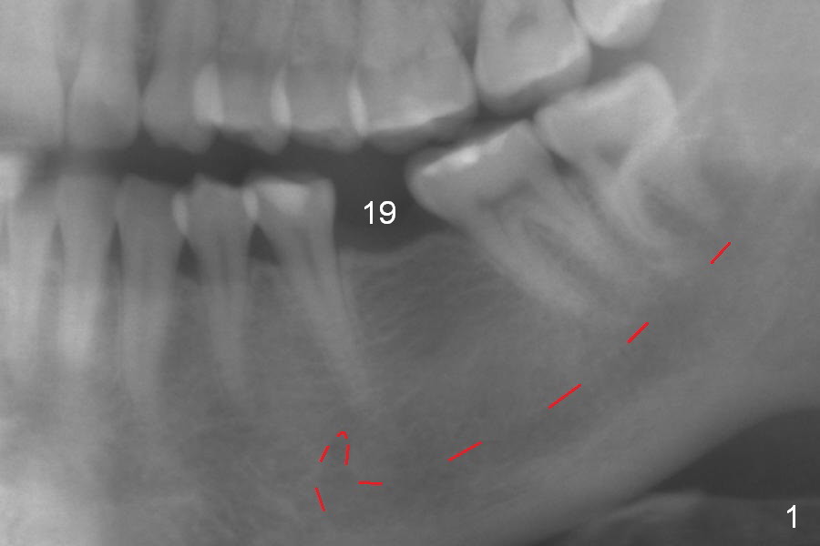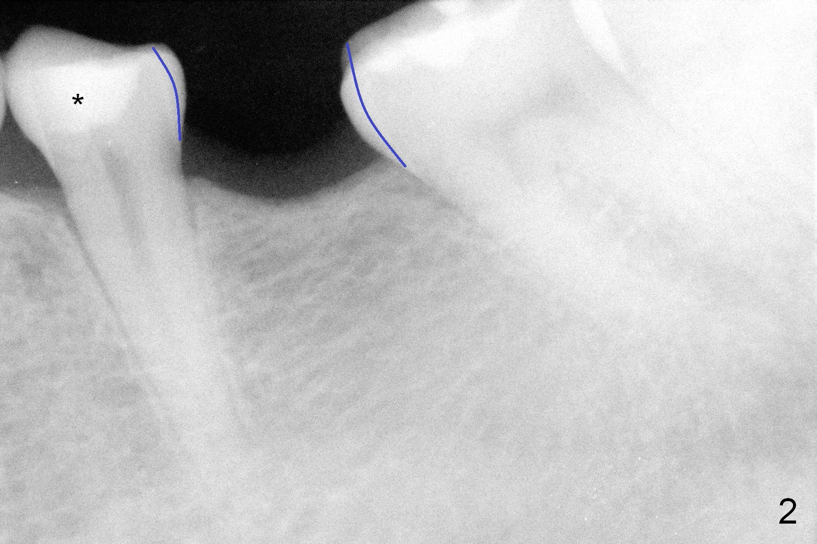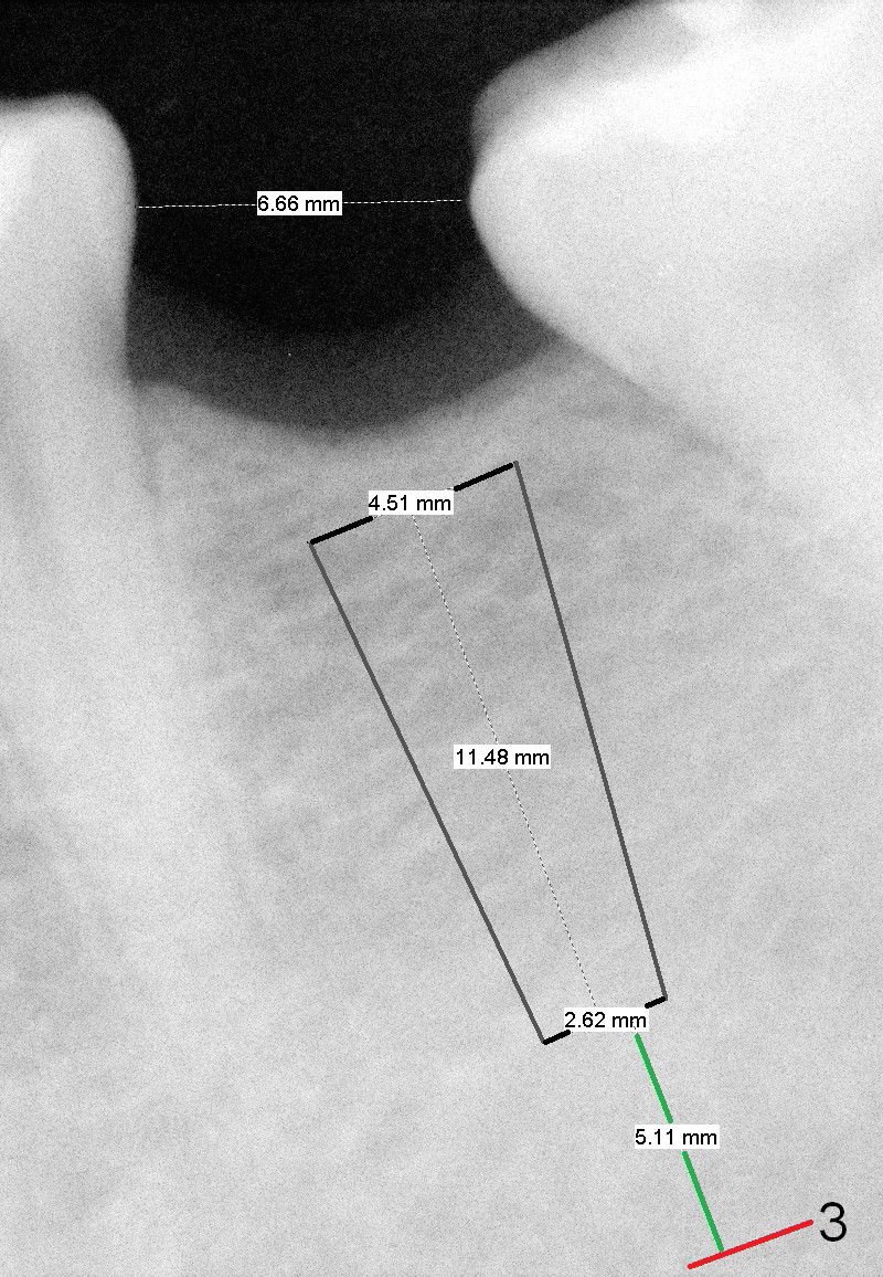 A 31-year-old woman agrees to have implant at #19 (Fig.1) after redoing MOL composite at #20 (Fig.2 *). The edentulous mesiodistal space is narrow (~ 6 mm in Fig.3). If the buccolingual bone width is found to be good after incision, a large implant is preferred. To gain space mesiodistally, the proximal surfaces of the neighboring teeth will be reduced (Fig.2 blue curved lines).