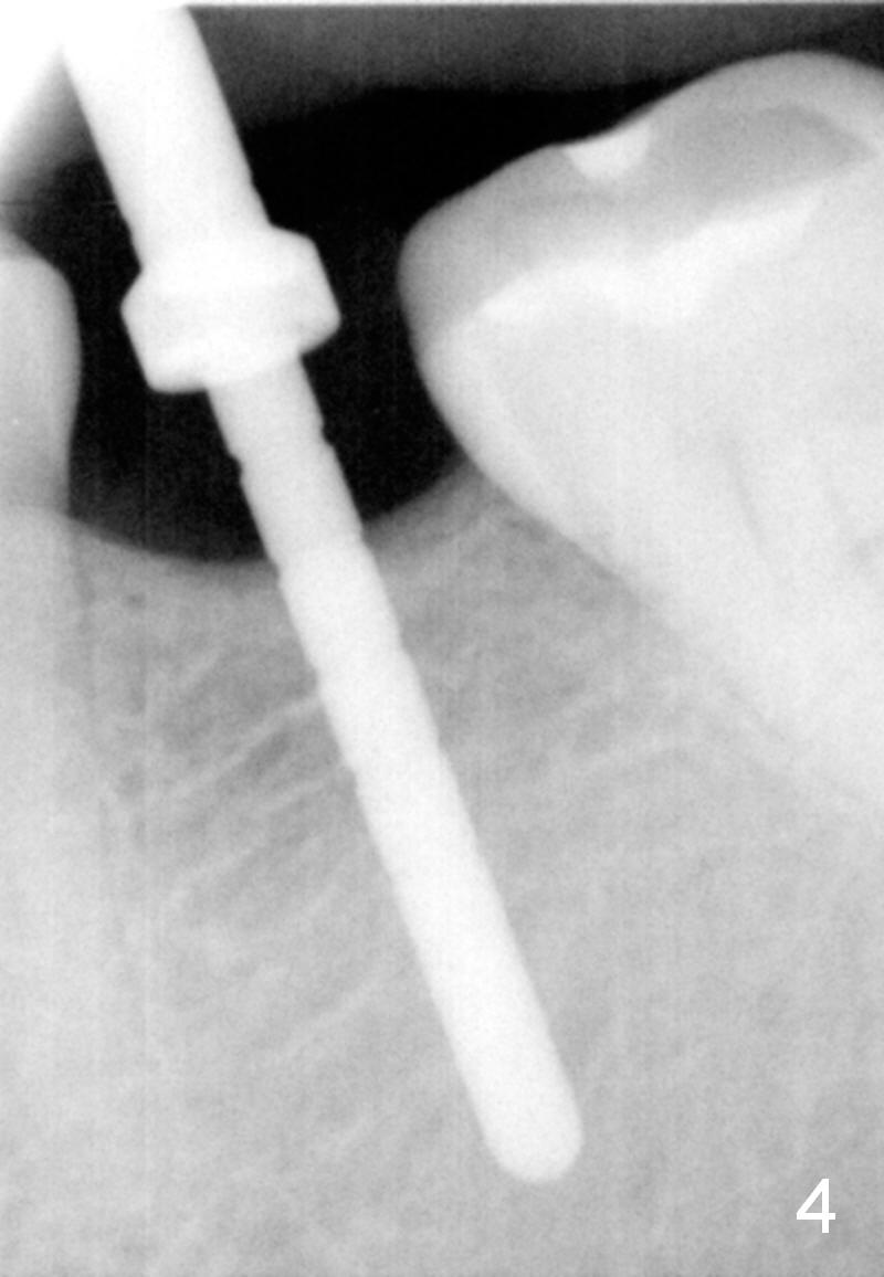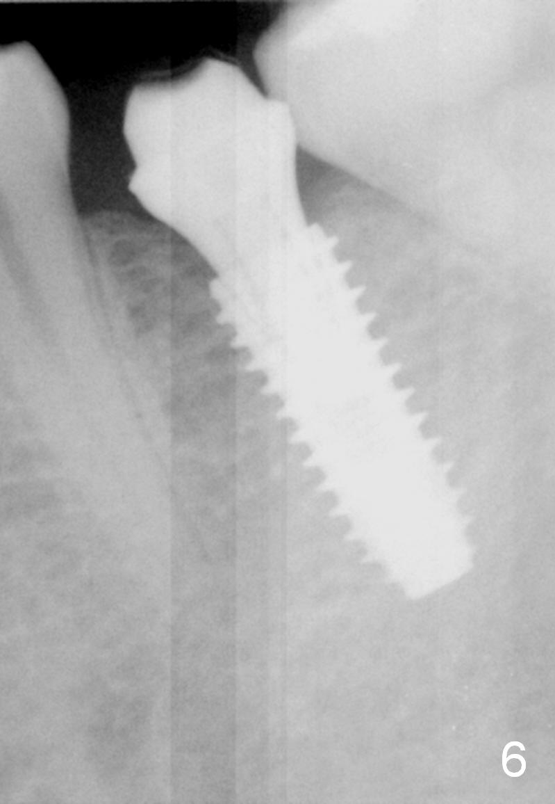 In fact, the buccolingual width of the ridge is sufficient to have a 4.5x11.5 mm implant placed (Fig.4,5, D3 bone, <35 Ncm). Proximal reduction is done before and after placement of a 5.5x4(3) mm abutment. Heavy abutment height adjustment is provided as well as the opposing prior to immediate provisional.