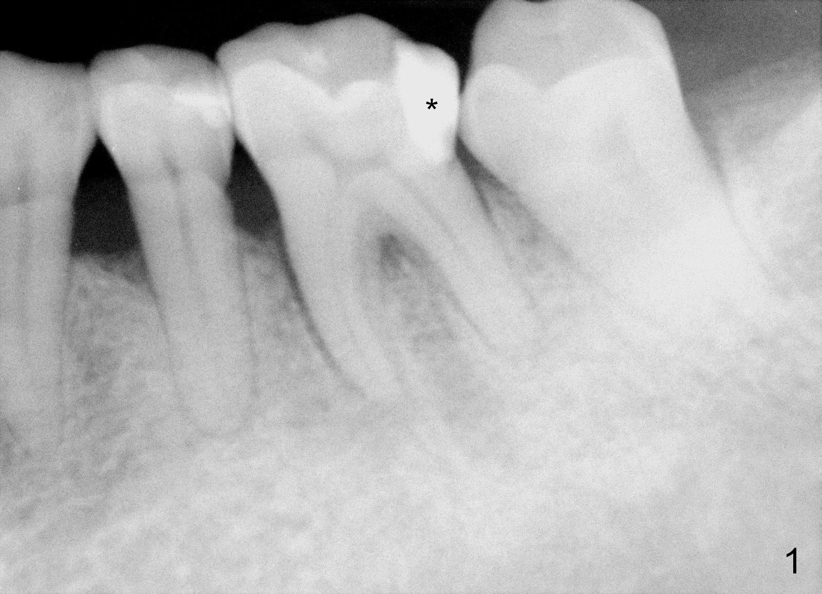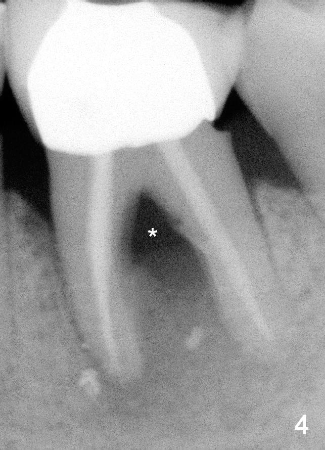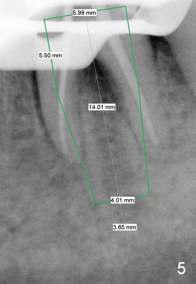 A 59-year-old lady has history of periodontal disease and bruxism. The tooth #19 has pulpitis after unsuccessful DO composite (Fig.1 *) and requires root canal therapy (Fig.2). Six months later, a fistula is found to communicate with the furca (Fig.3 *: gutta percha). Less than 3 years, the furca enlarges with symptoms of infection (Fig.4 *). She works out of state. The Principle of No Implant, No Extraction is adhered. Since she is of short statue, the bone height is relatively limited. A 6x14 mm tissue-level implant is appropriate (Fig.5, one piece). Sensor 1 may be proper for her small mouth. When the bottom of the socket is large and close to the Inferior Alveolar Nerve, can an immediate implant be placed?