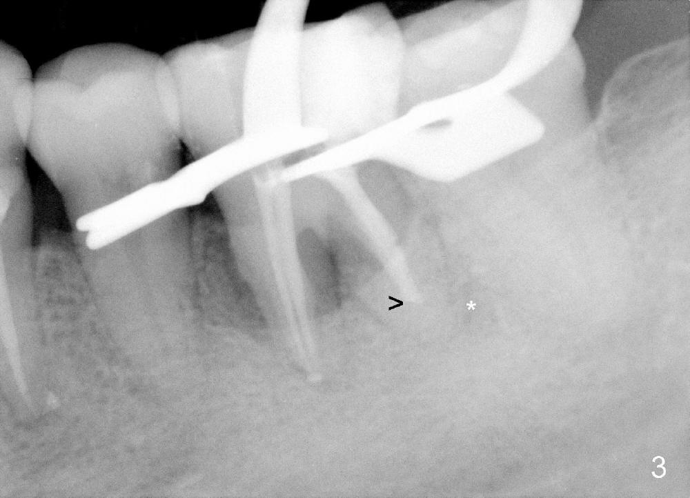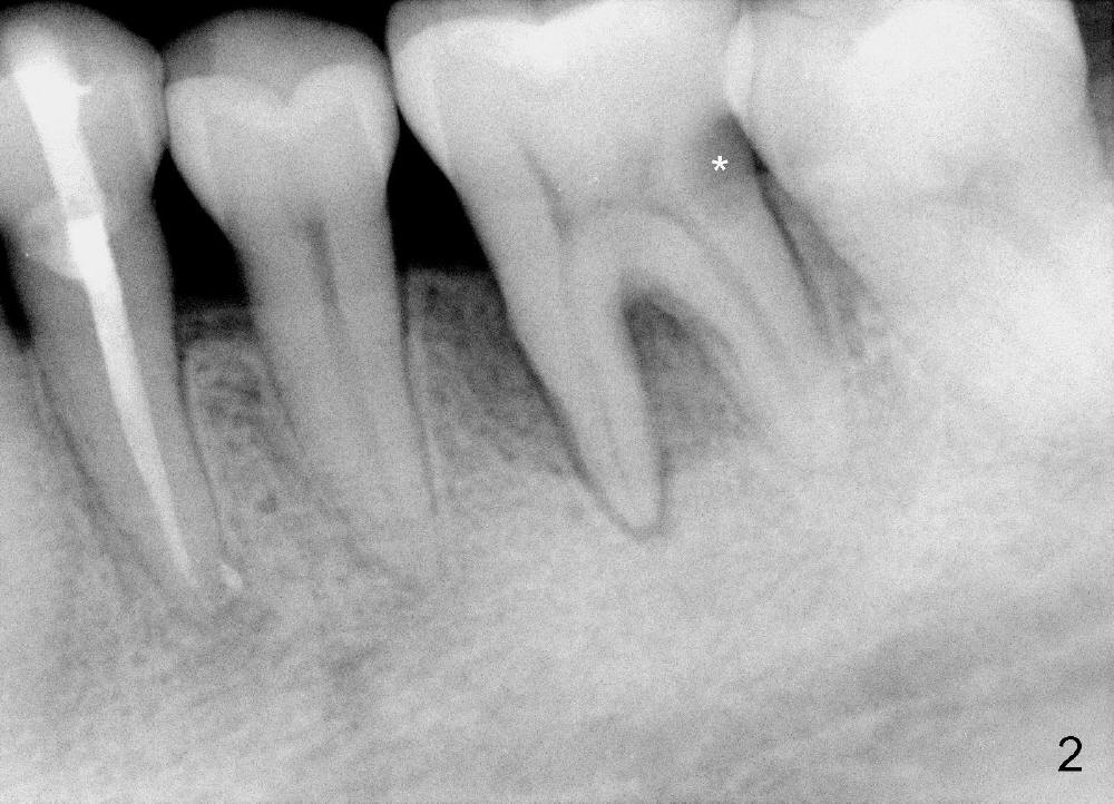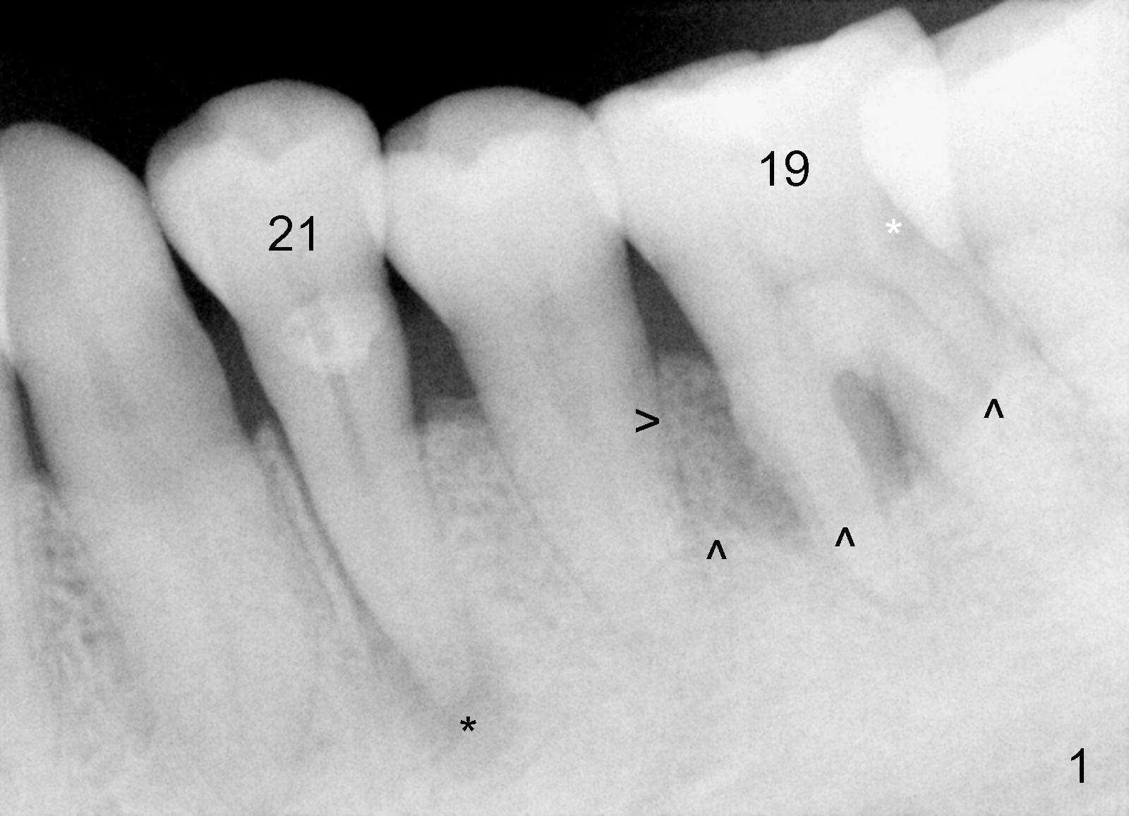 A 48-year-old lady has poor dentition. Four years and a half ago when the tooth #21 needed root canal therapy (RCT), the tooth #19 showed bone loss (Fig.1 arrowheads) and hidden caries (white *). The carious lesion caused severe toothache 2 years later (Fig.2 *), while the perio lesion remain severe. The tooth #19 received RCT; the patient remained asymptomatic until recently. Since the patient is satisfied with immediate implant with the tooth #2 (mainly perio lesion), she is not hesitant in accepting the same mode of treatment for #19.