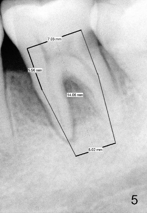 Considering severe bone resorption, a 6.9x10 mm bone-level (Fig.4) or 7x14 mm gingiva-level (Fig.5) implant does not seem to be long enough to achieve primary stability. Probably a 7x17 mm gingiva-level implant is more appropriate, but it carries more risk of nerve injury. Be careful. Take several intraop PAs for depth confirmation. Try shorter osteotomy and implant first and use longer one if necessary.