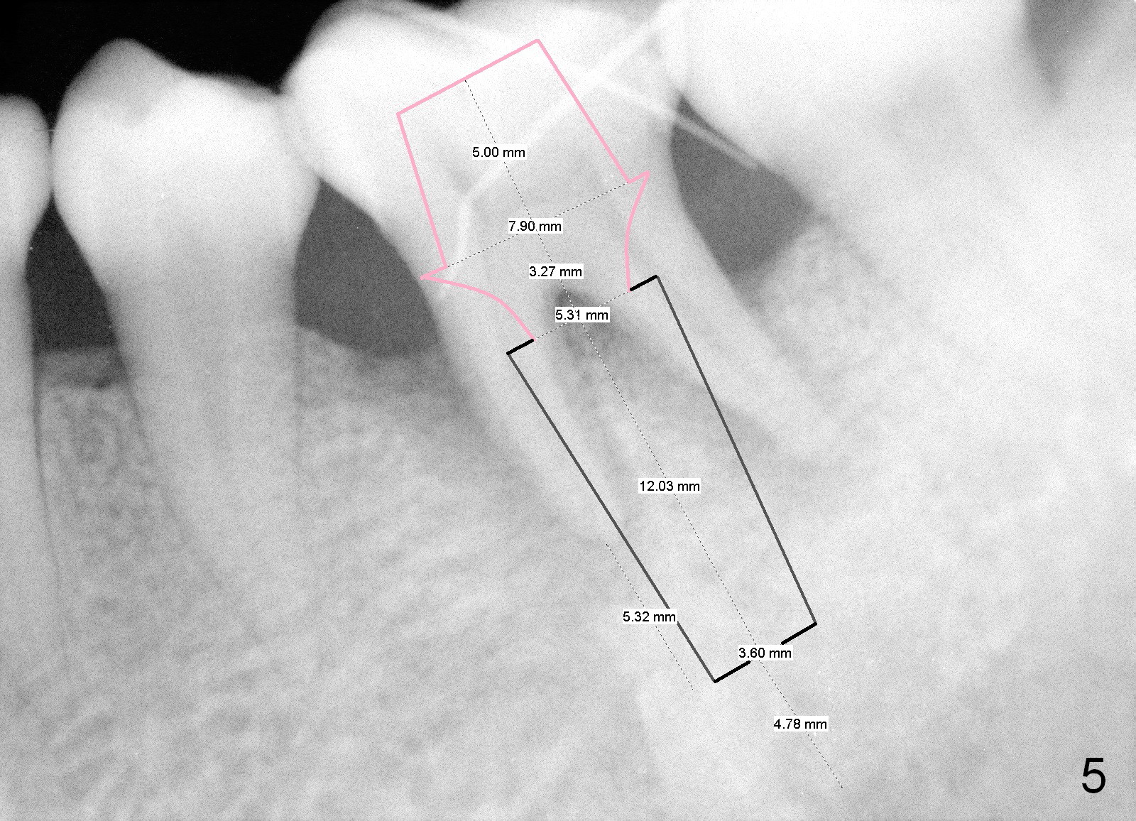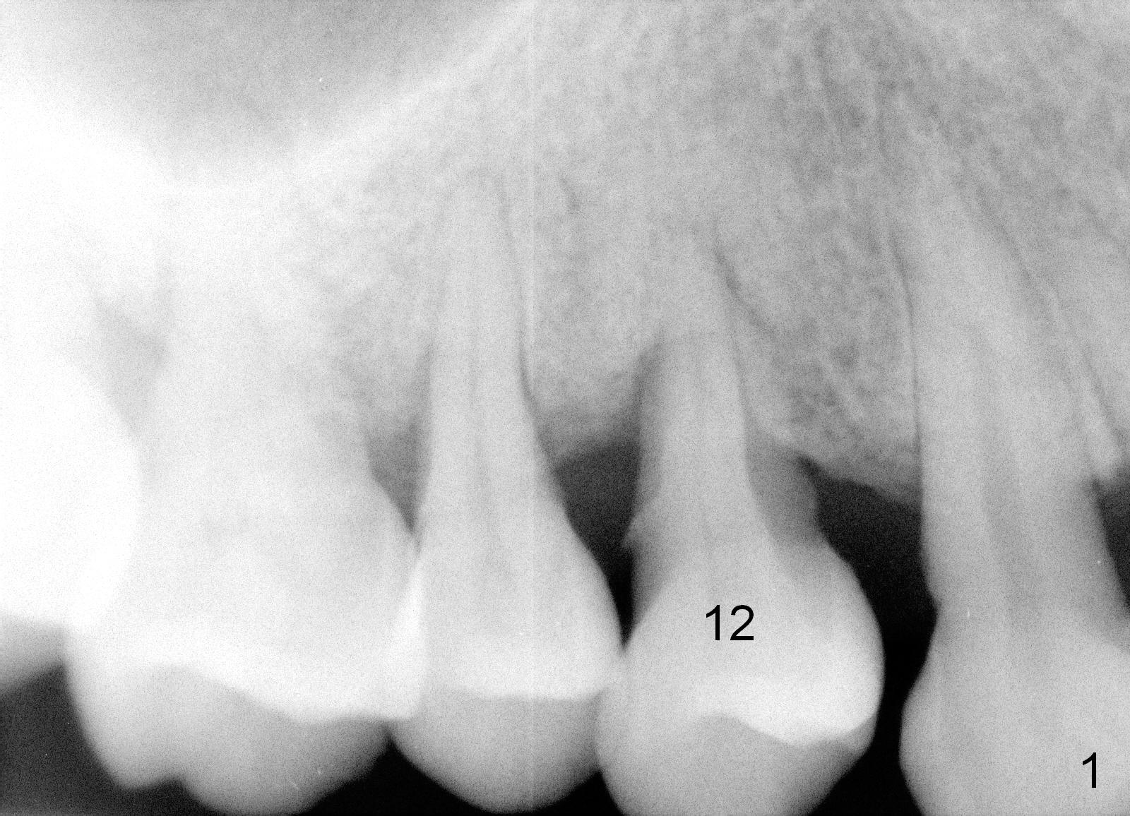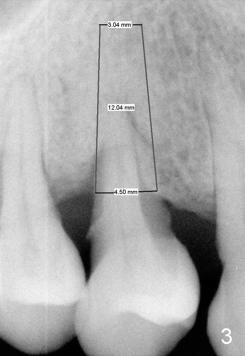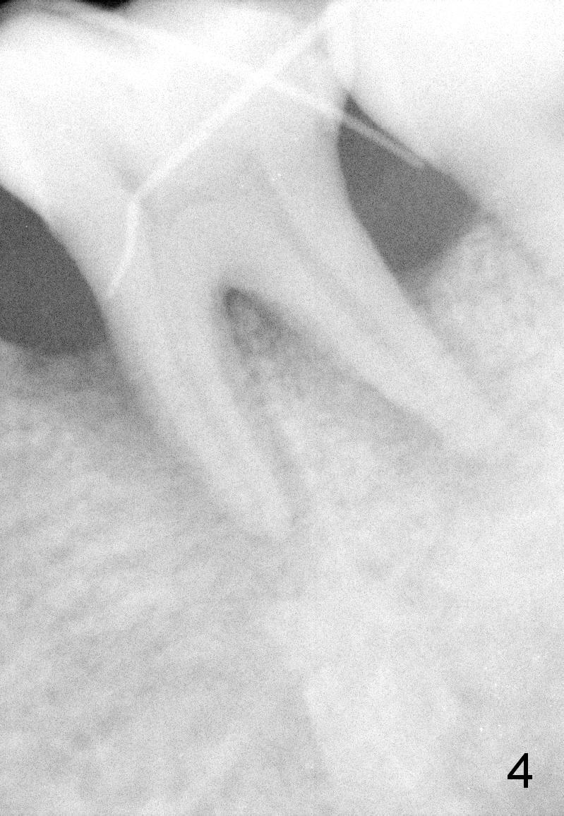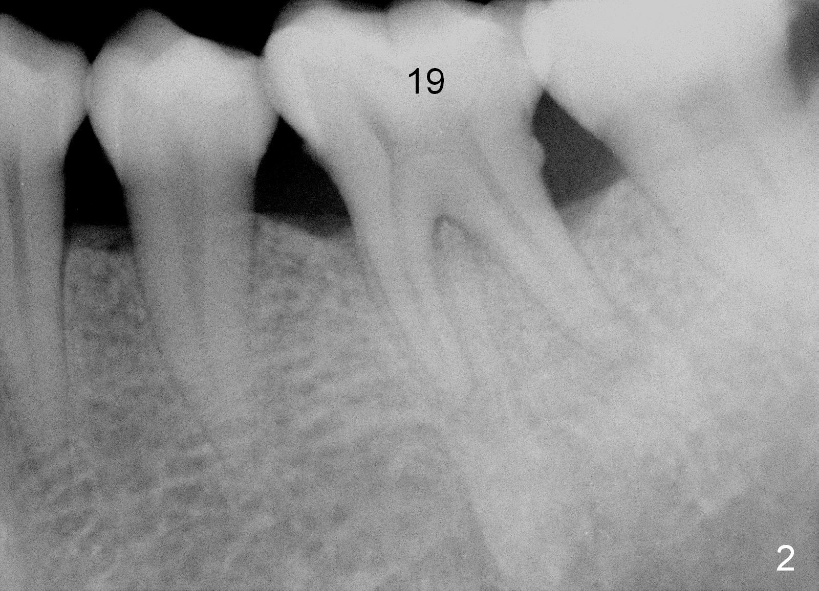 A 43-year-old lady has generalized moderate localized advanced chronic periodontits (Fig.1,2). In spite of 4 quadrant scaling & root planing, the tooth #19 develops 2 perio abscesses (Fig.4 with insertion of 2 guttae perchae); periodontal ligament spaces increases (compare Fig.2,4). It appears that the tooth is non salvageable and should be replaced with an immediate implant (Fig.5). The extraction socket will be treated with Metronidazole. A 2 mm pilot drill is used to start osteotomy in the septum (14 mm deep), followed by reamers until 3.5 mm. A 5x17 mm tap is placed to test stability. If the stability is high, place a 5.3x12 mm SM implant. If insertion torque is too high, use the corresponding drill before re-place the implant. Collagen dressing is placed in the peripheral and deep portion of the sockets, while bone graft in the top portion of the sockets (near implant threads). Use 1 or 2 amalgam carriers to deliver the graft lateral to the implant precisely so that a cover screw does not have to be placed. Next place a cemented abutment. If trajectory of the implant is correct, an abutment as large as 7.8x5(3) mm could be used (pink). Fabricate an immediate provisional. Do not over trim the margin of the provisional so that it can cover the socket completely.