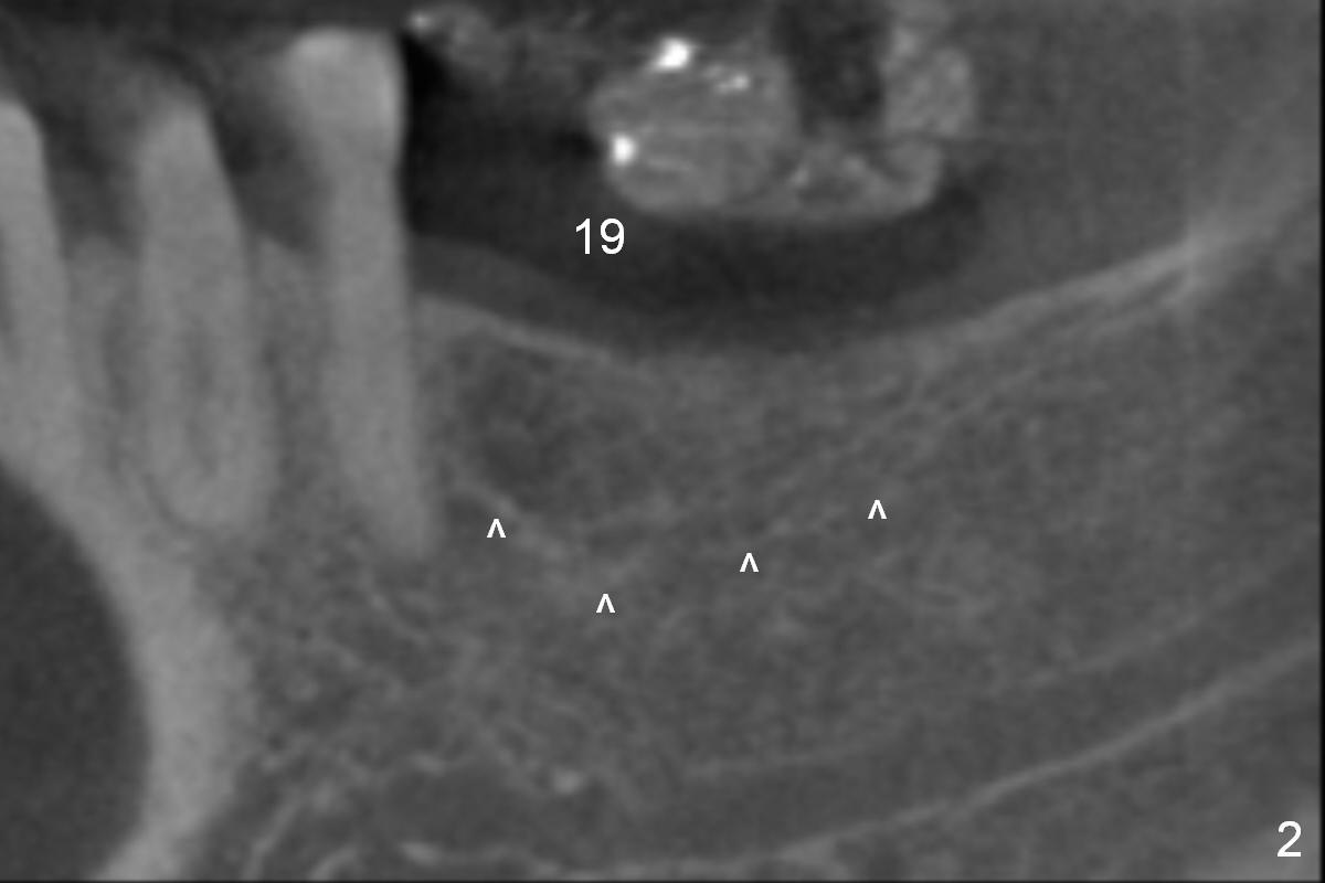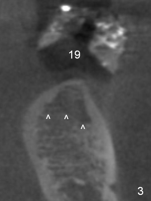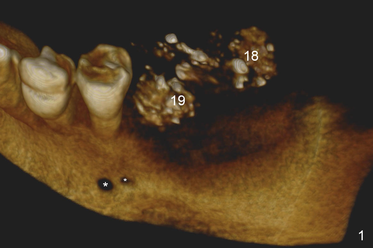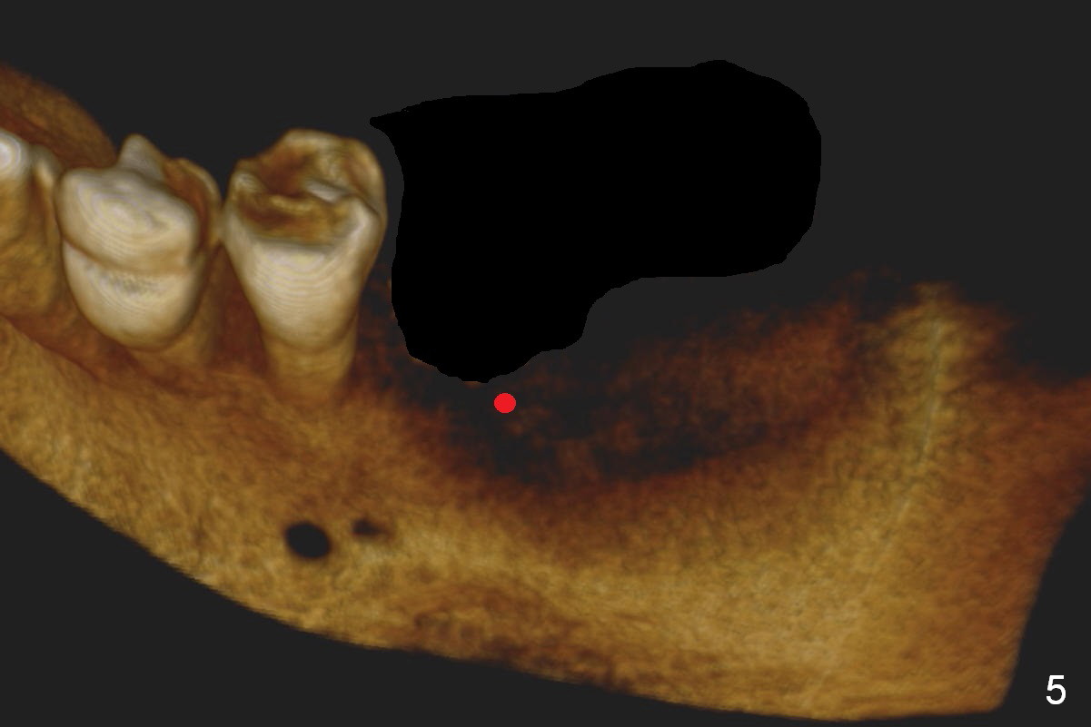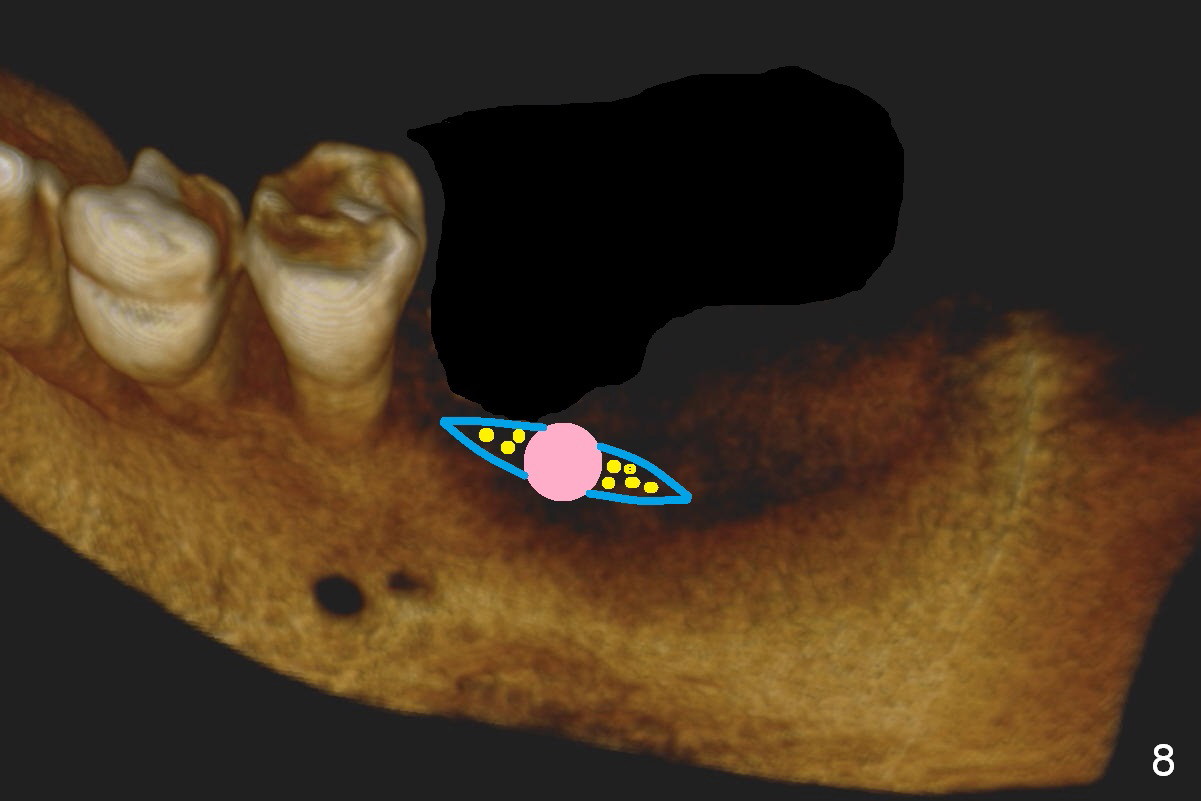 CBCT 3-D image taken with scan stents at the sites of #18 and 19 shows 2 Mental Foramina (Fig.1 *) in the left mandible. Both sagittal (Fig.2) and coronal (Fig.3) sections show low density at the crest of #19 of a 55-year-old man (arrowheads). The crest is also narrow. After making an initial osteotomy through the stent (Fig.4 red arrow), remove the latter (Fig.5). Ridge split is initiated with wheel saws (Fig.6 blue line). The osteotomy is enlarged with bone expanders (Fig.7 green circle) with ridge split (blue lines). Finally an implant is placed (Fig.8 pink circle) with placement of bone graft in the space of the ridge split (yellow circles).