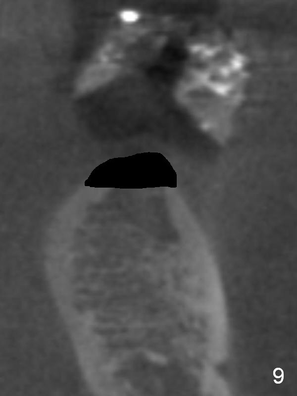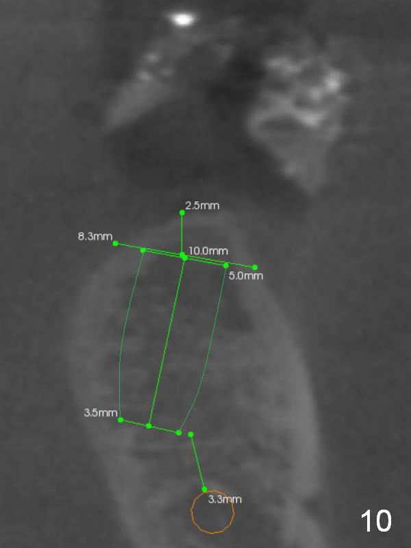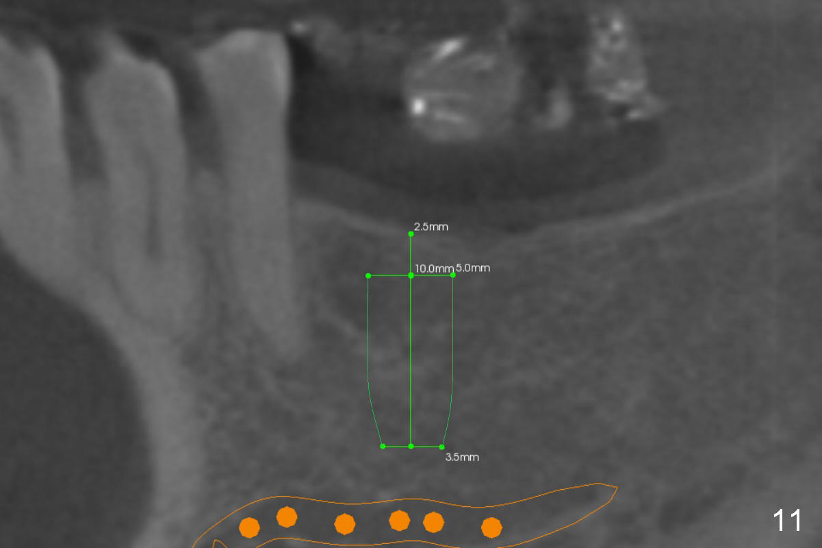 Without ridge split, the ridge top has to be trimmed (Fig.9 black area) to hold a 3 mm shorter implant (Fig.10,11).