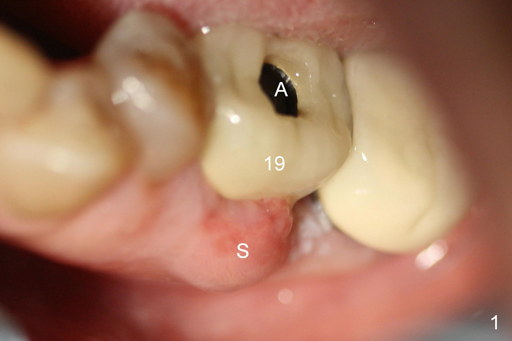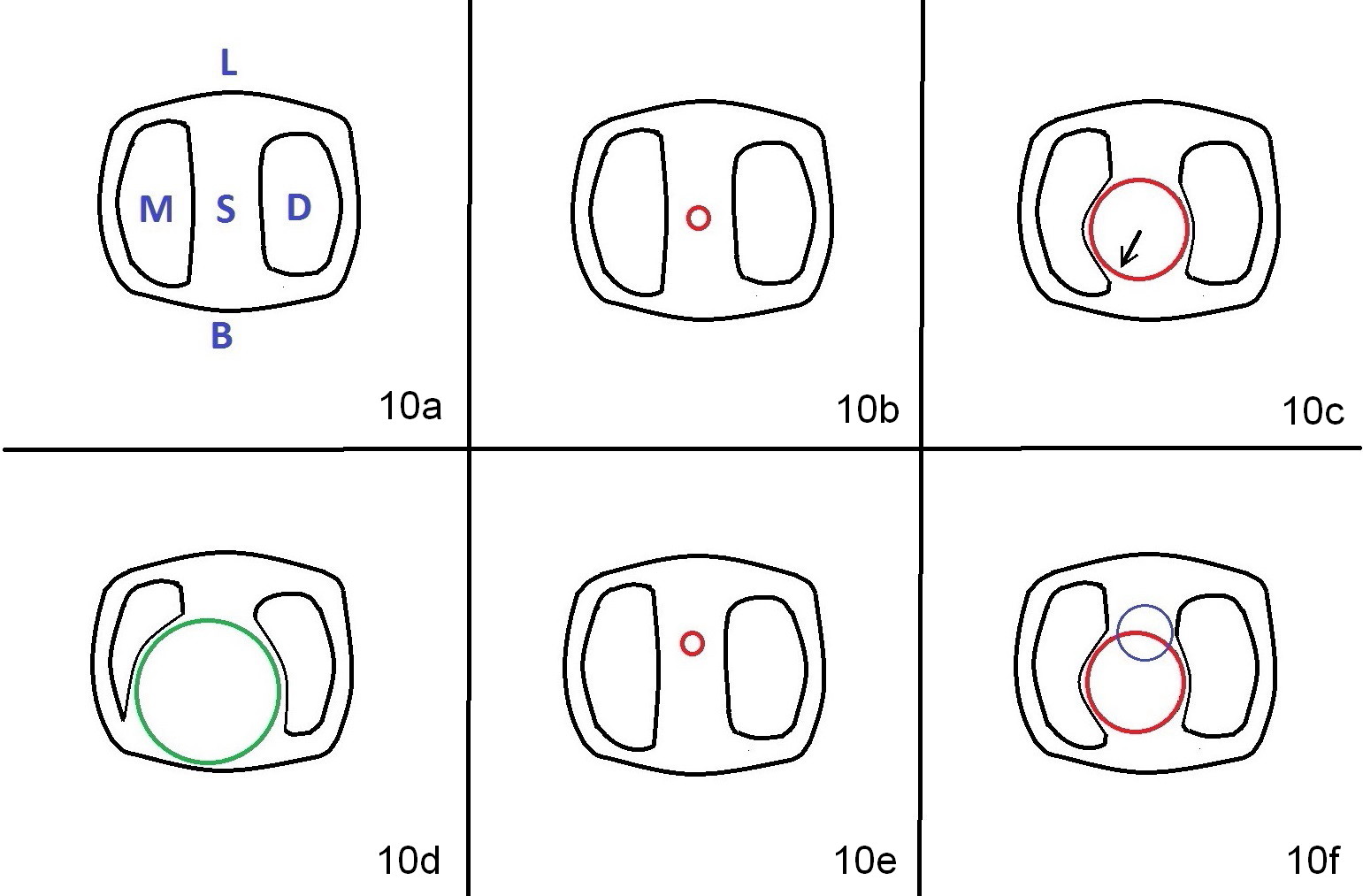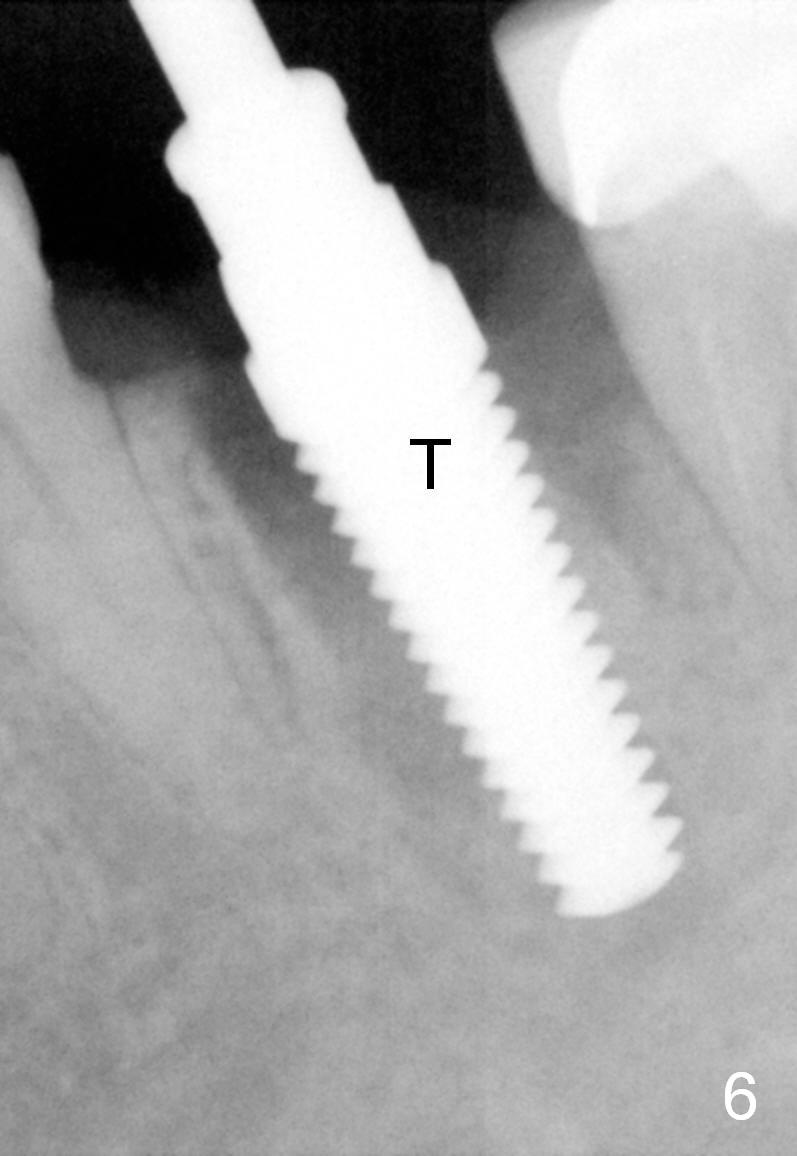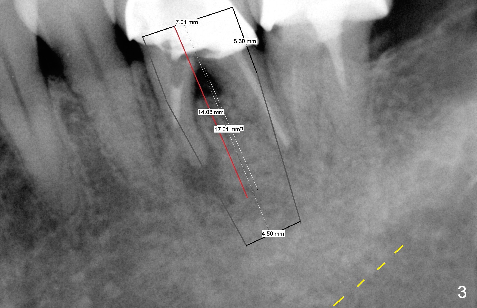 A 47-year-old lady lives out of town and presents to clinic with chief complaint "lower left back tooth easily bleeding with food impaction". Dental history and examination reveals failure of endo retreat of the tooth #19 (Fig.1), buccal gingival swelling (S), open access (A) and furcal and mesial periapical radiolucency (Fig.2 *). She is pleased to know availability of immediate implant and immediate provisional and accepts and receives the treatment at the same visit. The immediate implant (tissue-level) is designed to be as large as 7 mm and as long as 17 mm (Fig.3). To reduce paresthesia (yellow dashed line: the possible upper border of the Inferior Alveolar Canal)), a shorter implant (14 mm long in red line) is preferred. The tooth is extracted with sectioning. Granulation tissue is removed from the furca. The buccal plate appears to be intact. The septum is flat (Fig.4,10a S). Osteotomy starts in the middle of the septum with a 1.2 mm drill (Fig.10b red circle). As osteotomy increases in diameter (Fig.5 O), the apical end appears to be deviated mesiobuccally (Fig.10c large red circle). When a 6x17 mm tapered tap is being placed 14 mm deep (Fig.6 T), vibration of the buccal plate is seemingly felt at the apex (Fig.10d green circle). Further osteotomy may perforate the buccal plate. A 6x14 mm tissue-level implant is placed with >60 Ncm of insertion torque (Fig.7,8 I), followed by a 5x3 mm abutment (A) and bone graft (* in the remaining socket gap). An immediate provisional is cemented without occlusal contact (Fig.9 P).