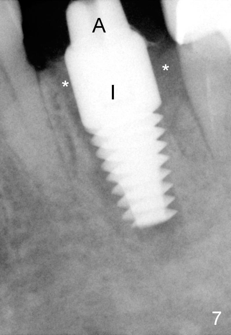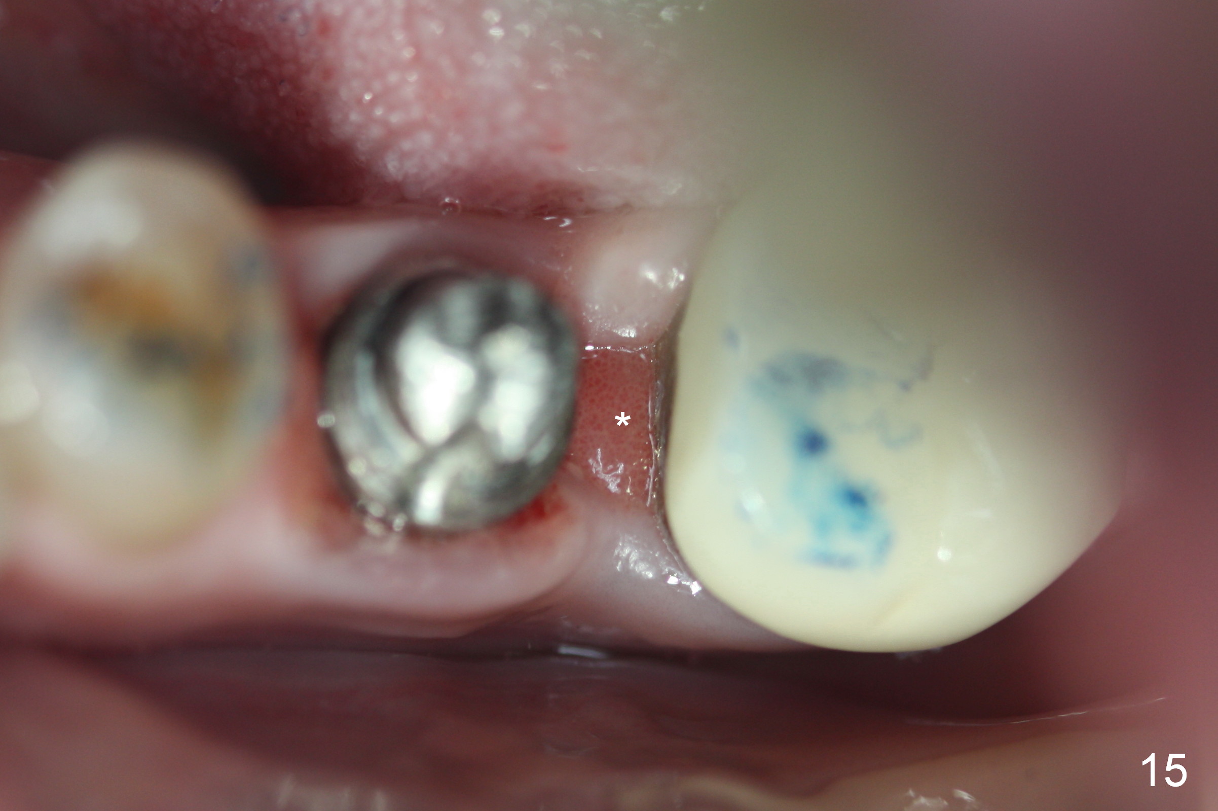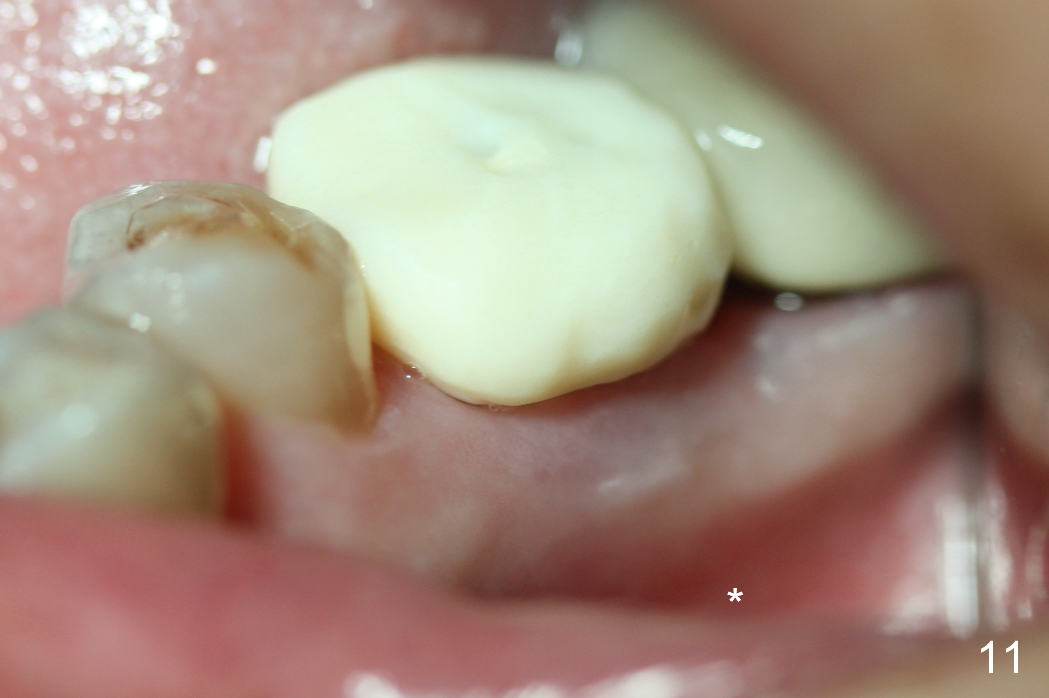 Buccal gingival swelling and mesial periapical radiolucency suggests weakened buccal plate. Osteotomy in the septum should be initiated more lingually (Fig.10e). When the osteotomy starts being deviated, correct as early as possible with a Lindamann bur and preferably over-correct (Fig.10f blue circle). The final implant placement may not encroach the buccal plate (Fig.10f red circle). Three weeks postop, the buccal infection dissolves (Fig.11). What has not disappeared is the buccal undercut (*): the basis for potential buccal perforation. Buccolingual osteotomy trajectory should be adjusted intraoperatively accordingly.