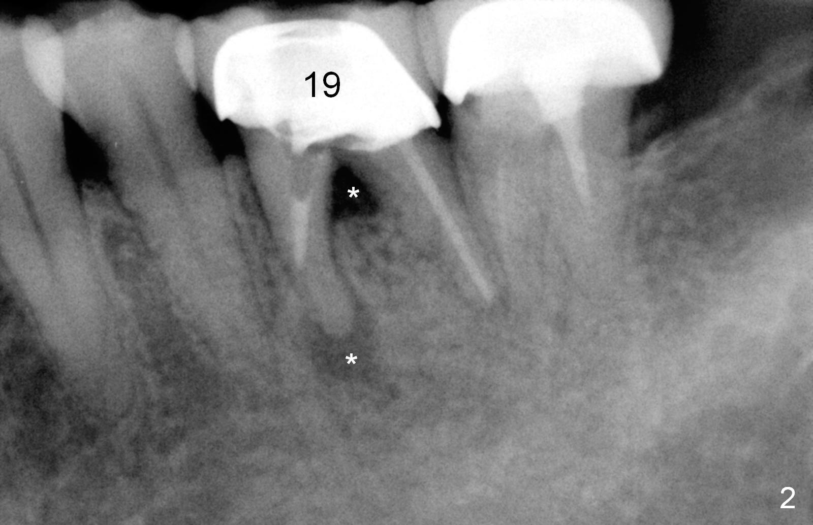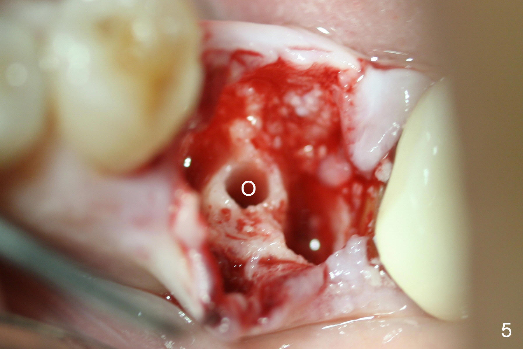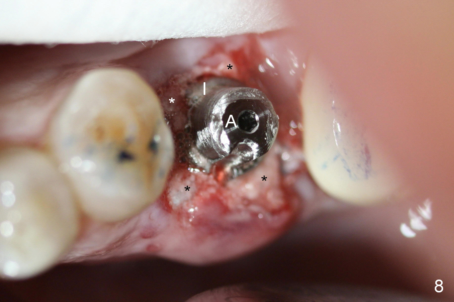Buccal gingival swelling and mesial periapical radiolucency suggests weakened buccal plate. Osteotomy in the septum should be initiated more lingually (Fig.10e). When the osteotomy starts being deviated, correct as early as possible with a Lindamann bur and preferably over-correct (Fig.10f blue circle). The final implant placement may not encroach the buccal plate (Fig.10f red circle). Three weeks postop, the buccal infection dissolves (Fig.11). What has not disappeared is the buccal undercut (*): the basis for potential buccal perforation. Buccolingual osteotomy trajectory should be adjusted intraoperatively accordingly.