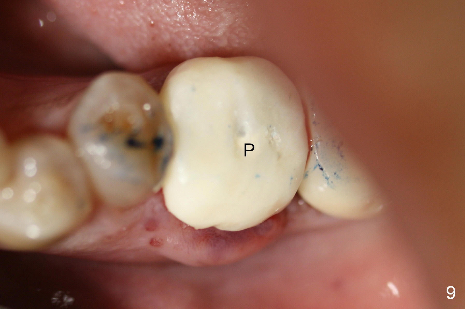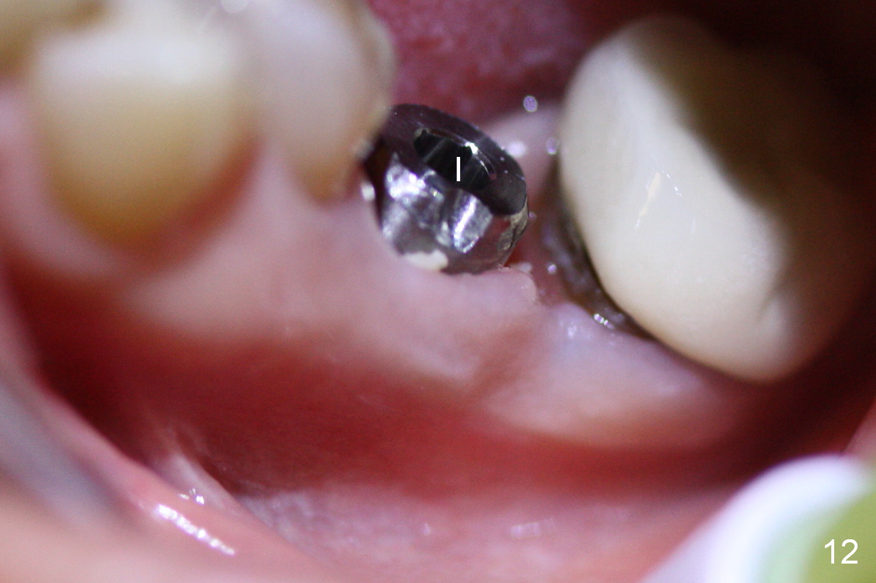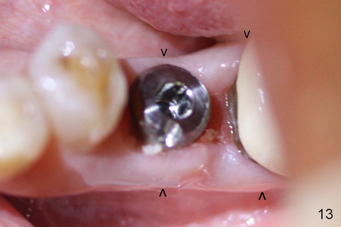 The patient returns for provisional recementation 1.5 months postop. The gingiva remains infection free (Fig.12), but the socket at the implant site has shrunk as compared to the 2nd molar site (Fig.13 arrowheads). Therefore, an implant should be placed before the socket shrinks post extraction, especially with preop lesion. Socket preservation does not prevent socket collapse. The implant is the best framework (tenting) for bone regrowth.