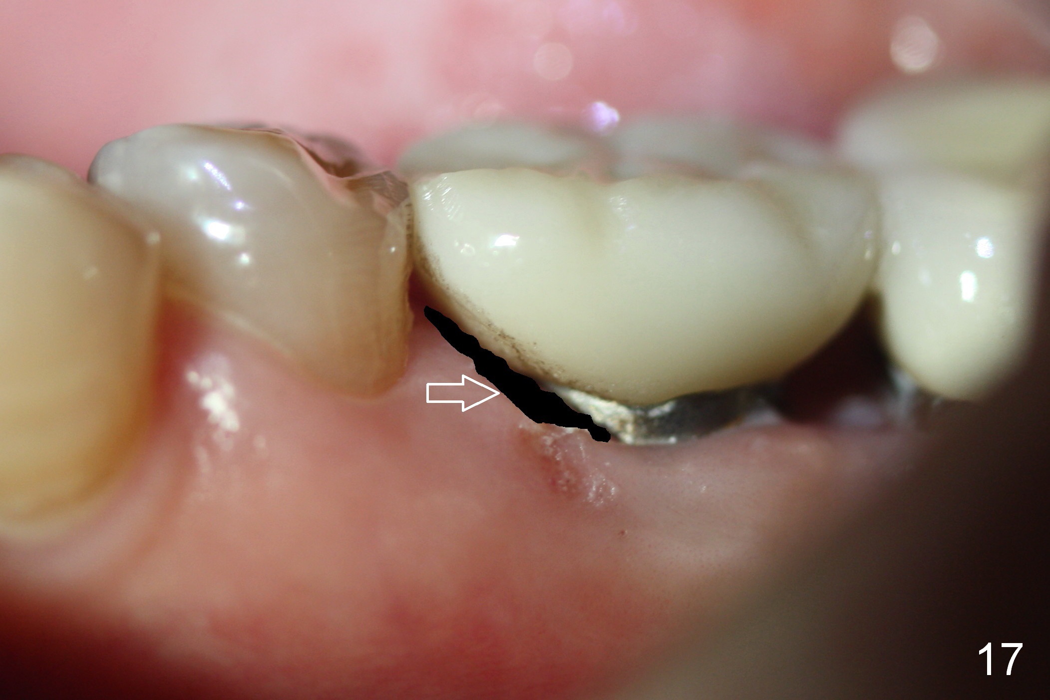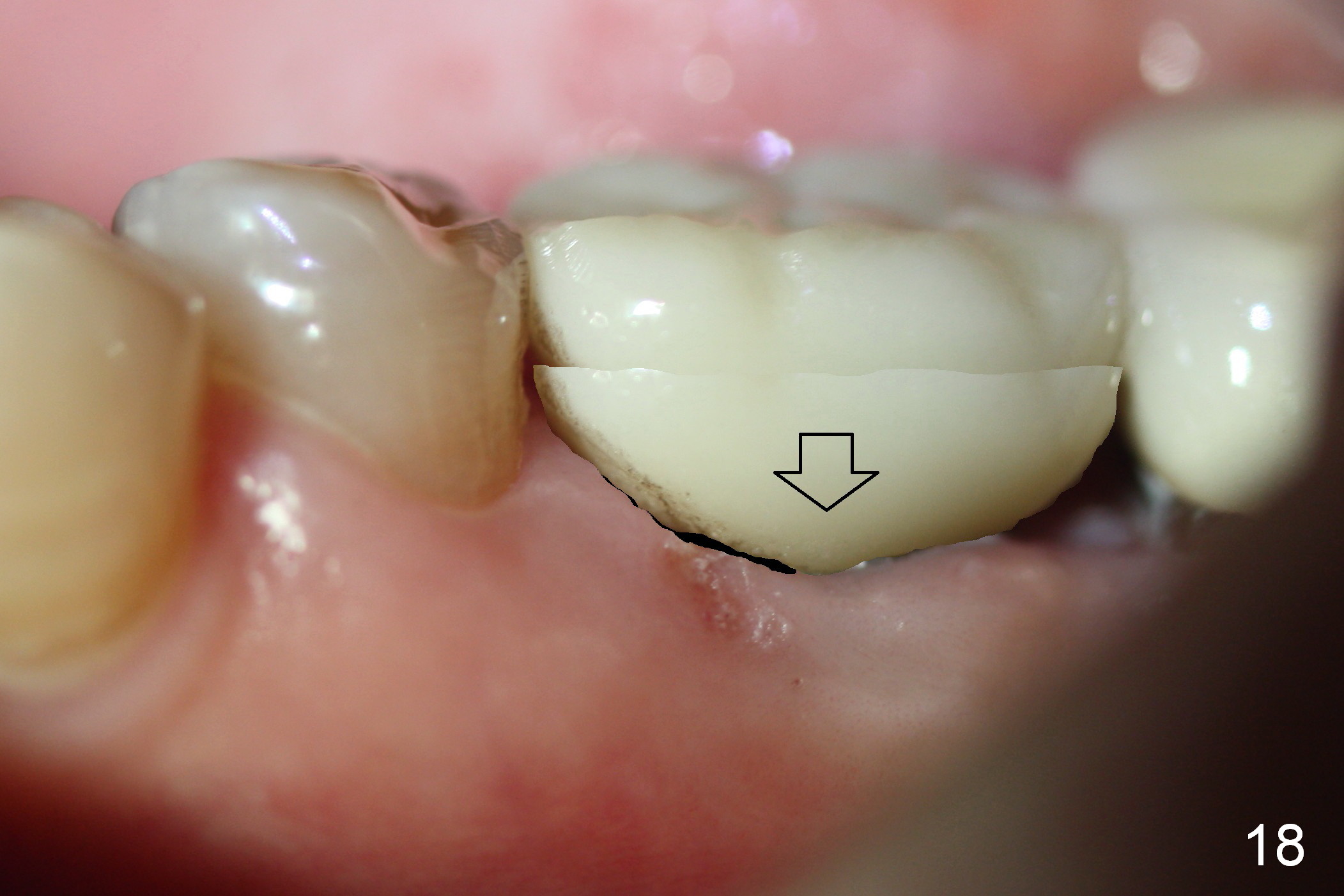 After removing the crown, the margin is lowered clinically. In the lab, the mesial gingiva in the model is to be trimmed ~1 mm (Fig.17 arrow (black area)) so that the mesial embrasure is closed as much as possible (Fig.18). The contact area is larger both buccolingually and apicocoronally. Clinically, the mesial margin of the temporary crown should be a little bit bulging to push the mesial papilla mesially so that there is enough space to clean cement for the permanent crown.