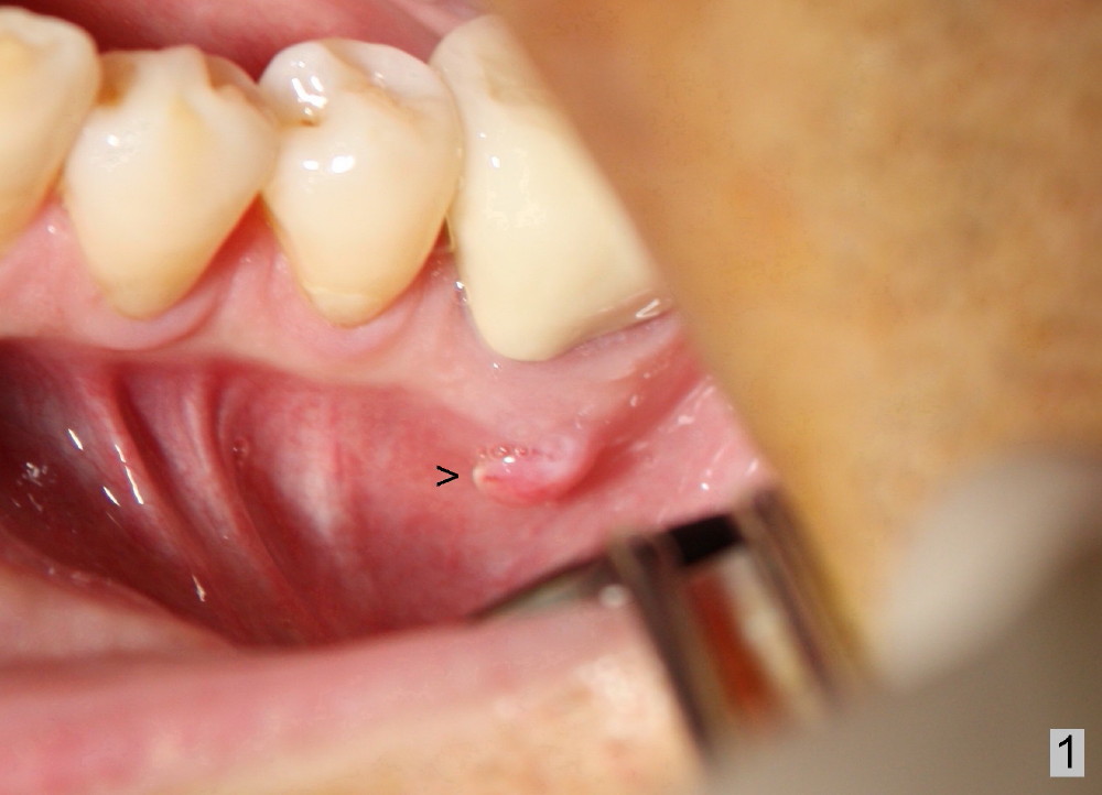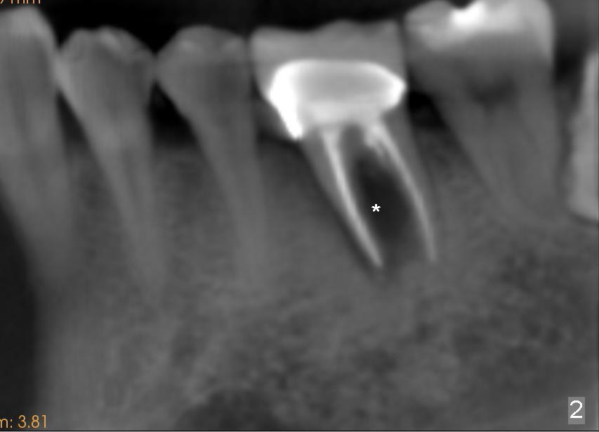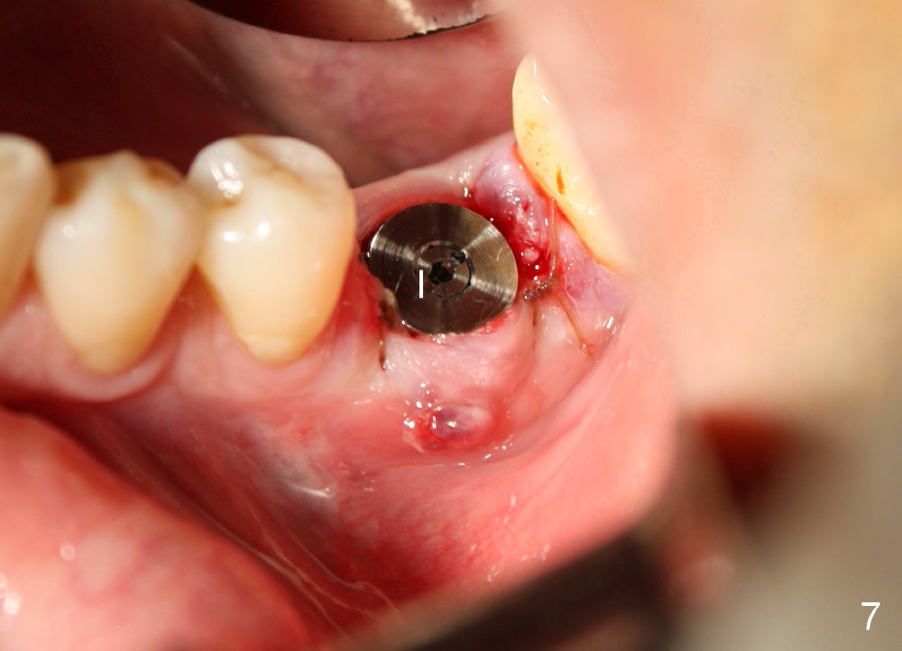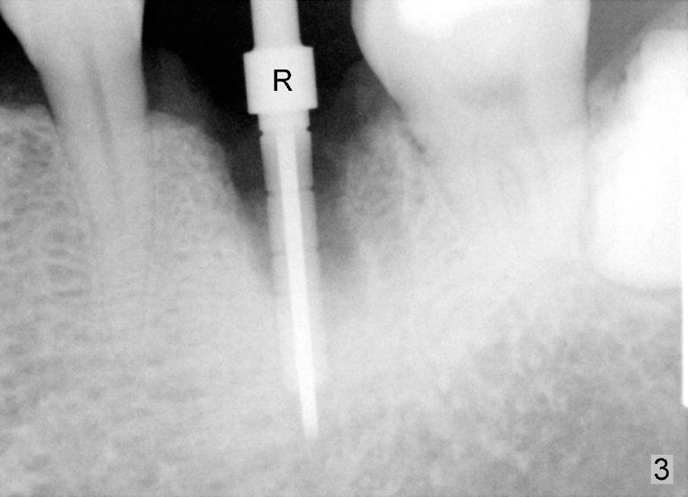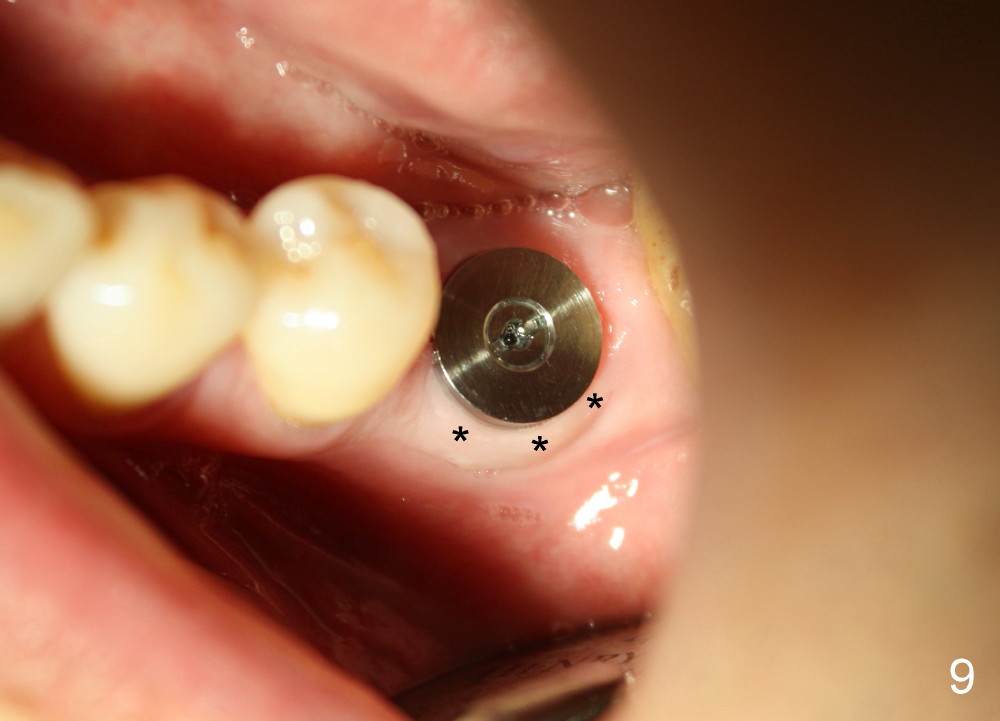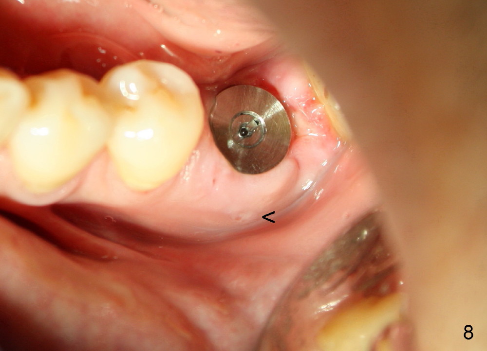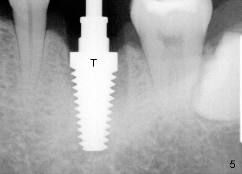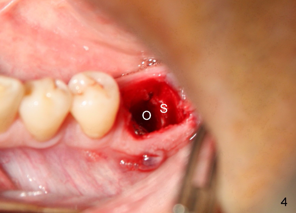 A 41-year-old man has discomfort in the lower left 1st molar. Exam shows swelling and a fistula in the mesiobuccal gingiva (Fig.1 >) and large radiolucency around the mesial root (Fig.2 *). After extraction and thorough debridement, osteotomy is initiated in the mesial socket, but the upper portion of the reamer (Fig.3 R, 2.5 mm) is placed in the middle of the edentulous space. By the time 5 mm reamer is removed, the osteotomy (Fig.4 O) forms mainly in the mesial socket with the septum (S) deviated to the distal socket. A 7x17 mm tap is placed with stability (Fig.5 T). An implant with the same dimension is placed with insertion torque more than 60 Ncm (Fig.6 I). With the large implant, two proximal sutures are able to close the remaining socket gaps (Fig.7). The swelling and fistula disappears and the gingiva tightly surrounds the implant in 1 week postop (Fig.8).