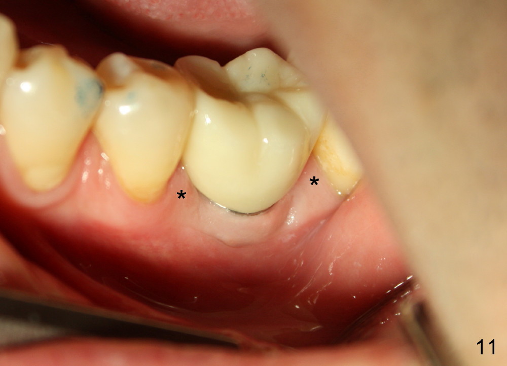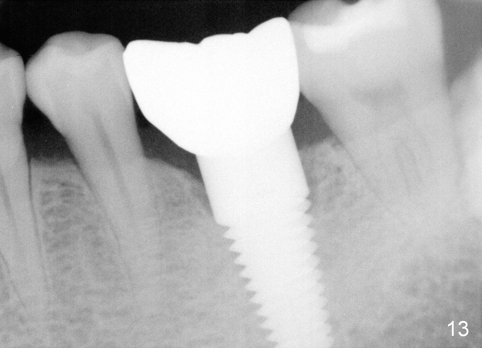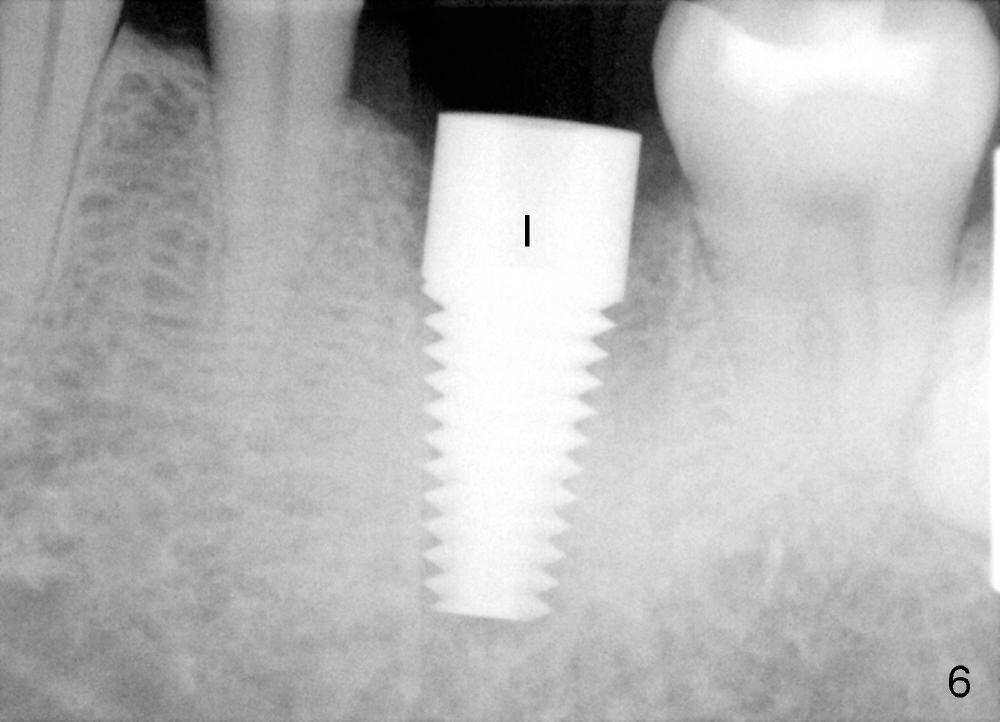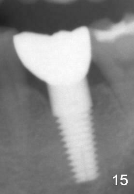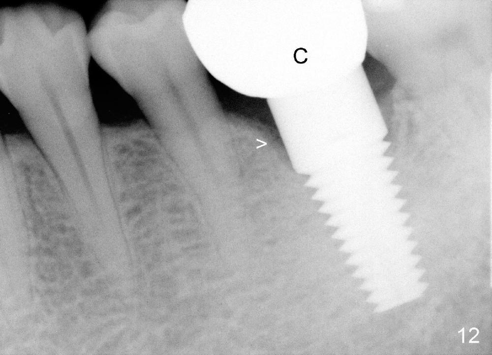 Two and a half months post cementation, the buccal metal show is much less and confined to the midbuccal portion. It appears that the papillae increase their mesiodistal dimension (data not shown). Bone appears to remain stable over the implant surface 2.5 and 9 months post cementation (Fig.12 >,13). The papillae around the implant crown remain normal 11 months post cementation (Fig.14 *). No bone loss is noticed 26 (Fig.15) or 38 (Fig.16) months post cementation. There is no bone loss around the 7x17 mm tissue-level implant 6 years 8 months post cementation (Fig.17).