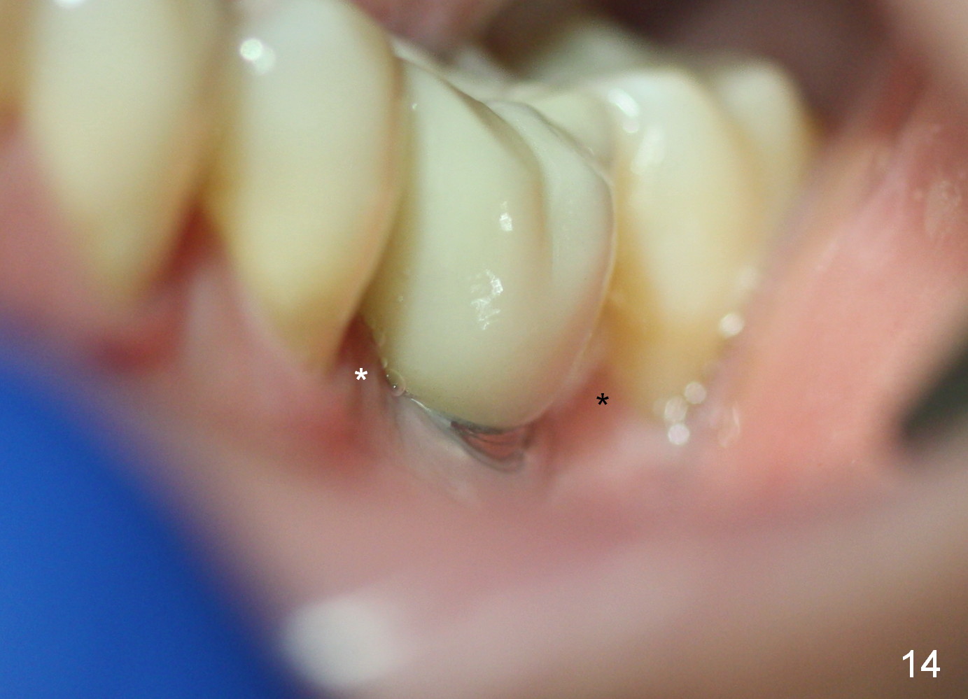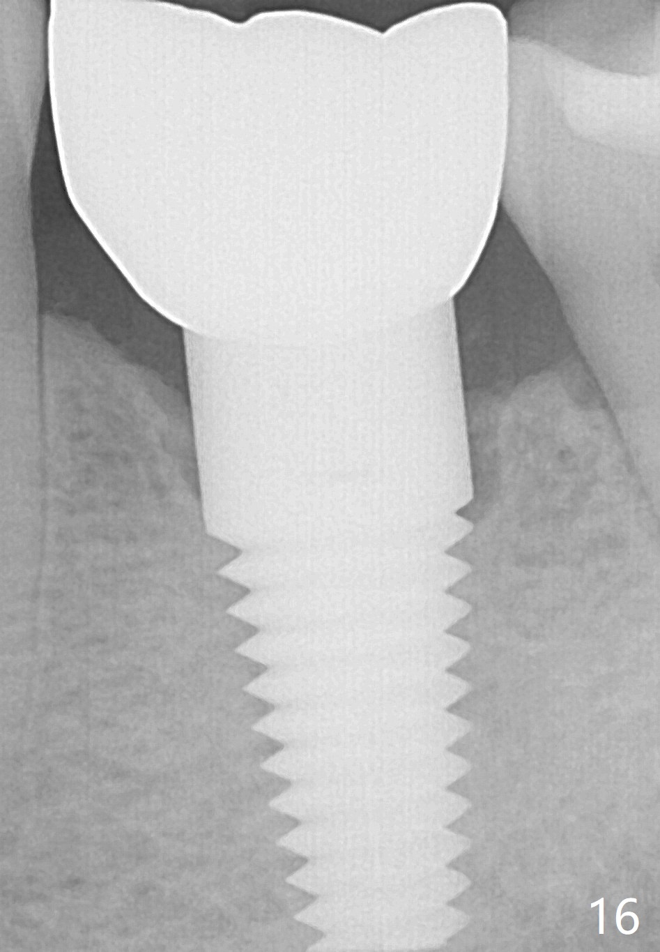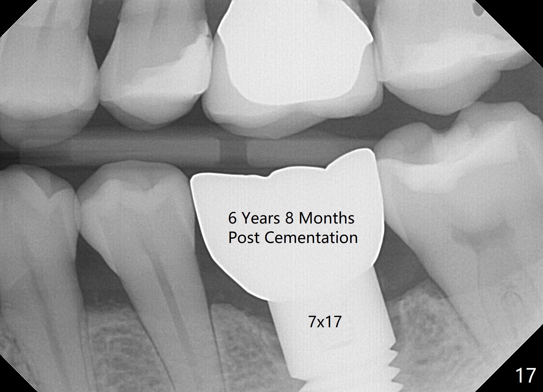 Two and a half months post cementation, the buccal metal show is much less and confined to the midbuccal portion. It appears that the papillae increase their mesiodistal dimension (data not shown). Bone appears to remain stable over the implant surface 2.5 and 9 months post cementation (Fig.12 >,13). The papillae around the implant crown remain normal 11 months post cementation (Fig.14 *). No bone loss is noticed 26 (Fig.15) or 38 (Fig.16) months post cementation. There is no bone loss around the 7x17 mm tissue-level implant 6 years 8 months post cementation (Fig.17).
