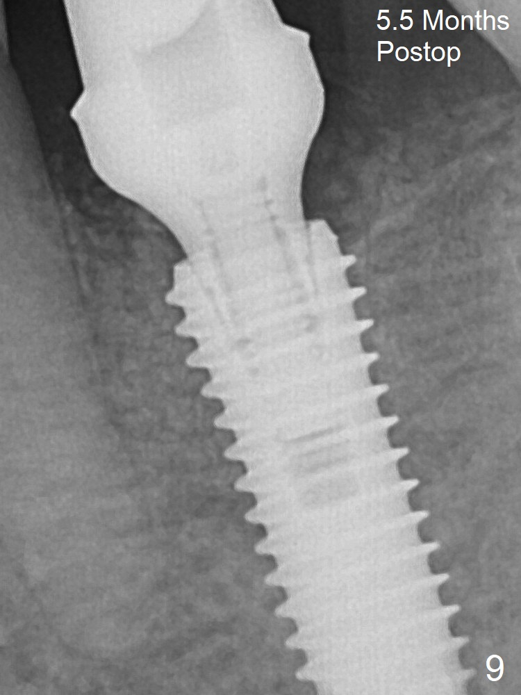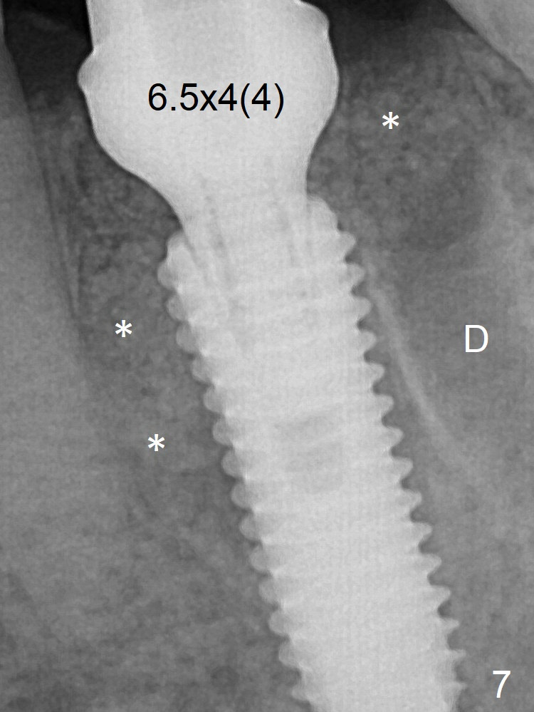 Due to severe buccal plate resorption, a shorter implant is placed (Fig.6; 5x15 mm in stead of 18 mm). There is at least 2 mm gap buccally for Vanilla Graft, which is also placed next to the implant and the neighboring root (Fig.7 double * ). Abutment: 6.5x4(4) mm. The distal (D) socket is packed with Collagen Plug before bone graft coronally (single *). Both the mesial and distal sockets heal 5.5 months postop (Fig.9), although the apical portion of the distal socket was not filled with allograft (Fig.7 D). The implant was placed mesial. The abutment may be changed to 5.5x5(3) mm or 4.5x15 degrees 3 mm cuff before impression. Next case, osteotomy should be established in the middle of the socket by using Lindamann bur amply.