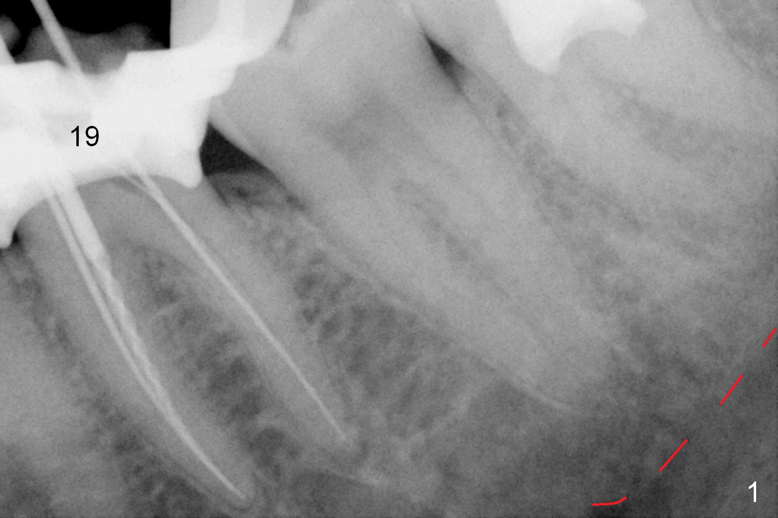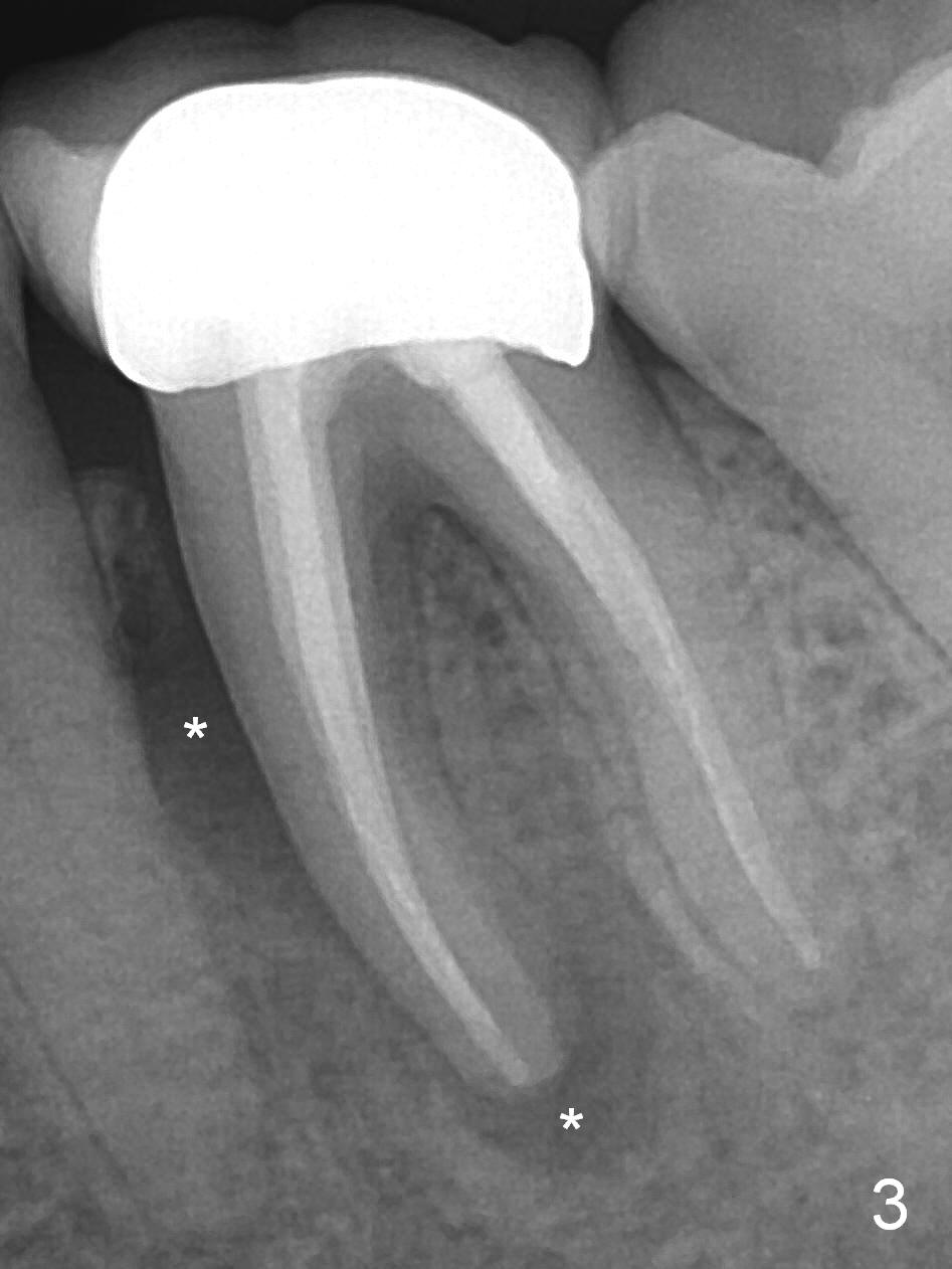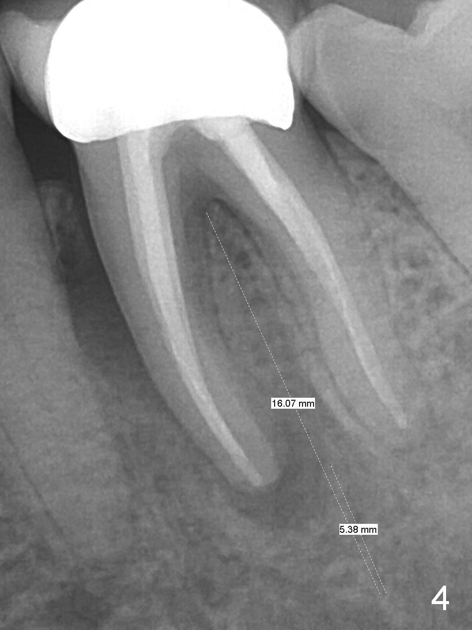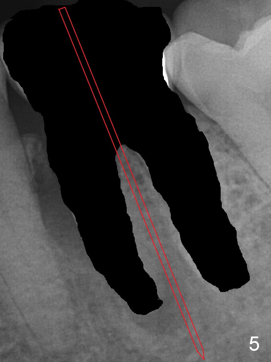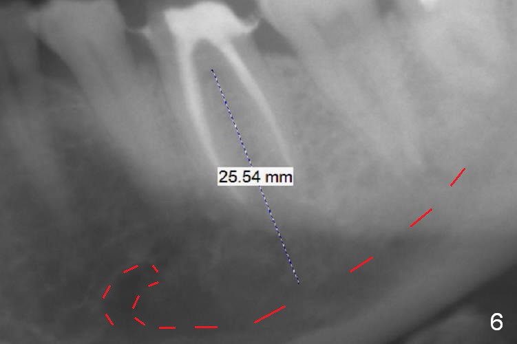 A 59-year-old woman had root canal therapy for the tooth #19 10.5 years ago (Fig.1 (red dashed line: the superior border of the Inferior Alveolar Canal). Two years later there was apparent periapical radiolucency with the distal root (Fig.2 *). The tooth remains asymptomatic until the last six months. There are 2 fistulae associated with the tooth: mesiolingual and buccal furca. Radiogra-phically, there are 2 radiolucent lesions: mesial and apical to the mesial root (Fig.3 *). If a 16 mm implant is placed, there will be approximately 5 mm apical bone (Fig.4); 7 mm for a 18 mm implant. The bone height is 25 mm (Fig.6). Therefore, once initial osteotomy is established with a 13 mm long drill with PA confirmation, the osteotomy is extended to its depth with 1.5x21 mm drill (Fig.5). After socket treatment with Metronidazole gauze with Epinephrine (1: 50,0000), take PVS impression of the socket to catch the large mesial defect. A fair amount of allograft and Osteogen is expected. It has been 9 months since last visit. Retake PA before surgery. If the mesial defect enlarges, start osteotomy in the distal slope of the septum.