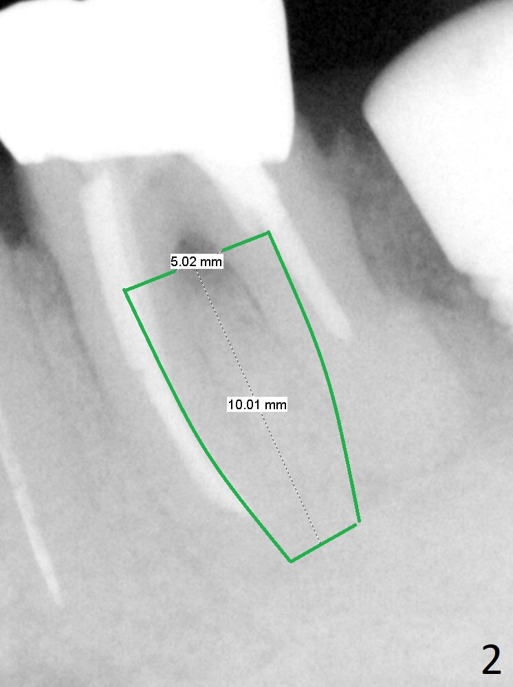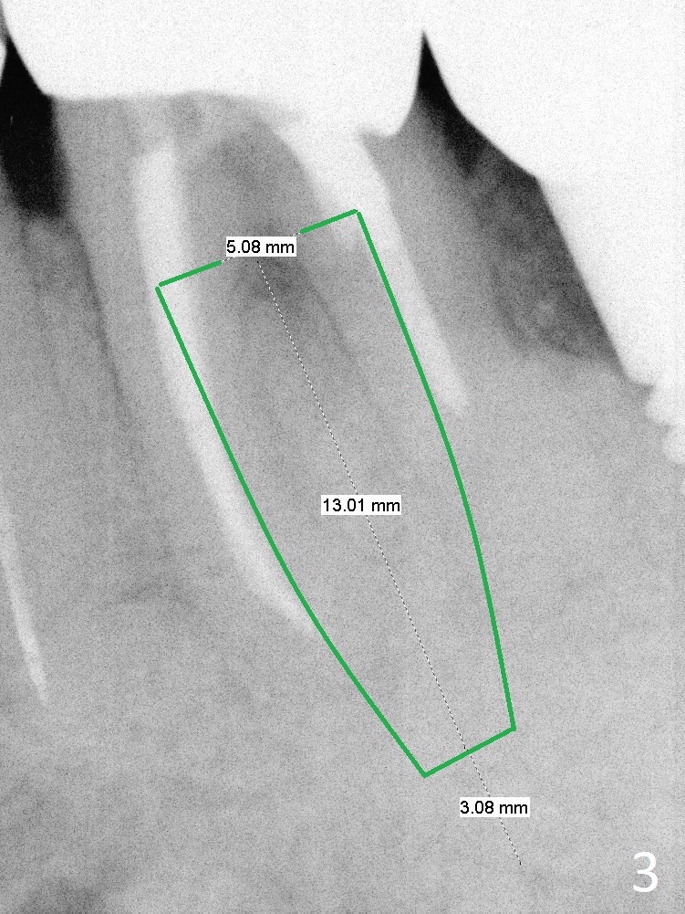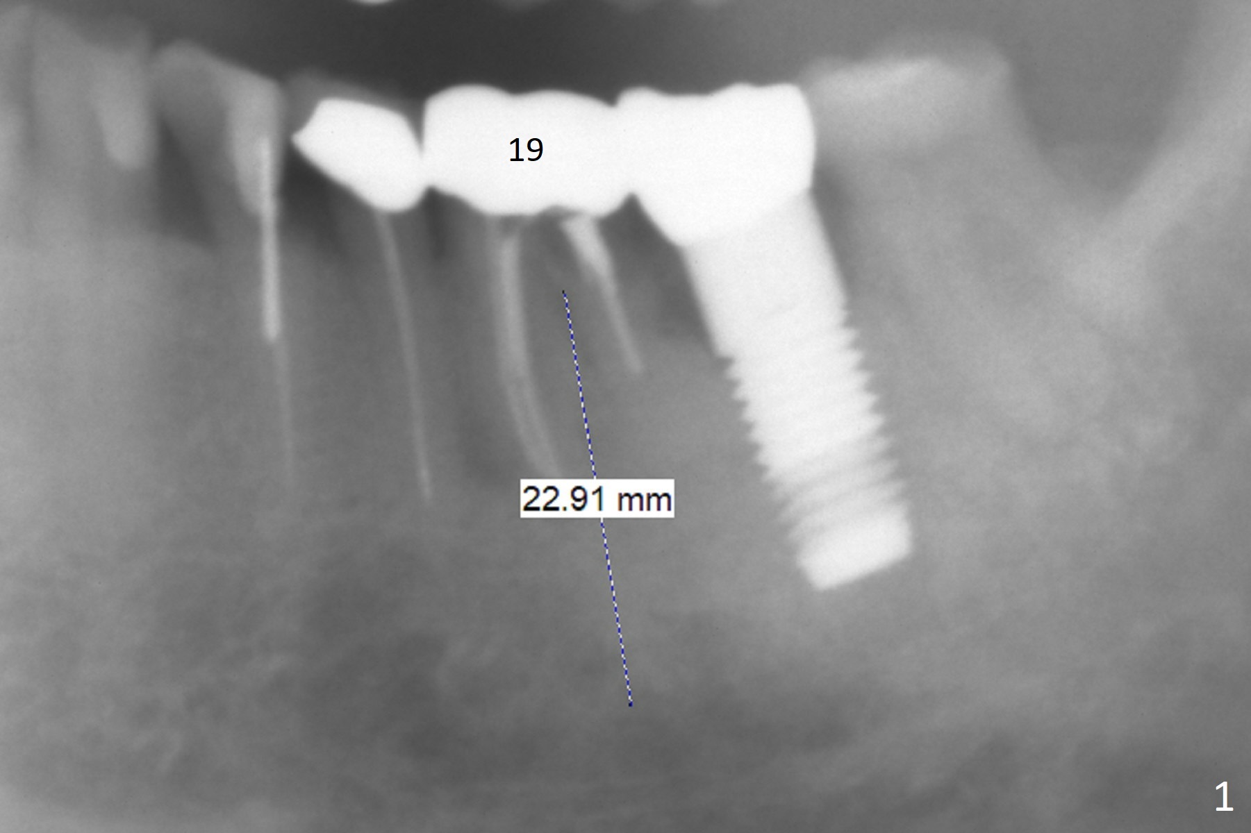 A 87-year-old man loses #19 crown and post recently (Fig.1). A new implant system will be tried. It has 2 main features. There are 2 sets of drills (short and long). Every time try short ones unless the neighboring teeth are extremely long. There are several lengths of stoppers (as short as 5.7 mm) so that we do not have to use short stoppers from DIO Sinus Master Kit. If a sample implant (5x10 mm, Fig.2) does not achieve primary stability, shift to UF, but still use IS drill for 13 mm (Fig.3). Take preop PA. Prepare surgical handpiece for sectioning. Place bone graft to the defect between #18 and 19.