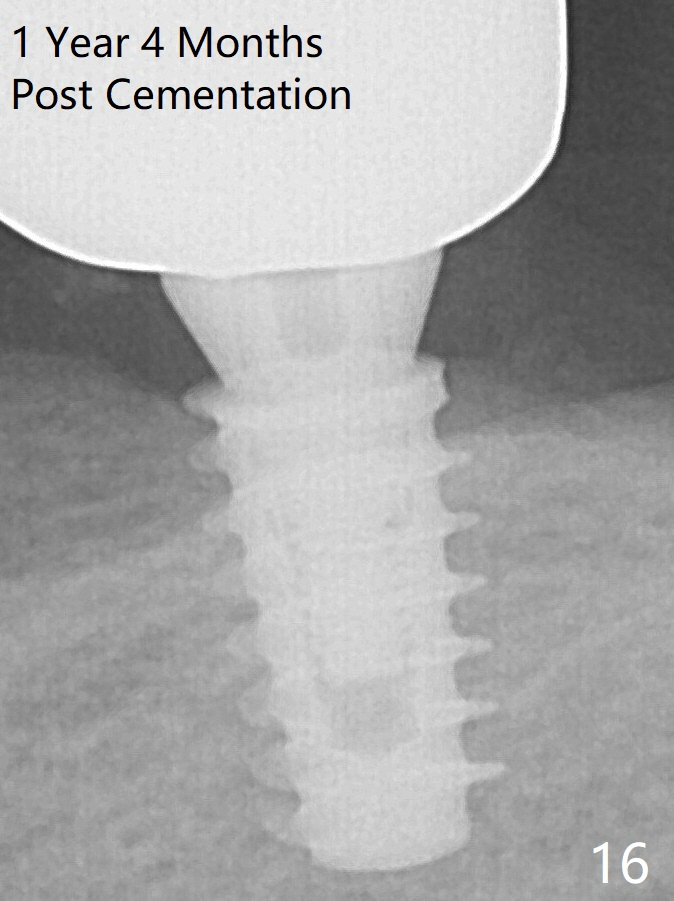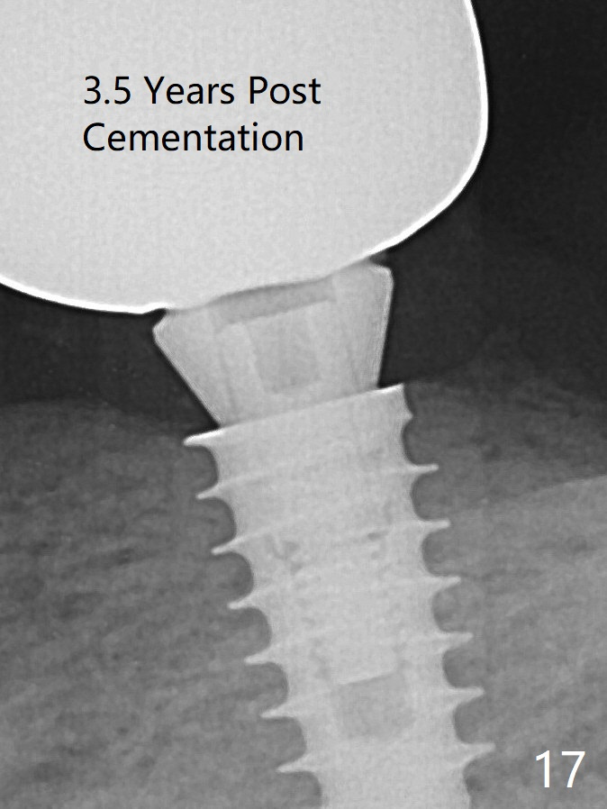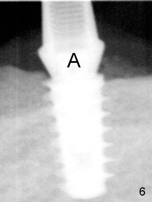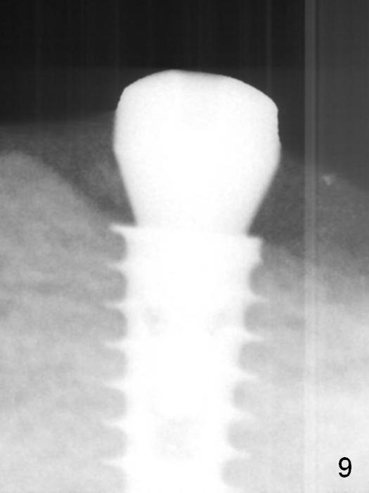 A 5x9 mm implant is placed with a pair abutment (A) to test the trajectory (Fig.6). The implant appears to have osteointegrated 2 months postop (Fig.9 with a healing abutment). There is no bone resorption 1 year 4 months post cementation (Fig.16). The implant remains stable 3.5 years post cementation (in spite of open margin), while the other abutment for the RPD (the tooth #30) has mobility with gingival recession.