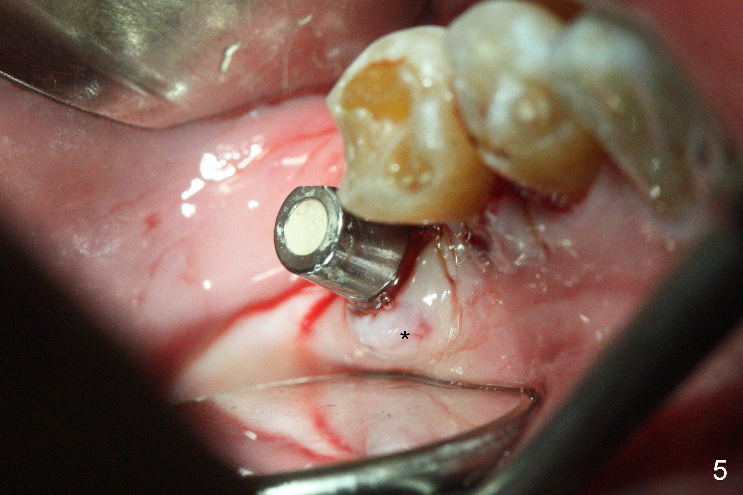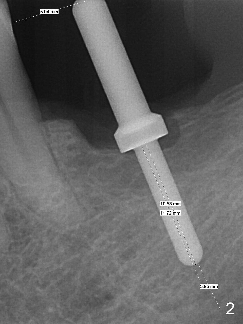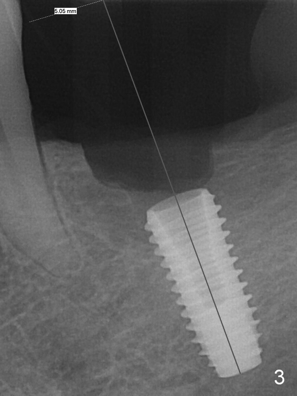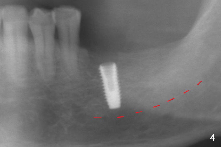 As indicated by CBCT, the ridge at the site of #19 is pointed (Fig.1). After regional ridge reduction (Fig.2) and use of 2 mm pilot drill for 8.5 mm, the depth is actually ~ 10 mm. After sequential osteotomy until 4.3x10 mm drill, the osteotomy is in fact 11.5 mm deep; a 5x11.5 mm implant is placed with <35 Ncm (Fig.3). Panoramic X-ray shows the implant close to the superior border of the Inferior Alveolar Canal (Fig.4 red dashed line). The ridge looks wider and more bulging (*) when a 6.5x5.5(5) mm abutment, allograft/Osteogen and Osteotape (GBR) are placed (Fig.5 (lingual) and 6 (buccal)). Periodontal dressing is then applied. There is no postop paresthesia. The abutment dislodges 3 weeks postop. A healing abutment is placed (6.5x4 mm). The patient returns for restoration 4 months postop; bone density appears to increase around the implant (Fig.7 arrowheads). When a 7.5x5(4) mm abutment is placed, there is transient pressure on the gingiva (blanching). The mesial gingival trough is formed by Diode laser prior to impression.