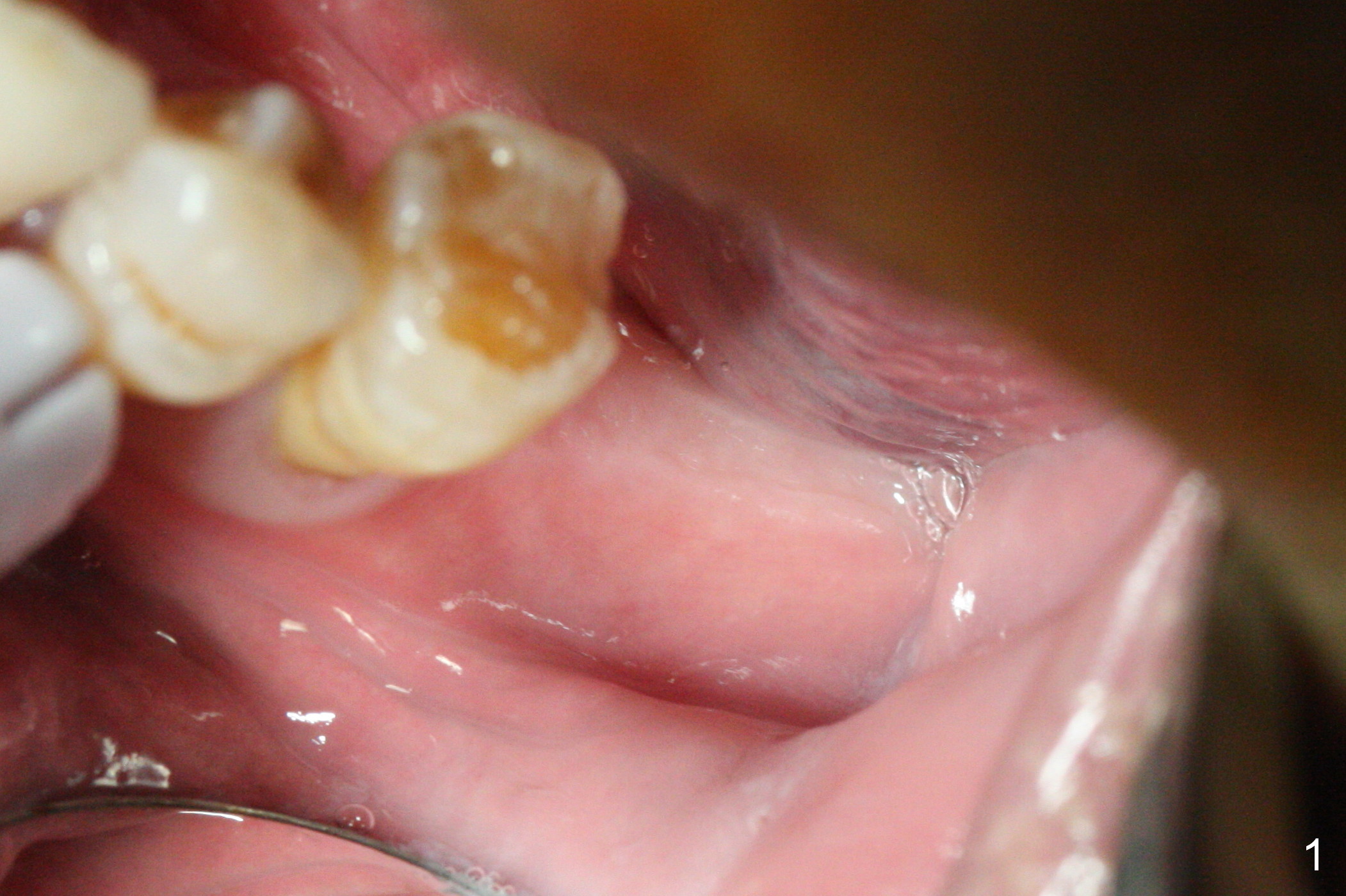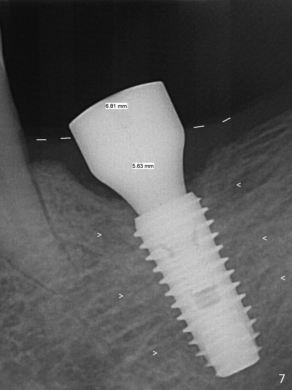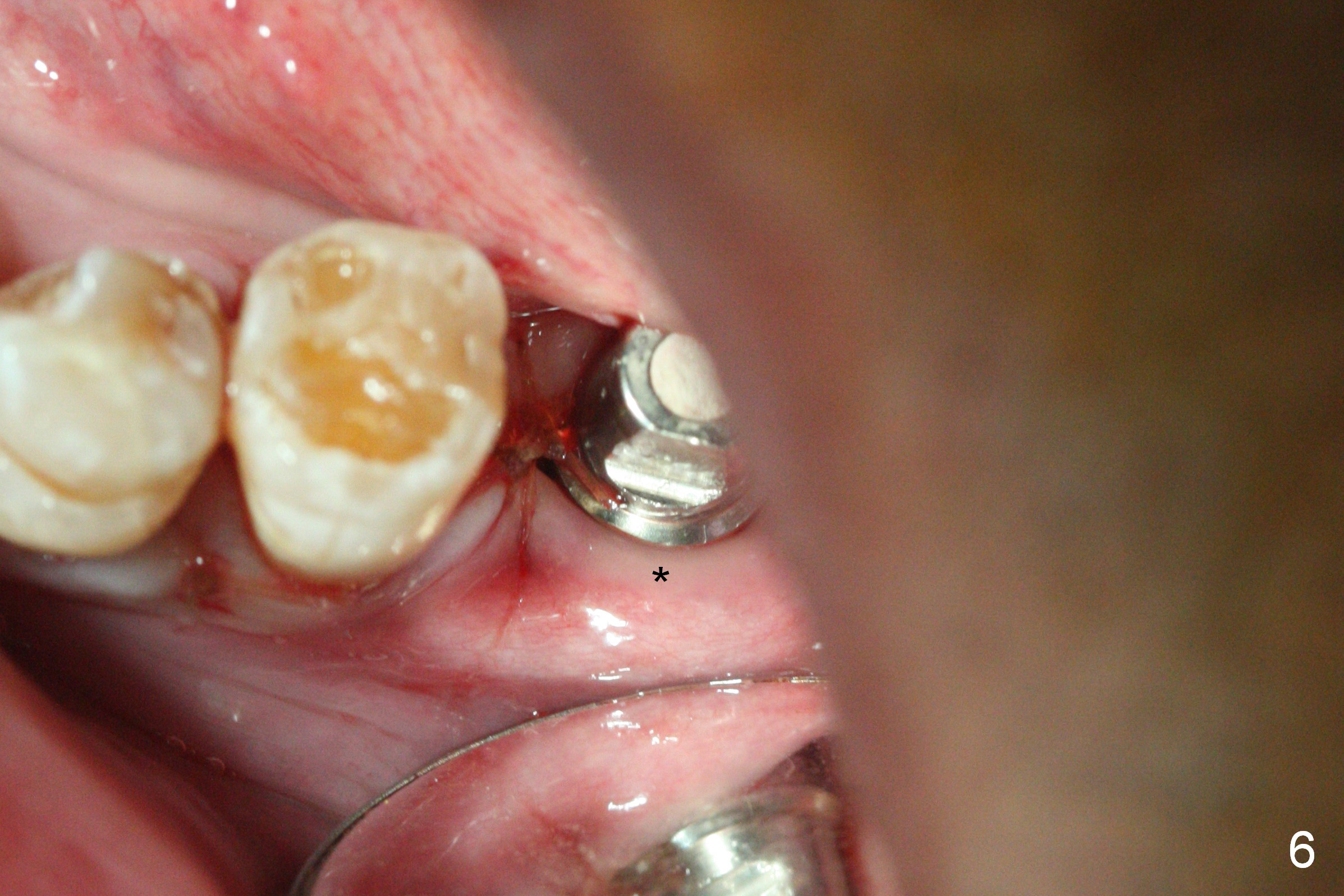 As indicated by CBCT, the ridge at the site of #19 is pointed (Fig.1). After regional ridge reduction (Fig.2) and use of 2 mm pilot drill for 8.5 mm, the depth is actually ~ 10 mm. After sequential osteotomy until 4.3x10 mm drill, the osteotomy is in fact 11.5 mm deep; a 5x11.5 mm implant is placed with <35 Ncm (Fig.3). Panoramic X-ray shows the implant close to the superior border of the Inferior Alveolar Canal (Fig.4 red dashed line). The ridge looks wider and more bulging (*) when a 6.5x5.5(5) mm abutment, allograft/Osteogen and Osteotape (GBR) are placed (Fig.5 (lingual) and 6 (buccal)). Periodontal dressing is then applied. There is no postop paresthesia. The abutment dislodges 3 weeks postop. A healing abutment is placed (6.5x4 mm). The patient returns for restoration 4 months postop; bone density appears to increase around the implant (Fig.7 arrowheads). When a 7.5x5(4) mm abutment is placed, there is transient pressure on the gingiva (blanching). The mesial gingival trough is formed by Diode laser prior to impression.