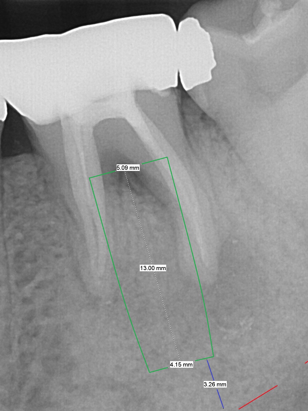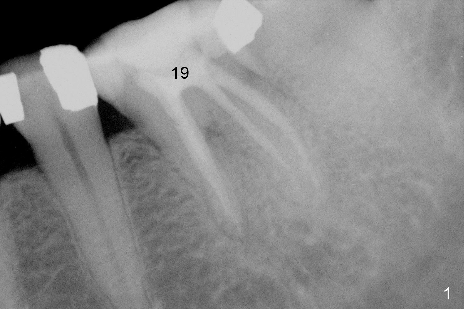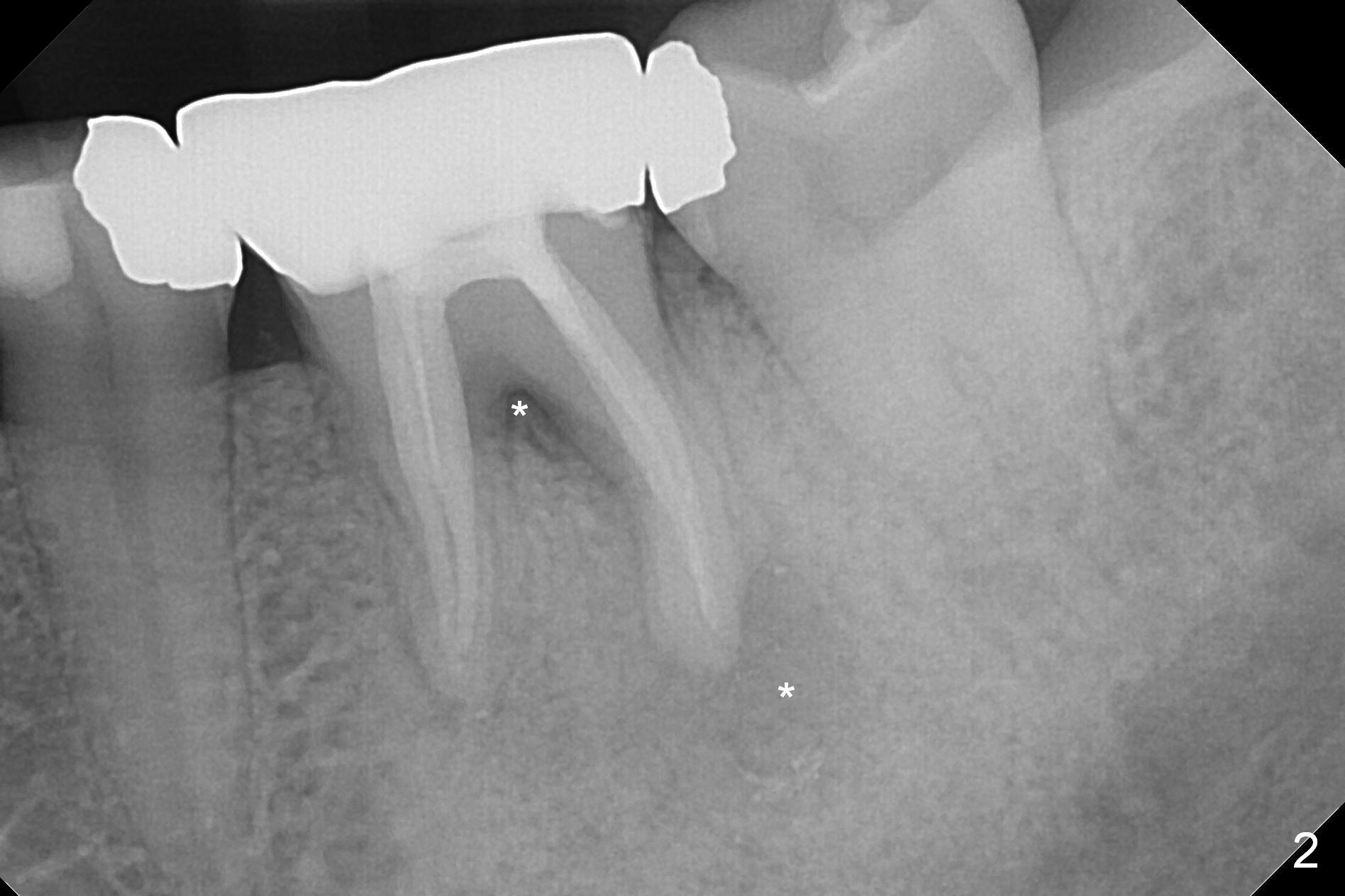 A 48-year-old woman has had mild discomfort at #19 four years post RCT (Fig.1). It appears that the tooth has 3 roots. The latter should help stabilize an implant placed in the septum (tripods). The affected tooth has large distal periapical radiolucency (Fig,2 *). There is localized swelling at the buccal furca. After debridement, treat the sockets with Clindamycin. Osteotomy will be slightly lingual, since the buccal plate is thinner than the lingual one. In addition, the buccal plate is most likely defective due to furca and periapical lesions. The longest IBS implant is going to be chosen unless the implant has to be placed deep due to furca destruction. In fact the patient has the tooth extracted in other office with socket preservation.