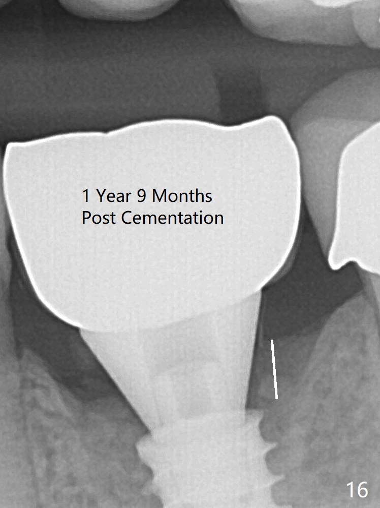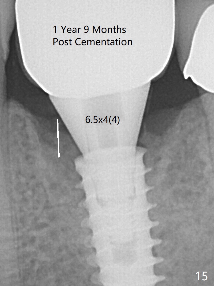 New bone has apparently covered the implant plateau 8 months postop (3 months post cementation (Fig.13 arrows)). The lower two-thirds of socket have disappeared. Bone density between threads increases 9 months post cementation (Fig.14). There is 2 mm bone superior to the implant plateau mesial and distal 1 year 9 months post cementation (Fig.15,16).