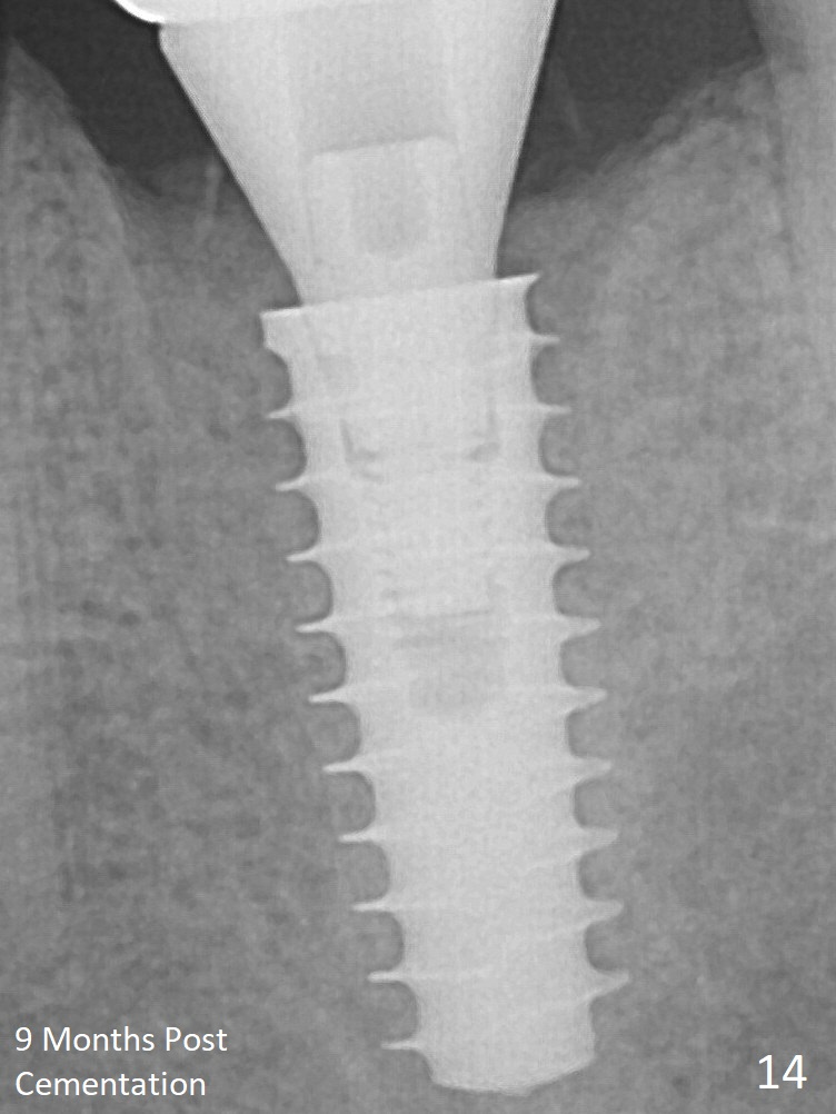 New bone has apparently covered the implant plateau 8 months postop (3 months post cementation (Fig.13 arrows)). The lower two-thirds of socket have disappeared. Bone density between threads increases 9 months post cementation (Fig.14).