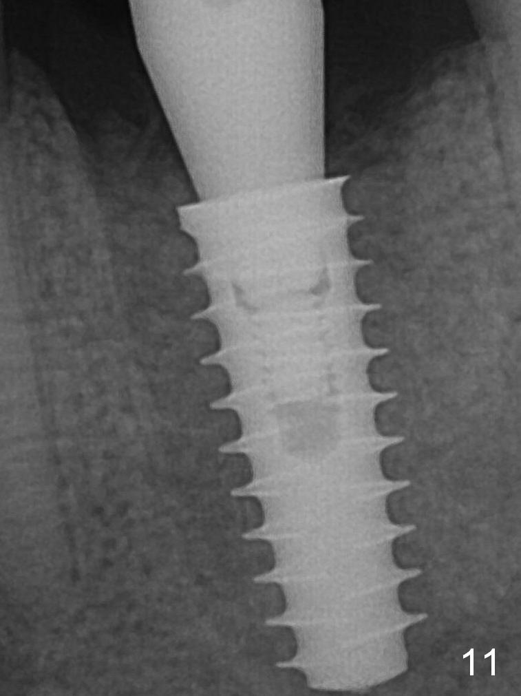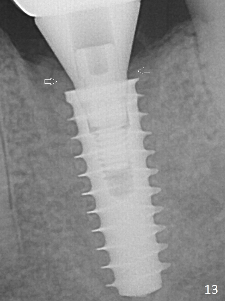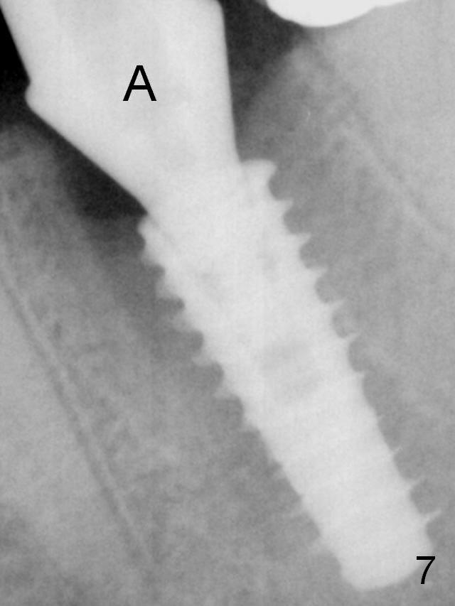 Insertion torque of a 5x13 mm implant is <20 Ncm (Fig.7). A 6.5x4(4) mm pair abutment is placed (A), apparently proper for restoration. Allograft is placed prior to immediate provisional. The patient complains of bad smell from the site 24 days postop. When the provisional is removed, the abutment is found to be mobile. When the latter is removed with local anesthesia, bone graft granules are attached to the socket above the lightly mobile implant. In fact the latter appears to be stable after a few turns by finger. A healing screw is placed; the socket is closed with collagen plug and 4-0 Chromic gut sutures. It appears that a larger implant should have been used to achieve higher torque. Two months later (3 months postop), the coronal end of the implant is partially exposed. A 5x4 mm healing abutment is placed. It appears that the implant is stable. The implant appears to have osteointegrated 4 months postop (Fig.11). Impression is taken. New bone has apparently covered the implant plateau 8 months postop (3 months post cementation (Fig.13 arrows)). The lower two-thirds of socket have disappeared.