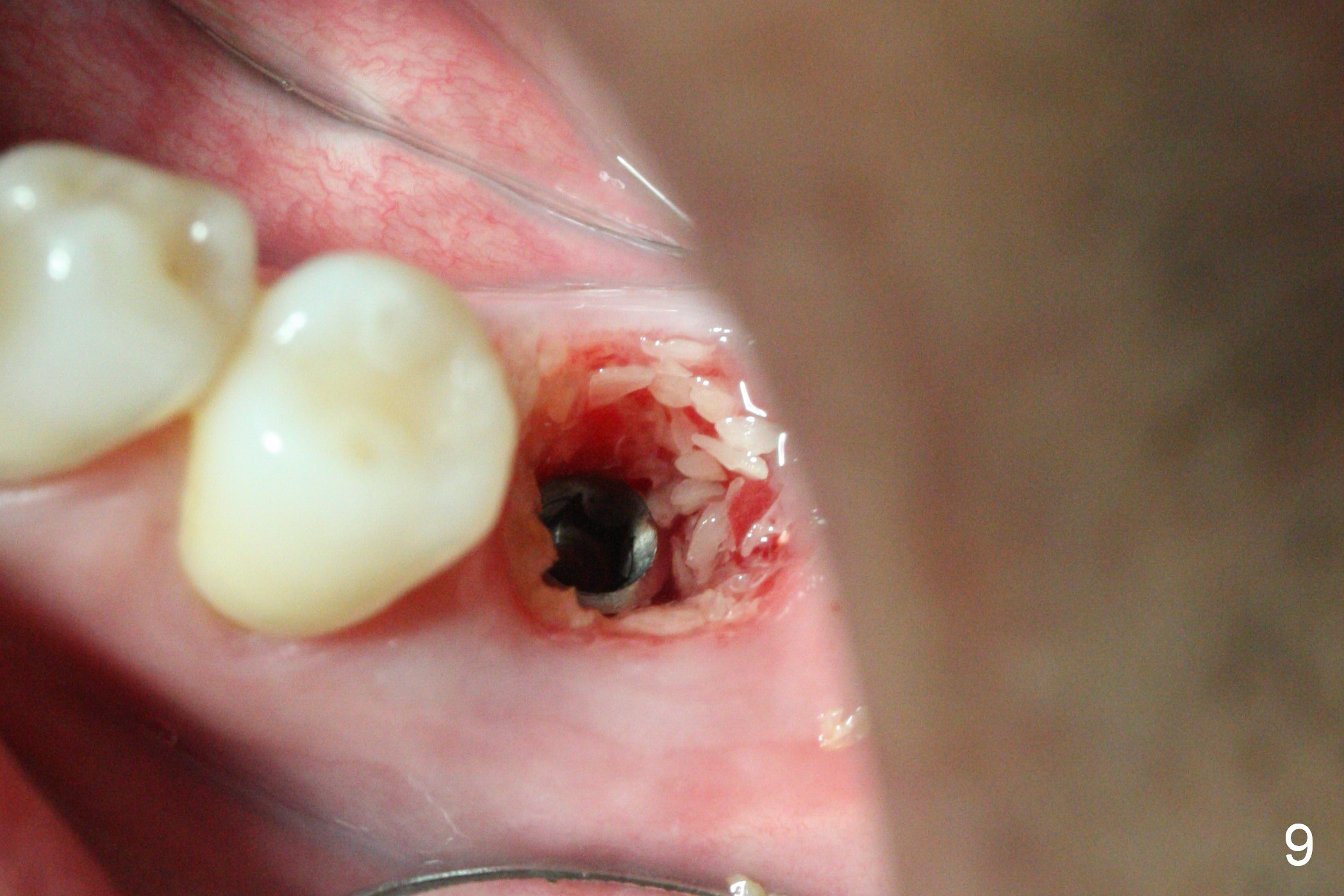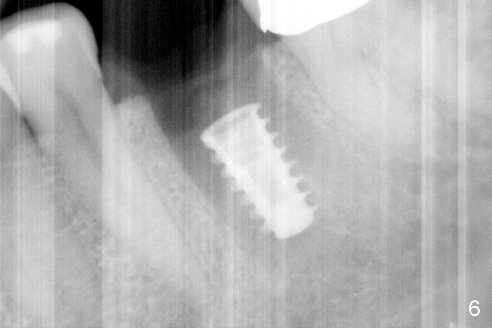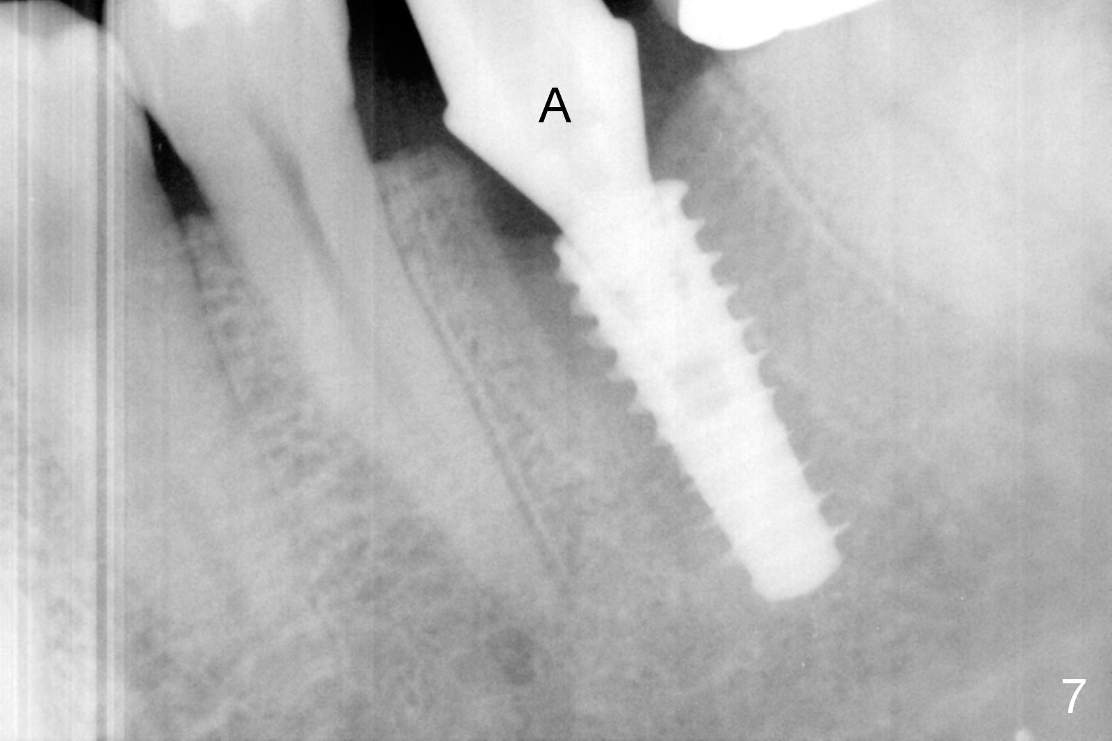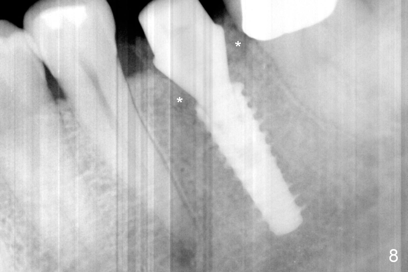 The tooth #19 is easy to get loose, but it cannot be luxated.  After sectioning and extraction (Clindamycin), the septum is found to be thin (Fig.4).  A surgical fissure bur is used to initiate osteotomy, followed by 1.6 mm pilot drill.  It is difficult to use Marking bur (wobbling over the basically pointed septum).  It is impossible to use 4.3 mm Magic Drill (MD, one drill system), since it jumps.  The smallest MD has to be used (2.8 mm).  When the next drill (3.3 mm) is being used for 13 mm with stopper (Fig.5), the patient experiences transient pain.  The depth is suggested from the design in Fig.2.  The thin septum appears not to be a reliable landmark.  When block anesthesia is administered, the initial depth should be shortened.  The drill appears to be close to the Inferior Alveolar Canal (Fig.5).  Then the depth changes to 11 mm with the following drills (3.8 and 4.3).  The mesial and distal walls of the septum are gradually perforated.  A 5x9 mm dummy implant is placed only after using 4.8 mm drill (Fig.6).  The implant appears to be short.  When a longer implant is placed (5x11 mm), it does not easily enter the osteotomy, either sliding into the mesial or distal socket with the implant separating from the implant driver.  It appears that a premount implant is appropriate in this situation.  When the 5x11 mm implant is finally seated with stability, it is 6 mm apical to the gingival margin.  The longest cuff of IBS abutment is 4 mm.  A longer implant is needed (Fig.7, 5x13 mm).  Placement is not easy as mentioned above.  Insertion torque is <20 Ncm when the patient experience a little discomfort.  A 6.5x4(4) mm pair abutment is placed (A), apparently proper for restoration.  Allograft is placed (Fig.8 *) prior to immediate provisional.  The patient complains of bad smell from the site 24 days postop.  When the provisional is removed, the abutment is found to be mobile.  When the latter is removed with local anesthesia, bone graft granules are attached to the socket above the lightly mobile implant (Fig.9).  In fact the latter appears to be stable after a few turns by finger.  A healing screw is placed; the socket is closed with collagen plug and 4-0 Chromic gut sutures (Fig.10).  It appears that a larger implant should have been used to achieve higher torque.  Two months later (3 months postop), the coronal end of the implant is partially exposed.  A 5x4 mm healing abutment is placed.  It appears that the implant is stable.  The implant appears to have osteointegrated 4 months postop (Fig.11).  Impression is taken.
