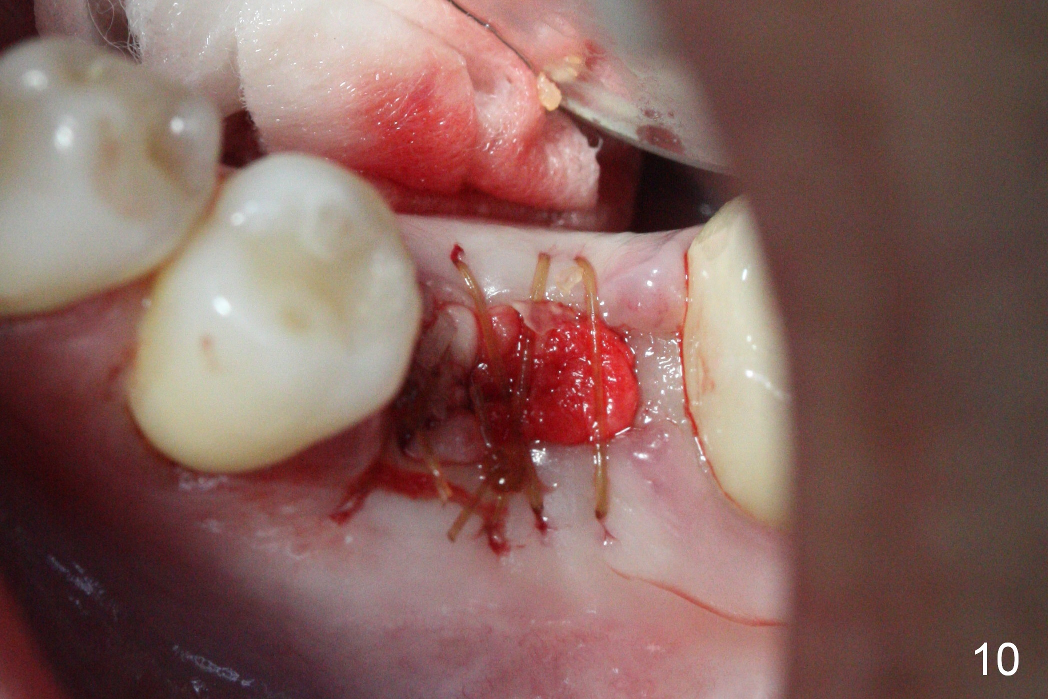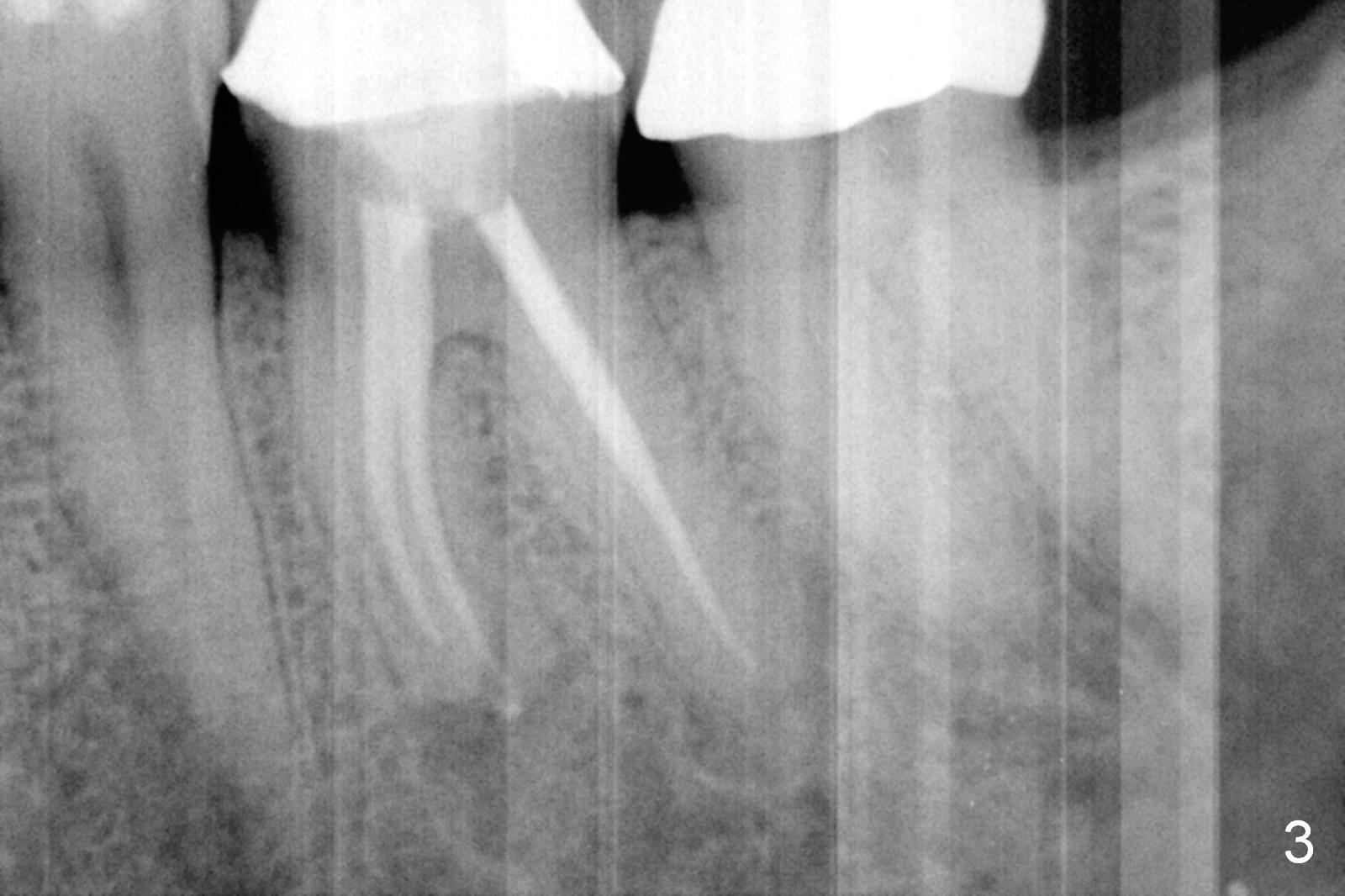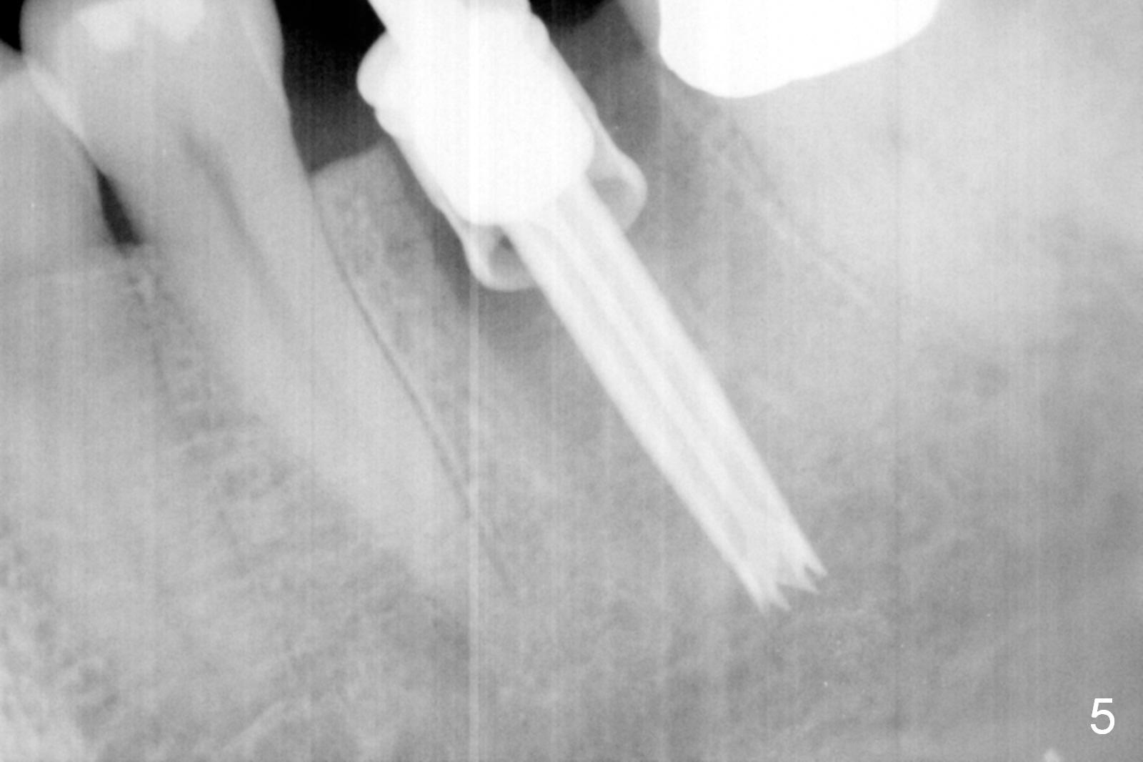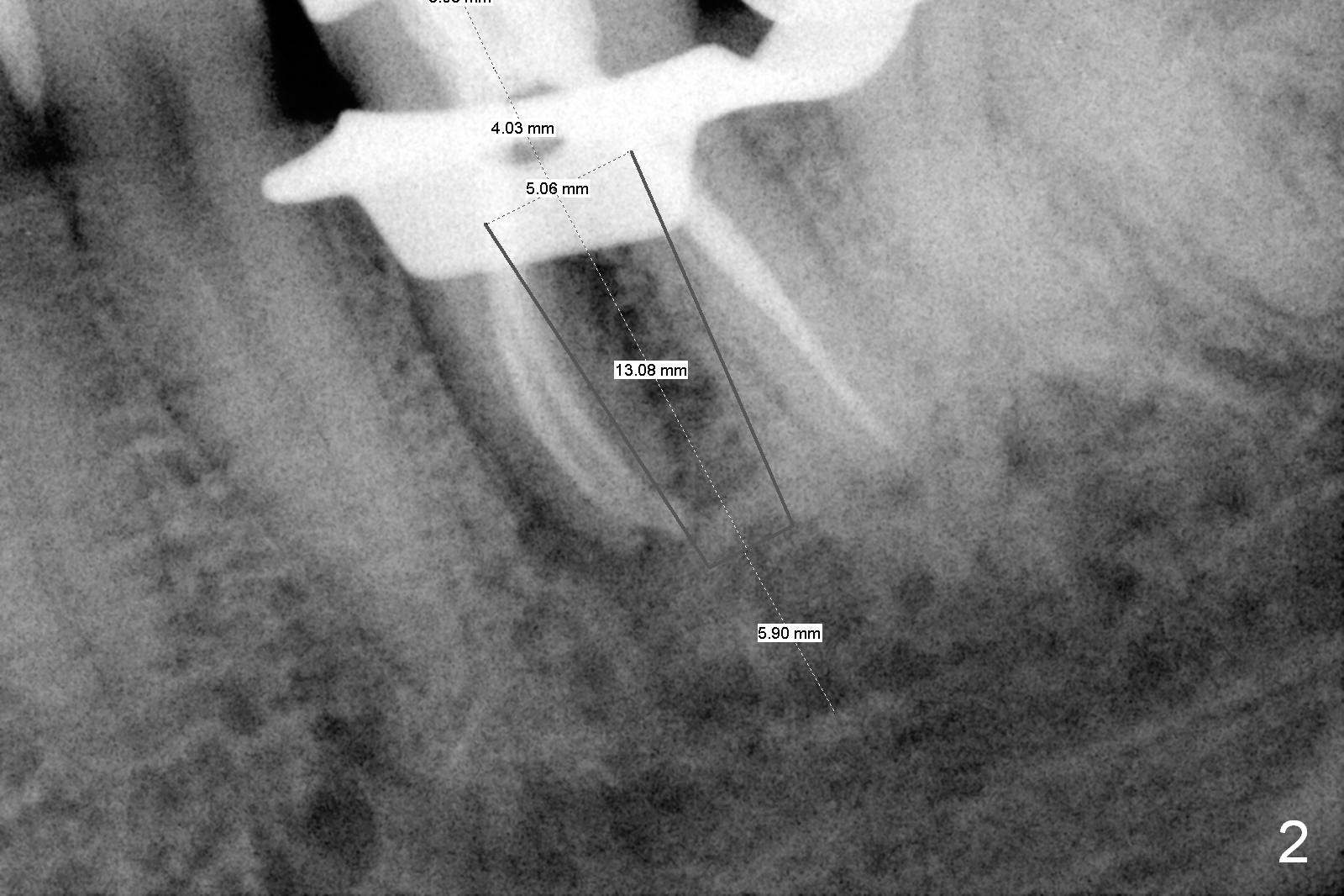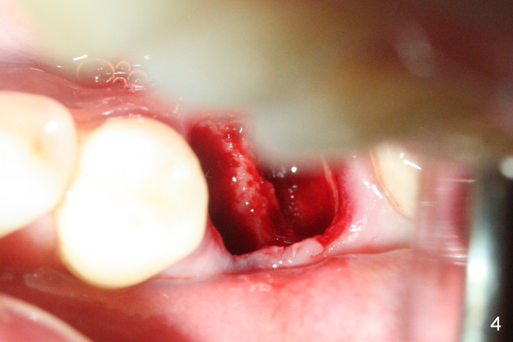 The tooth #19 is easy to get loose, but it cannot be luxated.  After sectioning and extraction (Clindamycin), the septum is found to be thin (Fig.4).  A surgical fissure bur is used to initiate osteotomy, followed by 1.6 mm pilot drill.  It is difficult to use Marking bur (wobbling over the basically pointed septum).  It is impossible to use 4.3 mm Magic Drill (MD, one drill system), since it jumps.  The smallest MD has to be used (2.8 mm).  When the next drill (3.3 mm) is being used for 13 mm with stopper (Fig.5), the patient experiences transient pain.  The depth is suggested from the design in Fig.2.  The thin septum appears not to be a reliable landmark.  When block anesthesia is administered, the initial depth should be shortened.  The drill appears to be close to the Inferior Alveolar Canal (Fig.5).  Then the depth changes to 11 mm with the following drills (3.8 and 4.3).  The mesial and distal walls of the septum are gradually perforated.  A 5x9 mm dummy implant is placed only after using 4.8 mm drill (Fig.6).  The implant appears to be short.  When a longer implant is placed (5x11 mm), it does not easily enter the osteotomy, either sliding into the mesial or distal socket with the implant separating from the implant driver.  It appears that a premount implant is appropriate in this situation.  When the 5x11 mm implant is finally seated with stability, it is 6 mm apical to the gingival margin.  The longest cuff of IBS abutment is 4 mm.  A longer implant is needed (Fig.7, 5x13 mm).  Placement is not easy as mentioned above.  Insertion torque is <20 Ncm when the patient experience a little discomfort.  A 6.5x4(4) mm pair abutment is placed (A), apparently proper for restoration.  Allograft is placed (Fig.8 *) prior to immediate provisional.  The patient complains of bad smell from the site 24 days postop.  When the provisional is removed, the abutment is found to be mobile.  When the latter is removed with local anesthesia, bone graft granules are attached to the socket above the lightly mobile implant (Fig.9).  In fact the latter appears to be stable after a few turns by finger.  A healing screw is placed; the socket is closed with collagen plug and 4-0 Chromic gut sutures (Fig.10).  It appears that a larger implant should have been used to achieve higher torque.  Two months later (3 months postop), the coronal end of the implant is partially exposed.  A 5x4 mm healing abutment is placed.  It appears that the implant is stable.  The implant appears to have osteointegrated 4 months postop (Fig.11).  Impression is taken.