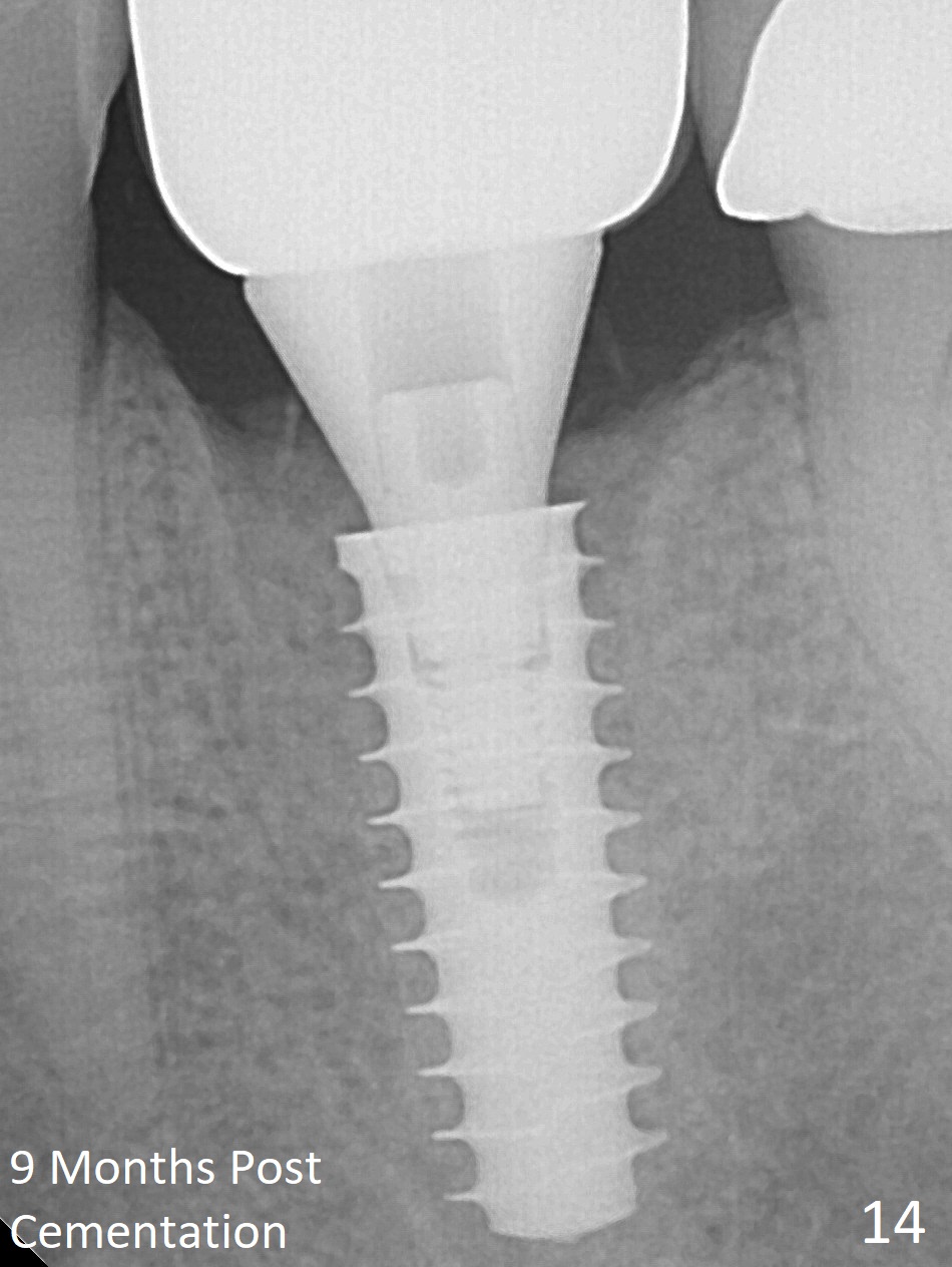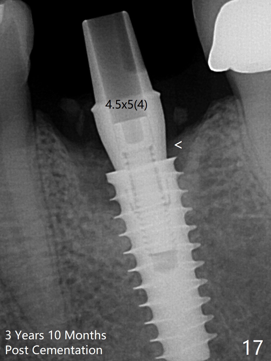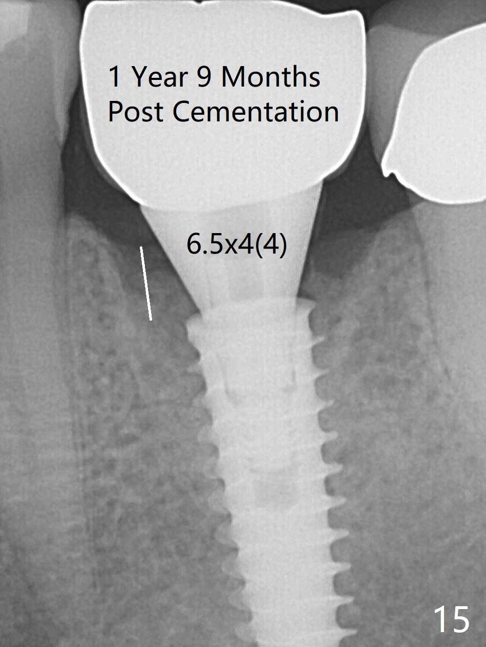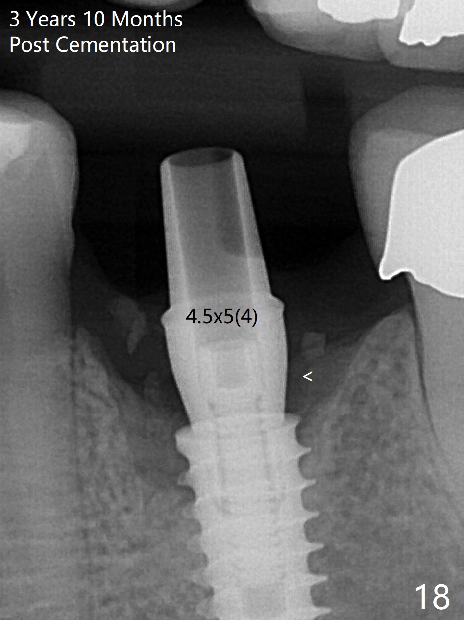 The gingiva looks healthy 8 months postop (3 months post cementation (after abutment screw retightening and addition of porcelain to proximal surfaces, Fig.12).  New bone has apparently covered the implant plateau (Fig.13 arrows). Bone density between threads increases 9 months post cementation (Fig.14).  There is 2 mm bone superior to the implant plateau mesial and distal 1 year 9 months post cementation (Fig.15,16).  The crown/abutment is loose 3 times (3 months (Fig.14), 11 months (between Fig.14 and 15) and 2 years 3 months post cementation).  In spite of being stable 3 years 10 months post cementation, a smaller abutment is placed (Fig.17 (PA), 18 (BW)) with impression for a new crown.  After intraoral cementation, the new crown/abutment is removed for residual cement removal.  When the complex is reseated, it is not smooth, probably due to proximal undercut.  Fortunately the abutment appears to be completely seated, followed by 20 Ncm torque (Fig.19).