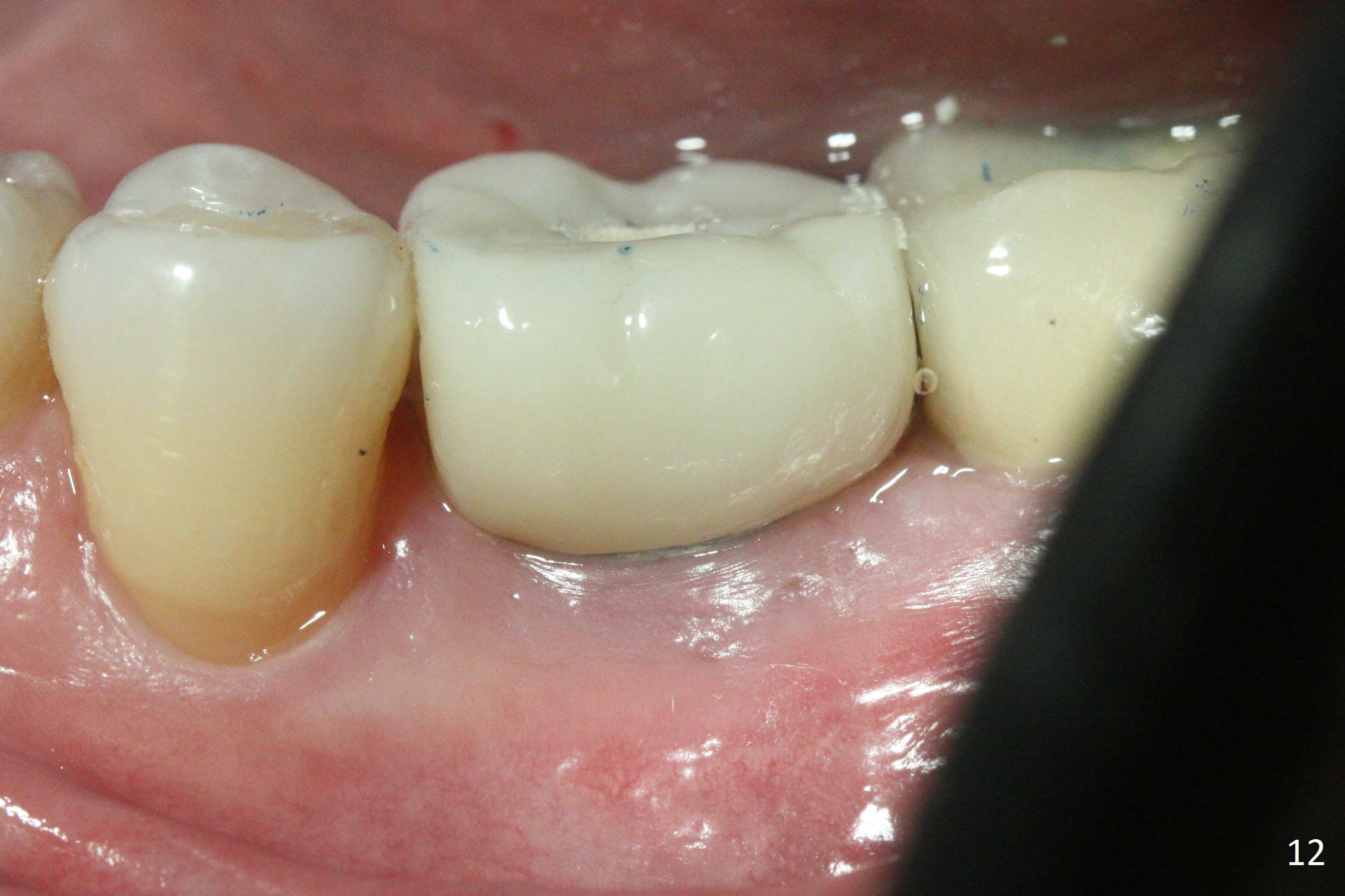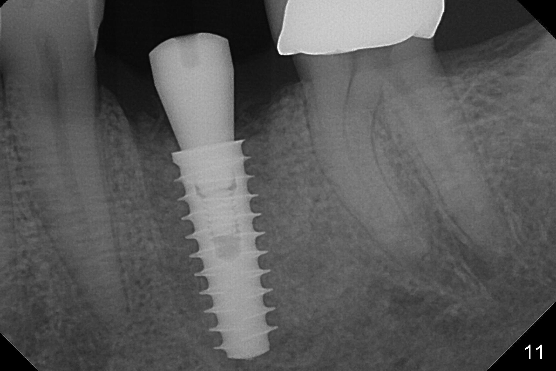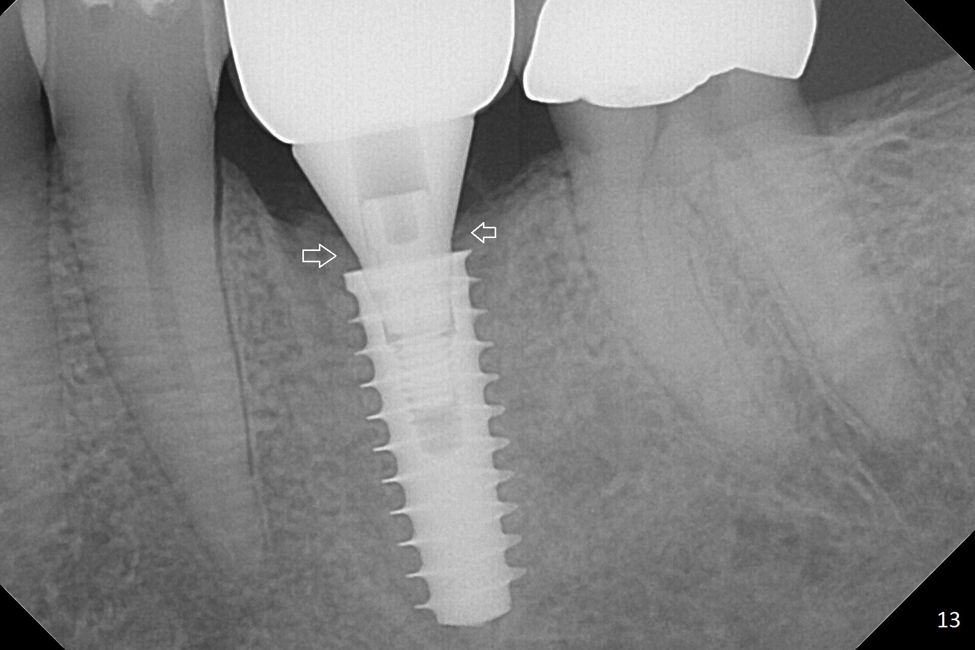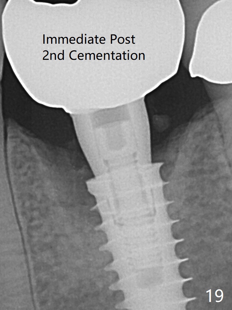 The gingiva looks healthy 8 months postop (3 months post cementation (after abutment screw retightening and addition of porcelain to proximal surfaces, Fig.12).  New bone has apparently covered the implant plateau (Fig.13 arrows). Bone density between threads increases 9 months post cementation (Fig.14).  There is 2 mm bone superior to the implant plateau mesial and distal 1 year 9 months post cementation (Fig.15,16).  The crown/abutment is loose 3 times (3 months (Fig.14), 11 months (between Fig.14 and 15) and 2 years 3 months post cementation).  In spite of being stable 3 years 10 months post cementation, a smaller abutment is placed (Fig.17 (PA), 18 (BW)) with impression for a new crown.  After intraoral cementation, the new crown/abutment is removed for residual cement removal.  When the complex is reseated, it is not smooth, probably due to proximal undercut.  Fortunately the abutment appears to be completely seated, followed by 20 Ncm torque (Fig.19).