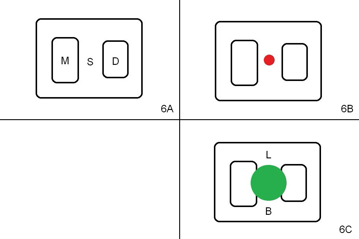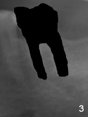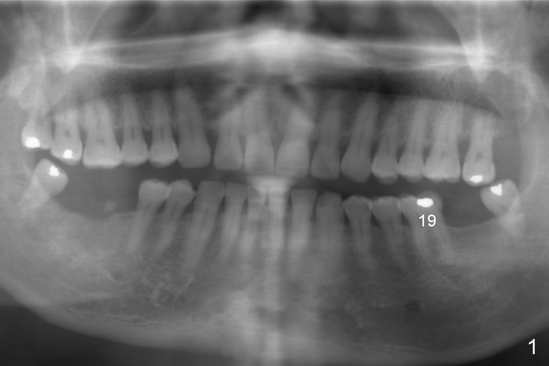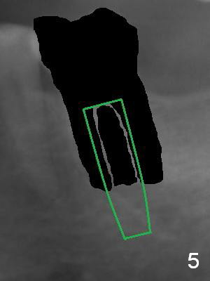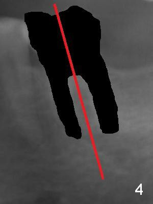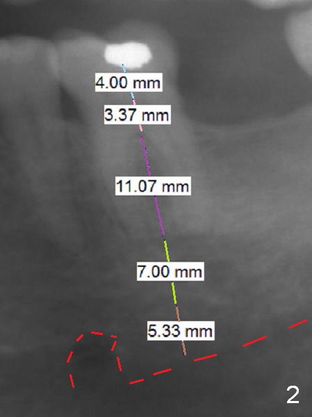 A 59-year-old man has cold sensitivity after chipping the distobuccal cusp of the tooth #19 (Fig.1 (panoramic X-ray taken 5 years ago). He is debating whether to save the tooth or not. If he chooses extraction and implant, the latter can be 18 mm (bone-level (11 (septum, purple in color)+7 (apical, green) mm), Fig.2). If the implant perforates the septum, it will achieve primary stability in the apical bone (the first of 3 fixation points). There is ~5 mm clearance (brown) from the Inferior Alveolar Canal (red dashed line). The cuff of the restorative abutment will be most likely 3 mm (pink), while the abutment is estimated to be 4 mm long (blue). After extraction (Fig.3, no Antibiotic), osteotomy will be initiated through the septum (Fig.4, 6B: red). When an implant is inserted, it may perforate the septum (Fig.5, 6C: green) into the mesial (Fig.6A: M) and distal (D) sockets. The remaining buccal (Fig.6C: B) and lingual (L) septal struts (the rest of two fixation points) contribute to implant stability.