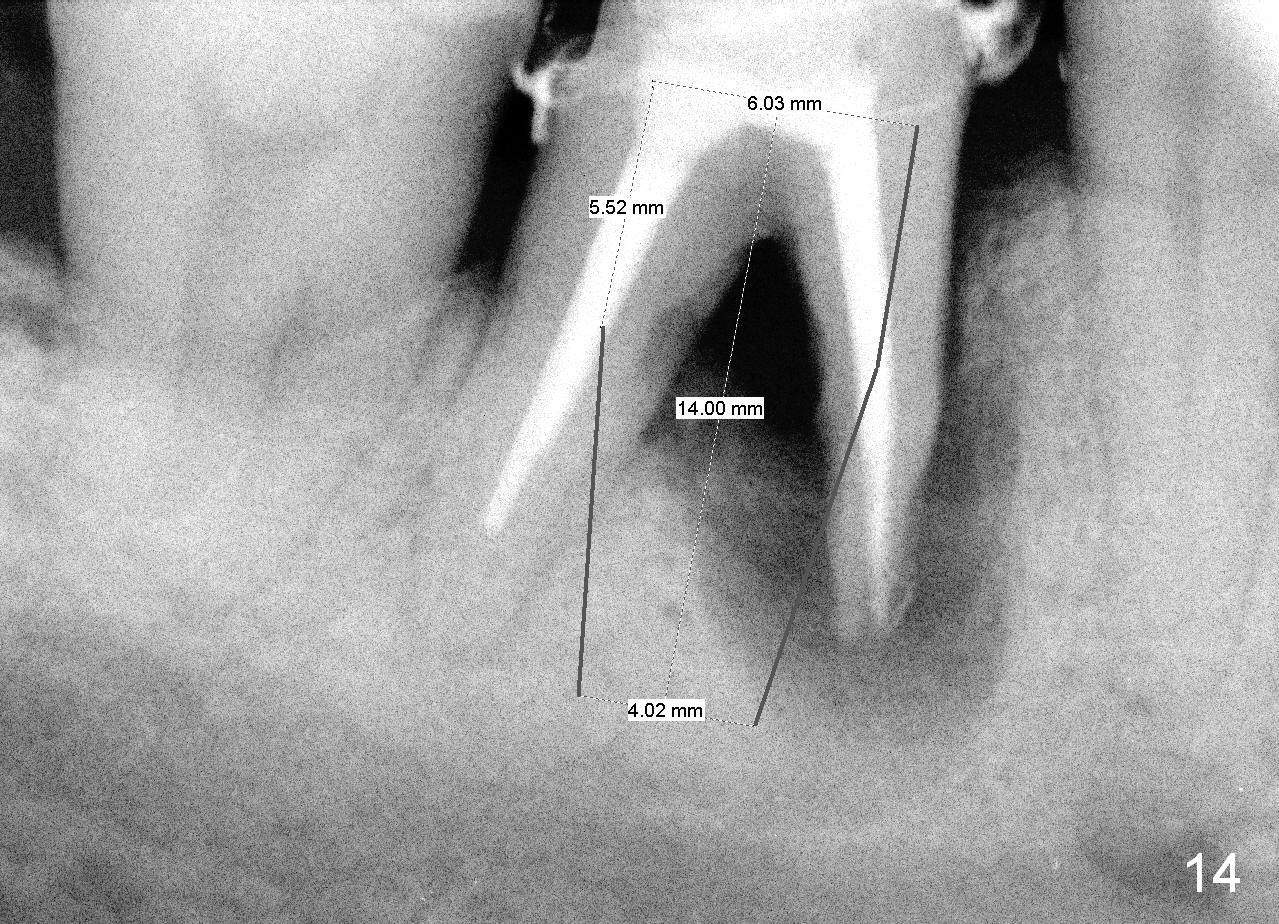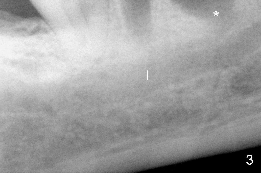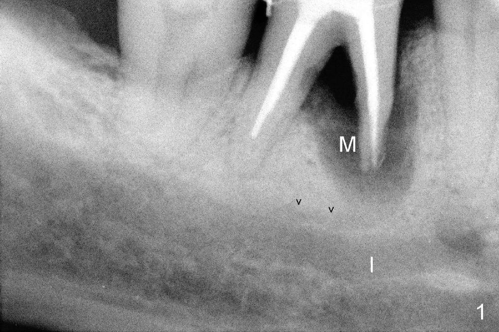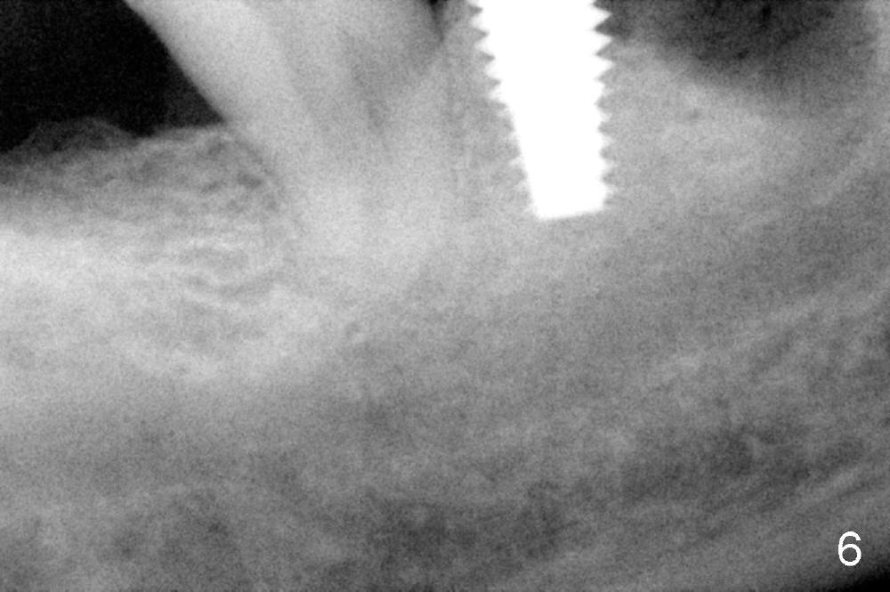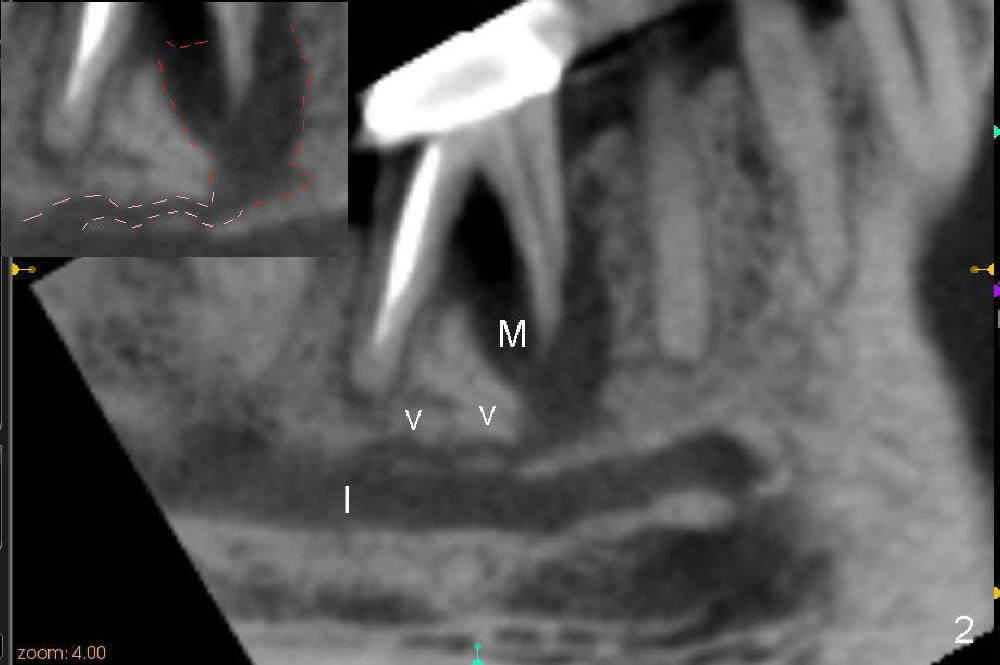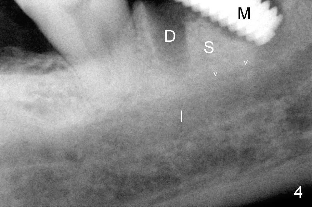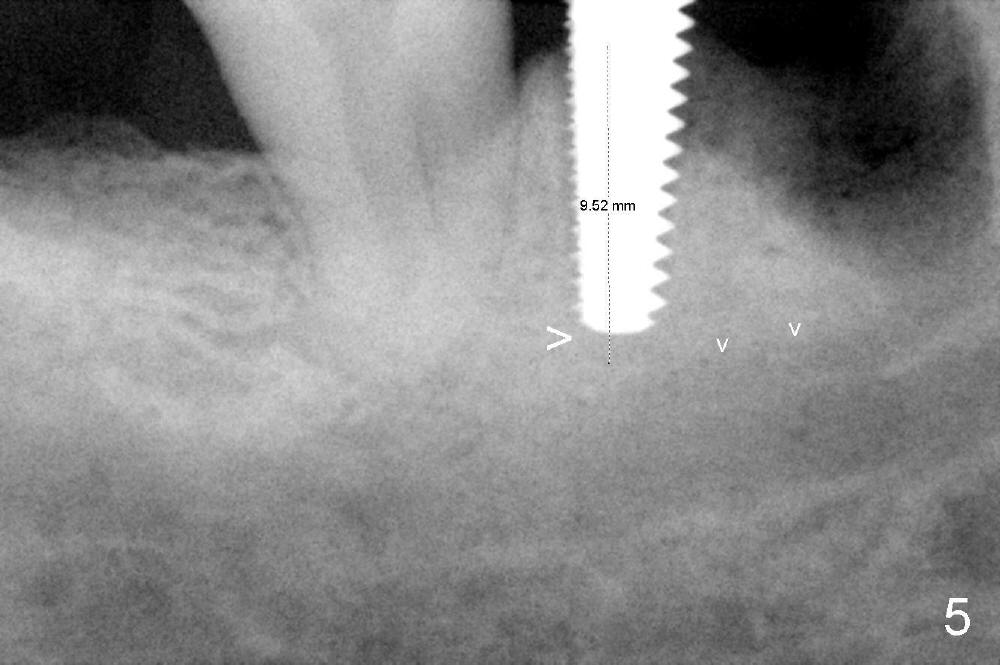 There are three potential spaces for the immediate implant: the mesial and distal sockets and the septum. First at all, the tooth should be extracted with curettage of granulation tissue from the mesial apical lesion. The latter turns out to be difficult, since the bottom of the mesial socket has abrupt transition into a narrow neck, which look and feels like the IAN. To determine the depth of the lesion relative to the IAN, PA is taken (Fig.3) without too much information. When a radiopaque material in placed in the mesial socket (Fig.4 M), the lesion has apparently not extended to the IAN. Curettage of the remaining granulation tissue is now an easy task. Finally bleeding comes from a small hole, as indicated by arrowhead. Therefore the special structure is a branch of the inferior alveolar vessels.
