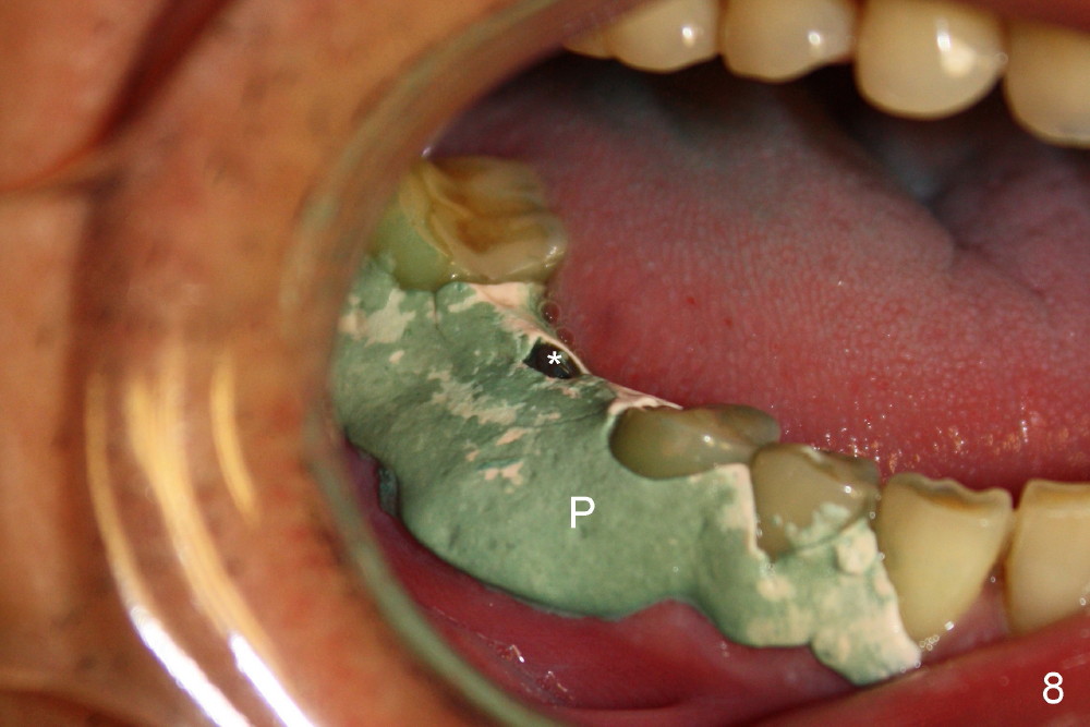 As to where to place an implant, we try to engage the largest tap (8 mm in diameter) into the mesial socket without binding. The buccal plate of the mesial socket is missing. It is risky to extend osteotomy in the mesial socket. Besides, the septum (Fig. 4 S) is not as tall as the distal socket (D). It appears that the distal socket is the safest place to place an implant. Furthermore, no drill is used for distal osteotomy. Instead two osteotomes (3.5x15 and 4x15 mm tapered osteotomes) are used to expand the distal socket with intention to push the septum mesially. Since the bone density is high, the osteotomes seem not to work as effectively as expected. Then a 4.5x17 mm tap is placed at the depth ~ 14 mm with stability (Fig.5). Finally a 5x14 mm tissue-level implant is placed with insertion torque >60 Ncm (Fig.6). Allograft is placed in the mesial socket and buccal aspect of the distal socket, followed by insertion of collagen plug and membrane (Fig.7). After insertion of an abutment (Fig.8 (taken 6 days postop) *), perio dressing (P) is applied to cover the wound. There is no postop paresthesia.