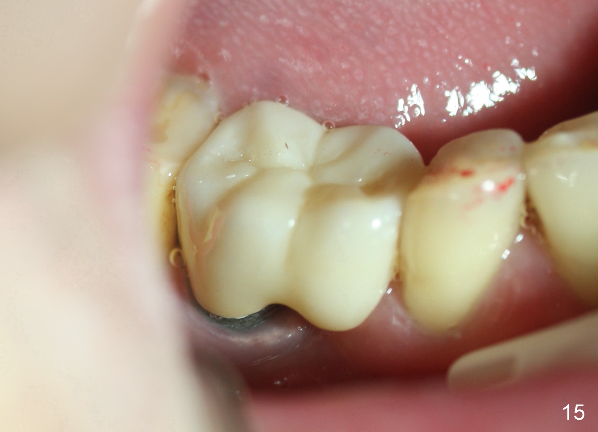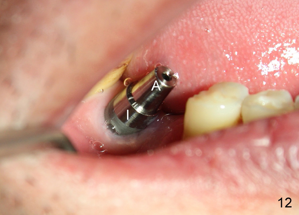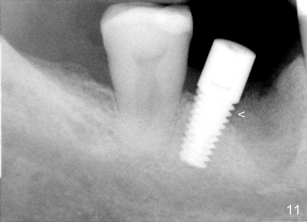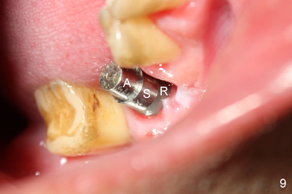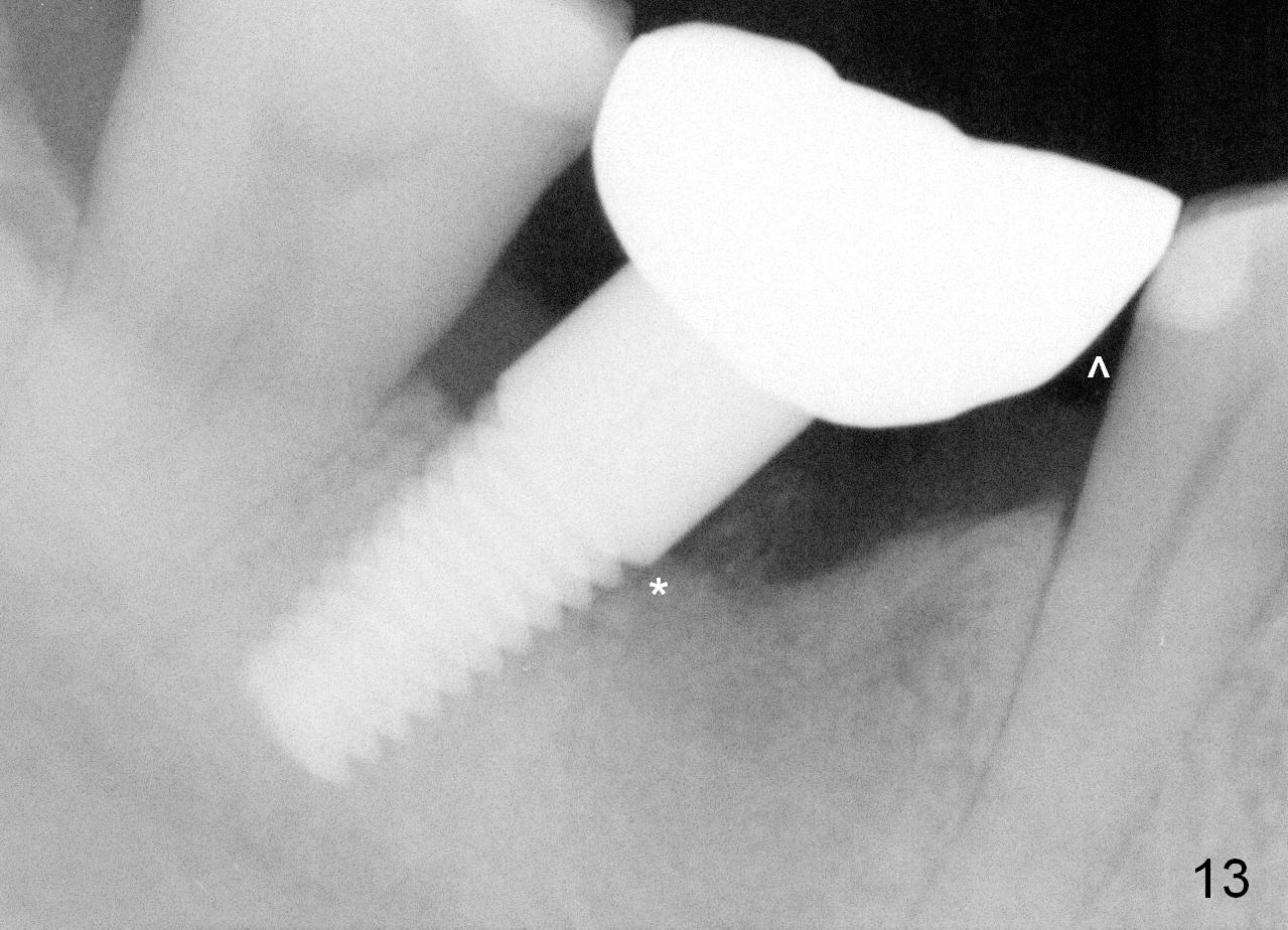 When the perio dressing is removed in office 24 days postop (Fig.9), the rough surface of the implant (R) is exposed buccally. Normally the smooth surface should contact the gingiva (S). Lingually implant/gingiva position is within normal limit (Fig.10). The patient returns for restoration 4 months postop (Fig.11,12). There is bone formation in the mesial socket and new bone appears to have grown toward the implant (Fig.11 <). A straight abutment appears to be in the middle of the edentulous space (Fig.12 A). But it is difficult to seat the crown. Three months post cementation, the patient complains of food impaction mesially (Fig.10 ^), although bone density continues to increase in the mesial socket and there is no mesial coronal thread exposure (*). Retrospectively the implant should be tried to be placed in the septum as much as possible to have a favorable restorative axis (Fig.14). The crown is re-fabricated with larger mesial contact area. It is temporarily cemented because of slightly loose distal contact (Fig.15). A few days later, the patient requests permanent cementation, because although the distal contact is loose, it is easy to remove food. Mesial food impaction is less likely, but it is more difficult to be removed.