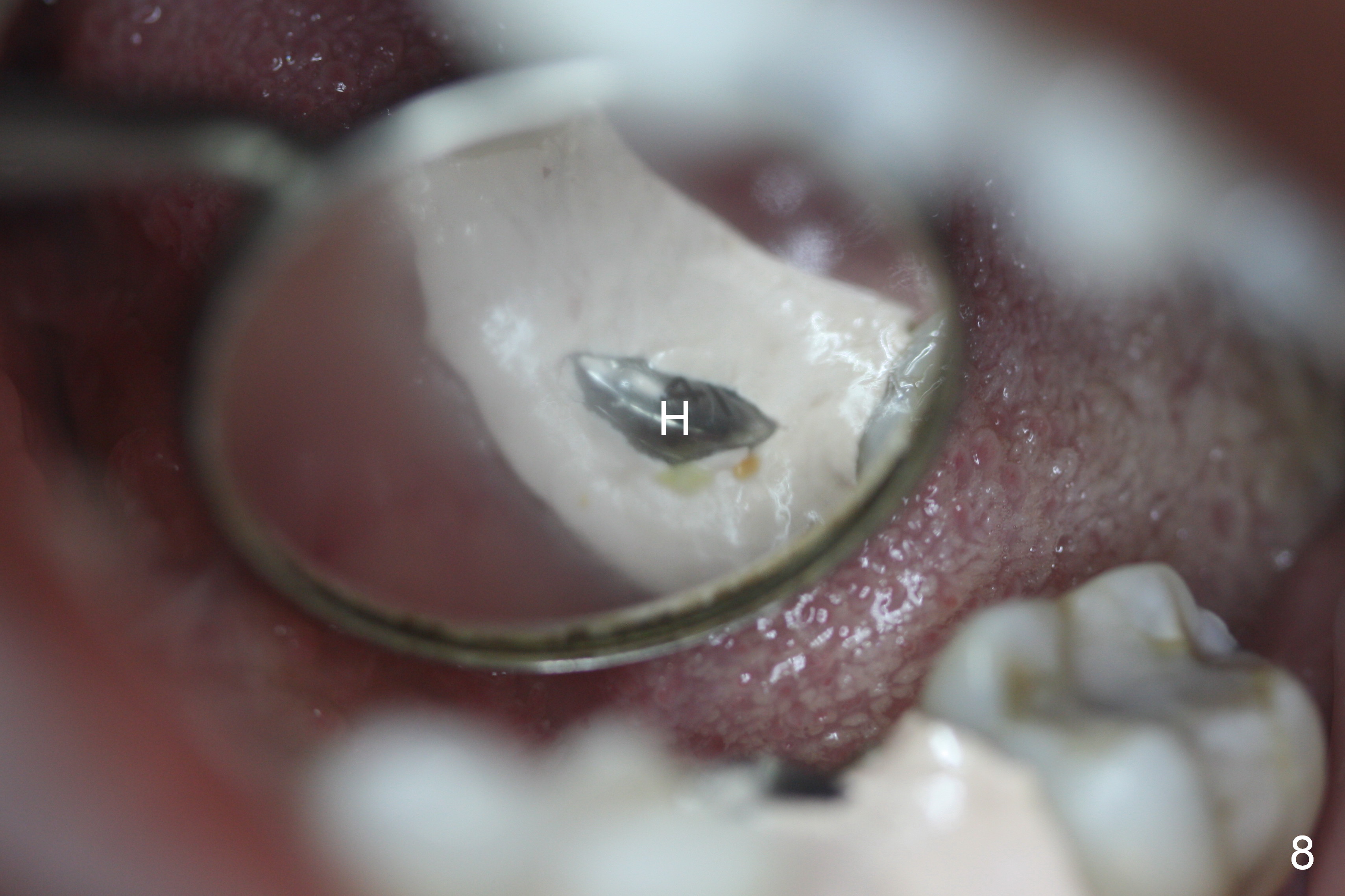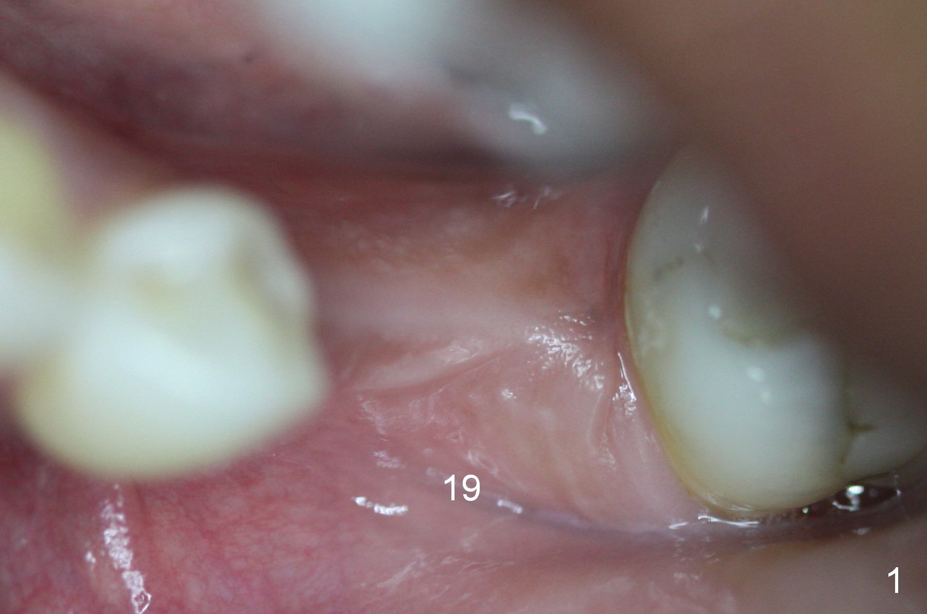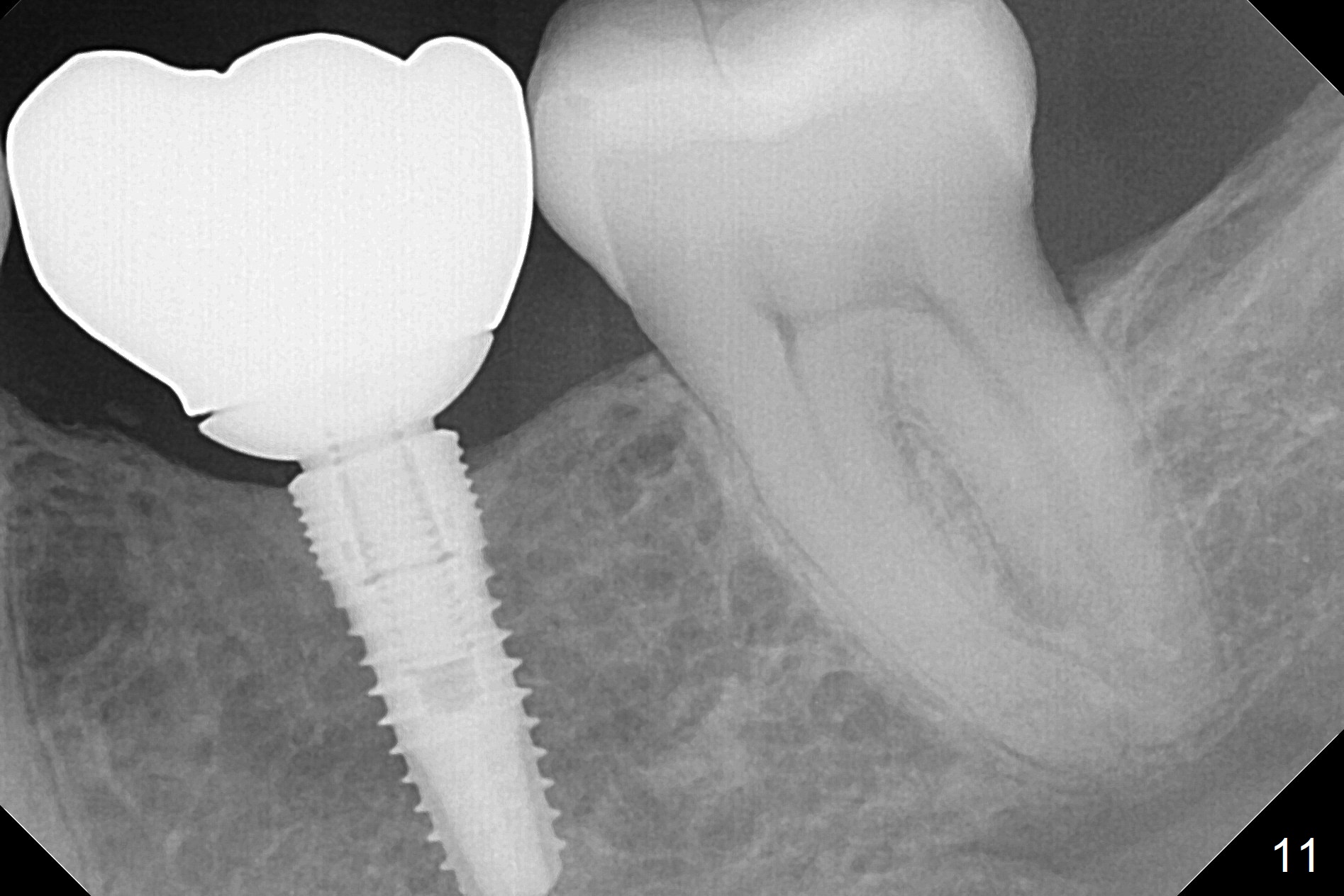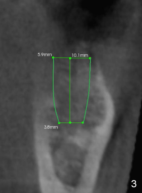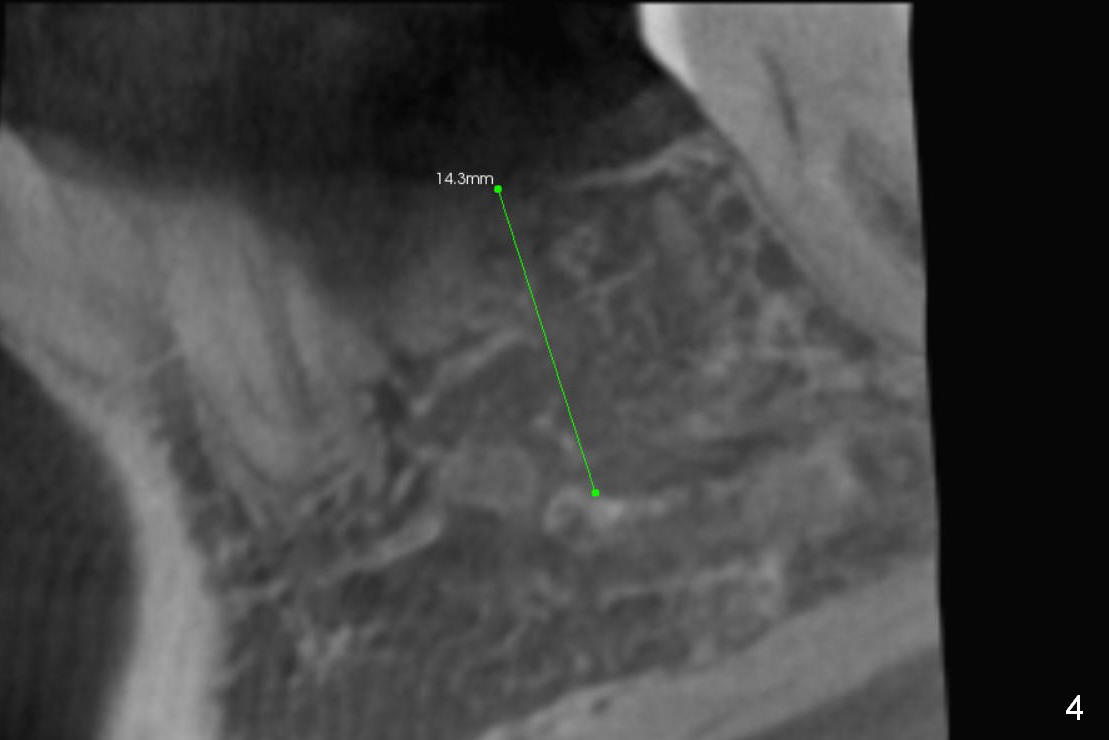 A 44-year-old black lady is a typical dental phobic. She has lost #19 for years with history of traumatic extraction. The ridge is atrophic (Fig.1). She is not comfortable with intraoral X-ray. So CBCT is taken. The coronal section shows that the bone density is low in the coronal ridge (Fig.2 arrowheads). It is difficult to determine the buccolingual width at crest; probably a 5.9x10 mm implant is appropriate (Fig.3). The most useful information from CT is height determination for the implant (Fig.4). The initial osteotomy depth is 10 mm (Fig.5); there is a large safety margin. There is a 2 mm clearance when a 4.5x12 mm implant is placed (Fig.6). Incision is sutured; a 8x4 (3) mm healing abutment is placed (Fig.7 arrowhead), followed by application of perio dressing. The latter remains stable 13 days postop thanks to the holding effect of the healing abutment (Fig.8 H). The wound has apparently healed when the dressing is removed (Fig.9). It appears that the edentulous space is extremely wide. The 4.5 mm implant may not sustain masticatory force. Limited orthodontic treatment appears to be necessary, using the implant as an anchorage to move the neighboring teeth (Fig.10 arrows). In fact the orthodontic treatment is not rendered. A crown is cemented 14 months postop. The cortical bone is thickened around the implant 15 months post cementation (Fig.11).