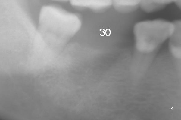 A 52-year-old lady has lost #30 for several years, but the socket outline persists with low bone density (Fig.1 (trimmed from panoramus),2). Osteotomy should be underprep. Bone height allows to placement of a 14 mm implant (Fig.3). Still initial depth will be 12 mm.
