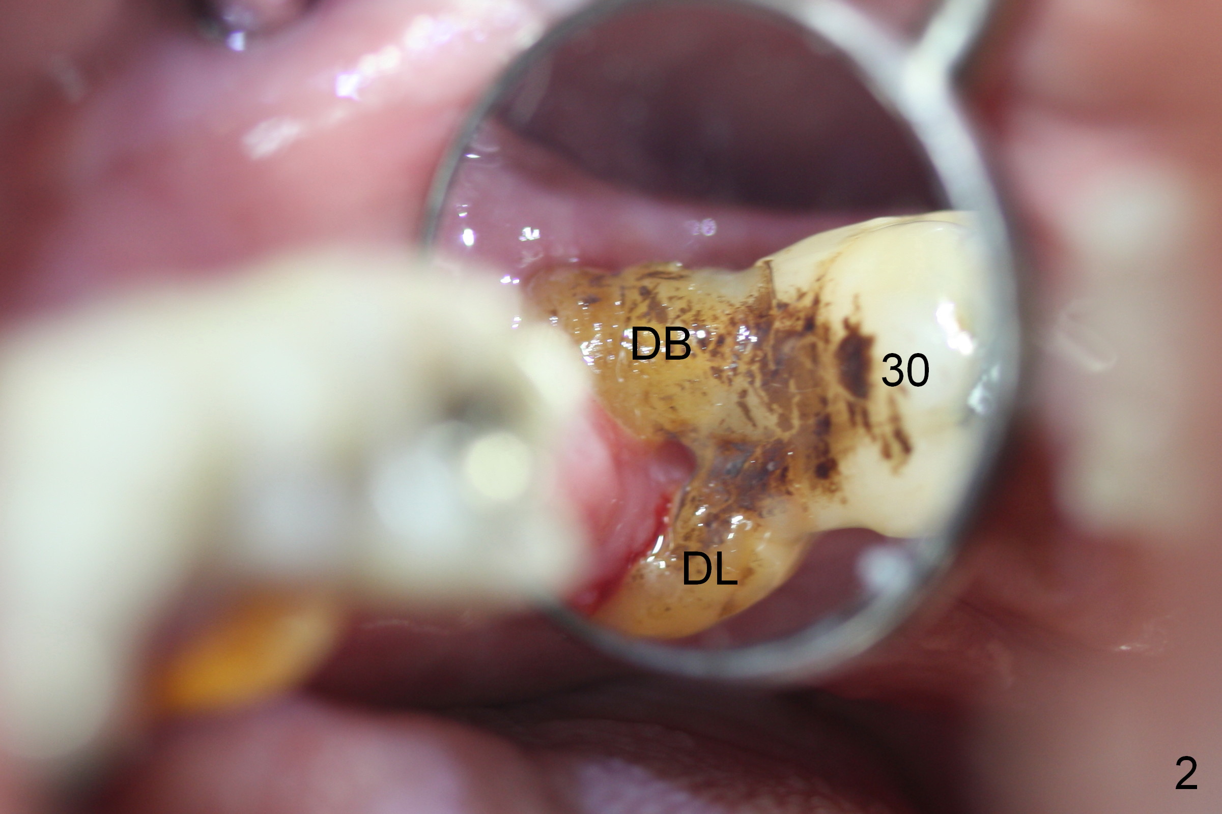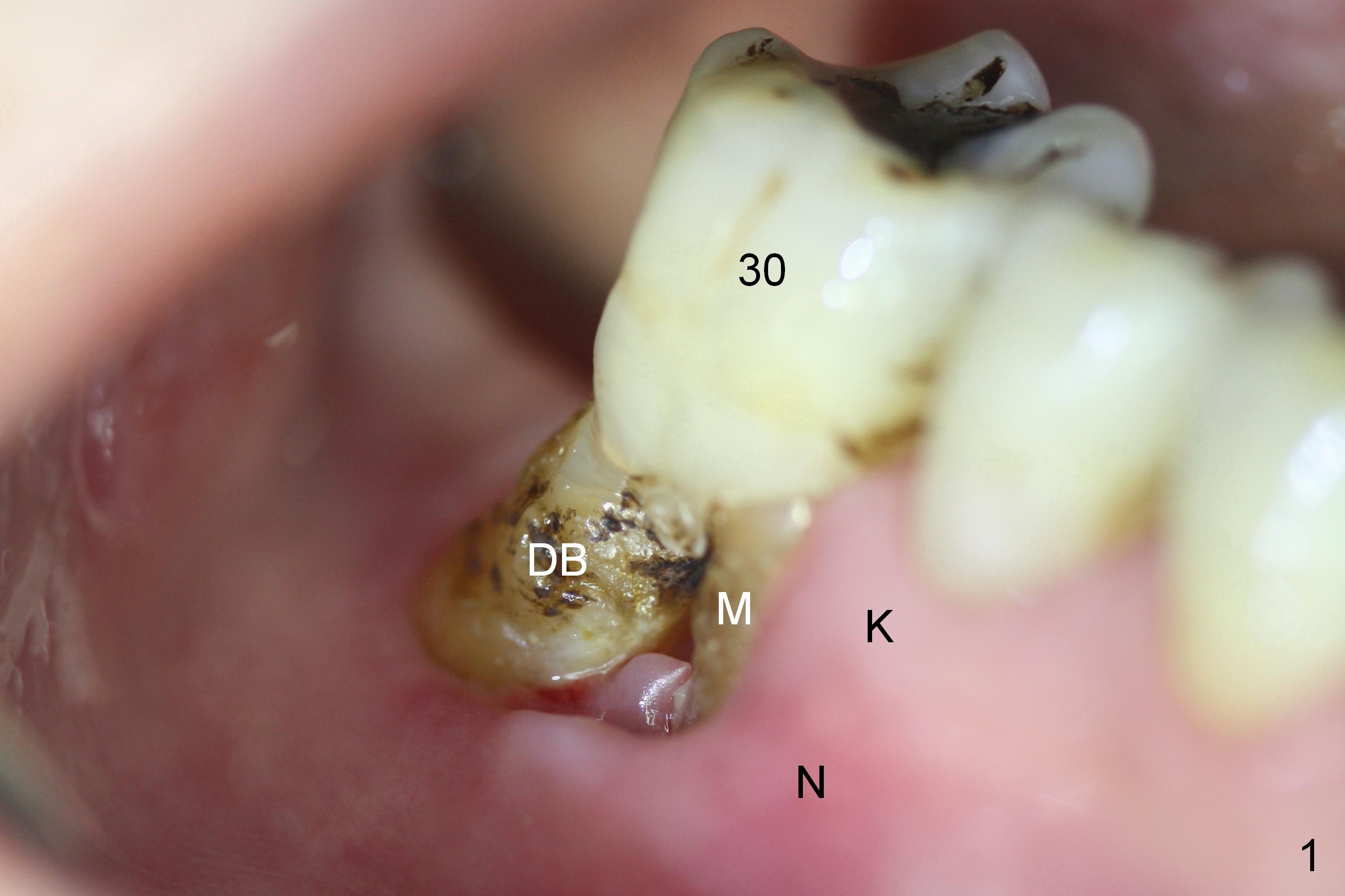 A 74-year-old man requests the 5th implant placement at #30. He feels that immediate implant (1,2) is associated with less pain than delayed one. He is looking forward the immediate implant at #30. This tooth has severe gingival recession (Fig.1,2): the mesial (M), distobuccal (DB) and distolingual (DL) roots having been exposed. The socket with the tripod septum will be treated with Metronidazole, randomly selected by case sequence. One of challenges to implant placement is to handle keratinized (K) and non-keratinized (N) gingival tissues. After tooth removal and infection resolution, it is expected that some of non-keratinized tissue can be converted to the keratinized one to promote health of the implant. Fabricate a tightly fit immediate provisional to cover the irregularly-shaped socket. Use a nonresorbable membrane where the provisional is unable to cover the socket. Preop PA is to be taken for design. Bone height should be limited.
