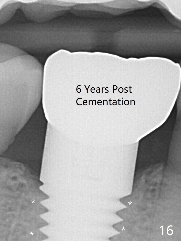 Fig.7: When 7x17 mm implant is placed with > 60 Ncm, the mesial socket is obliterated while the density of the distal one increases because of autogenous bone grafting (*). The apical threads of the implant have engaged into the mesial wall of the socket for primary stability (<). Cortex-like bone seems to have grown into the mesiocoronal thread spaces 3 years post cementation (Fig.13 <). The bone next to the implant is dense 6 years post cementation (Fig.16 *).