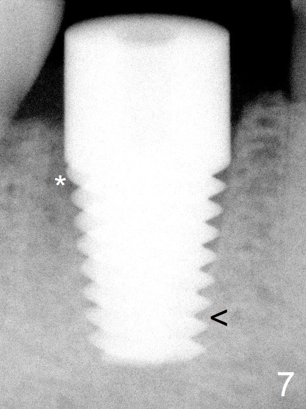Fig.7: When 7x17 mm implant is placed with > 60 Ncm, the mesial socket is obliterated while the density of the distal one increases because of autogenous bone grafting (*). The apical threads of the implant have engaged into the mesial wall of the socket for primary stability (<).