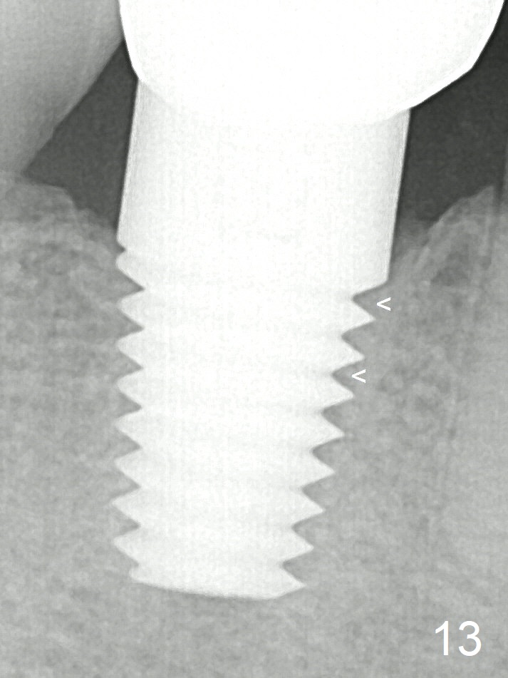 Cortex-like bone seems to have grown into the mesiocoronal thread spaces 3 years post cementation (Fig.13 <).