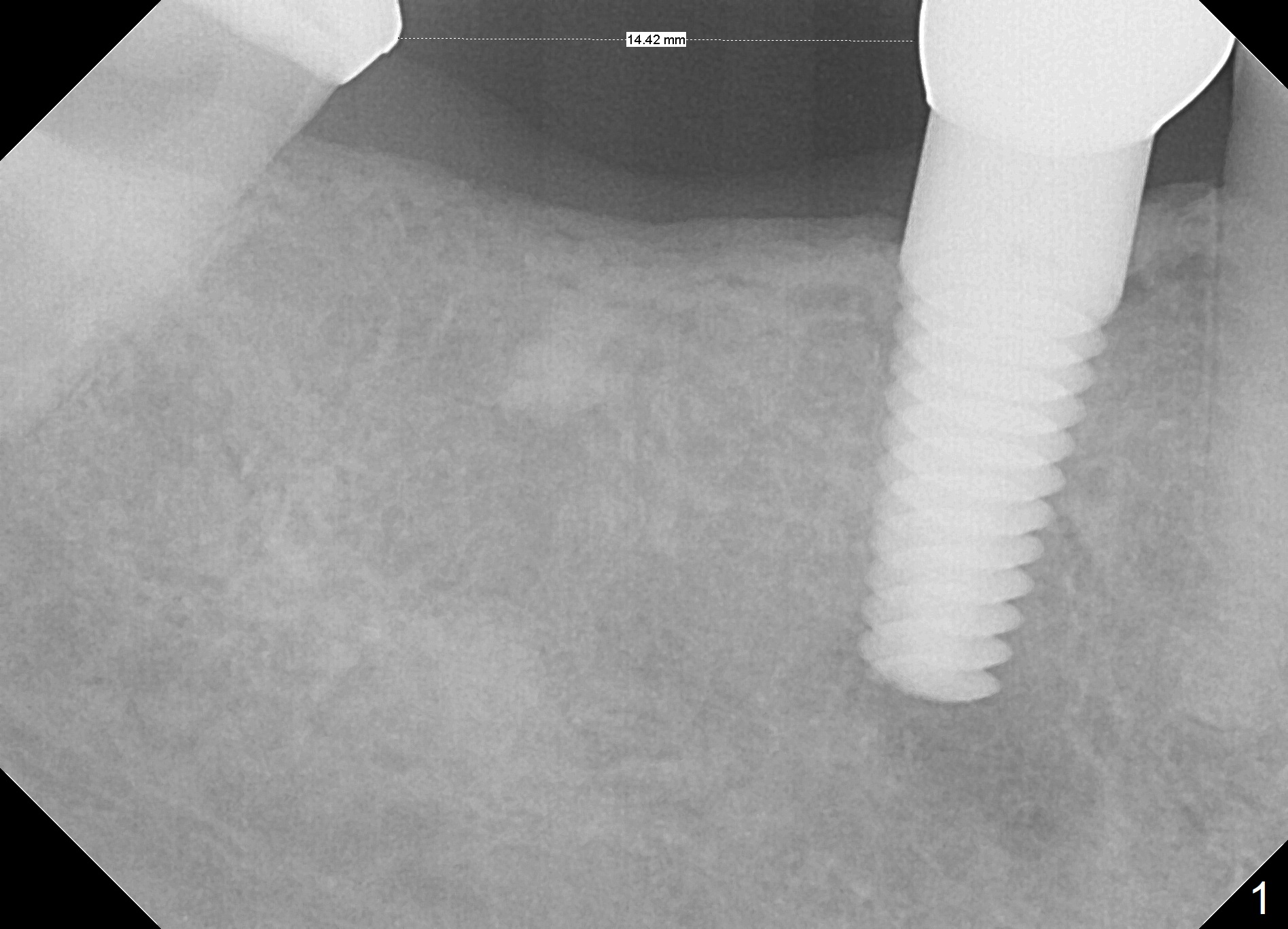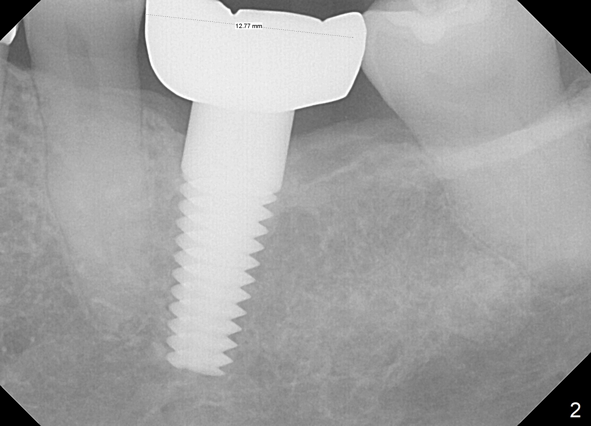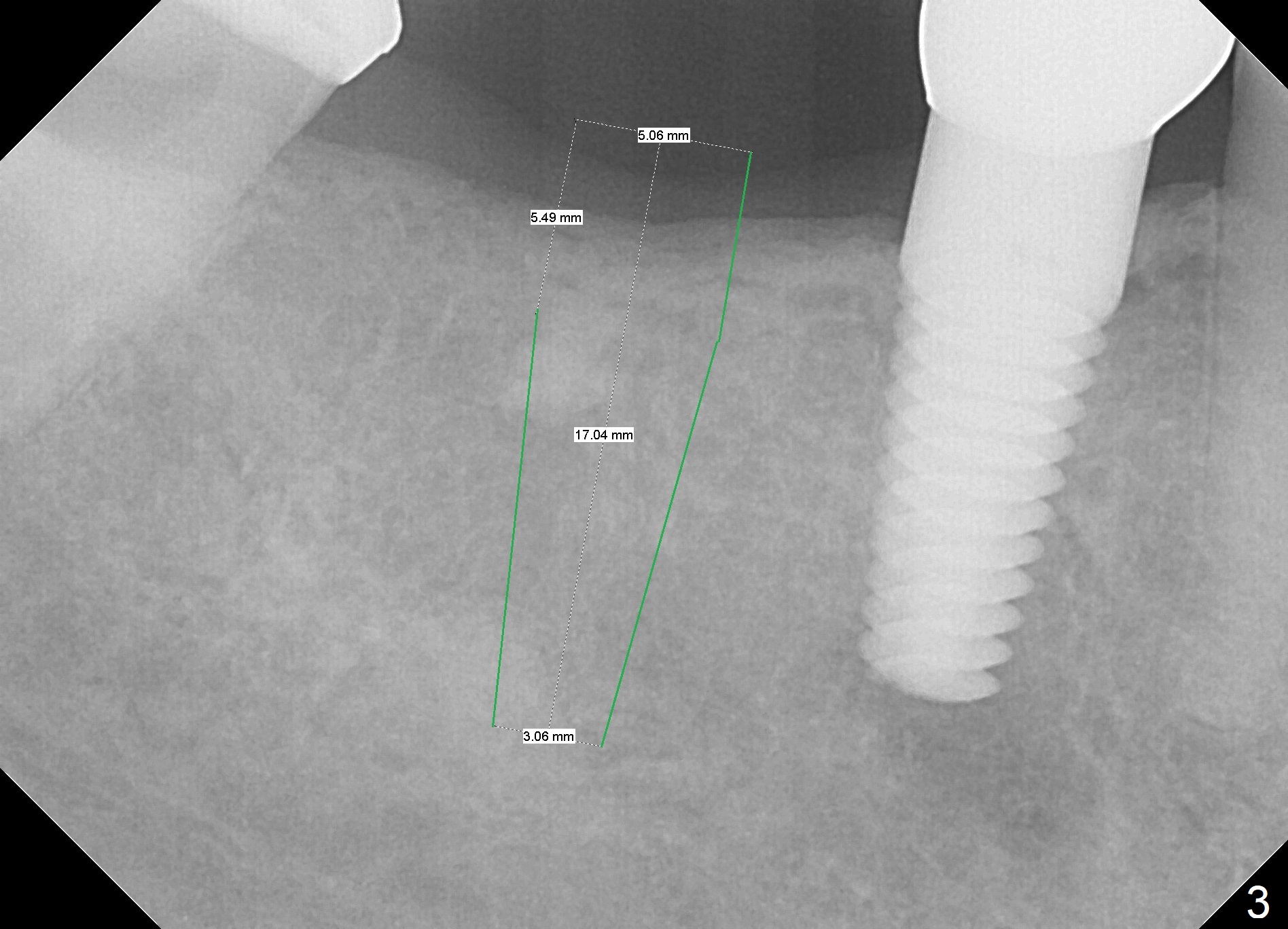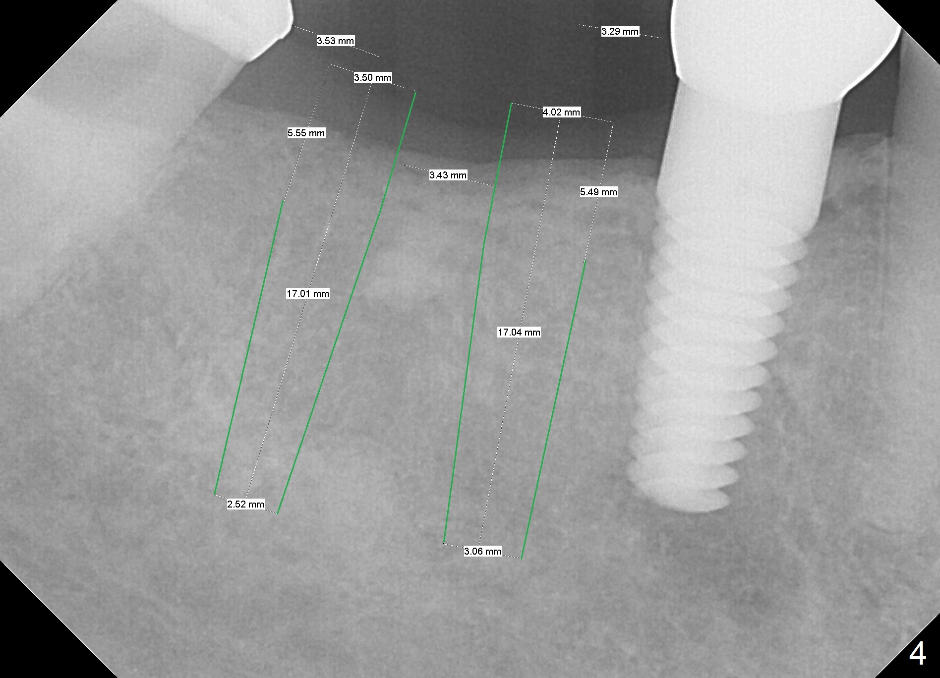 A 53-year-old woman returns for follow-up, requesting implant restoration at the sites of #30 and 31. The edentulous space is ~14 mm mesiodistally (Fig.1), whereas a 6x17 mm implant was placed at #19 with ~13 mm space (Fig.2). If the ridge at the LR molar region is wide enough buccolingually (3.5-5 mm Implant Positioners), place one implant (Fig.3, 4 mm Implant Spacer). Otherwise, two of them will be placed (Fig.4).